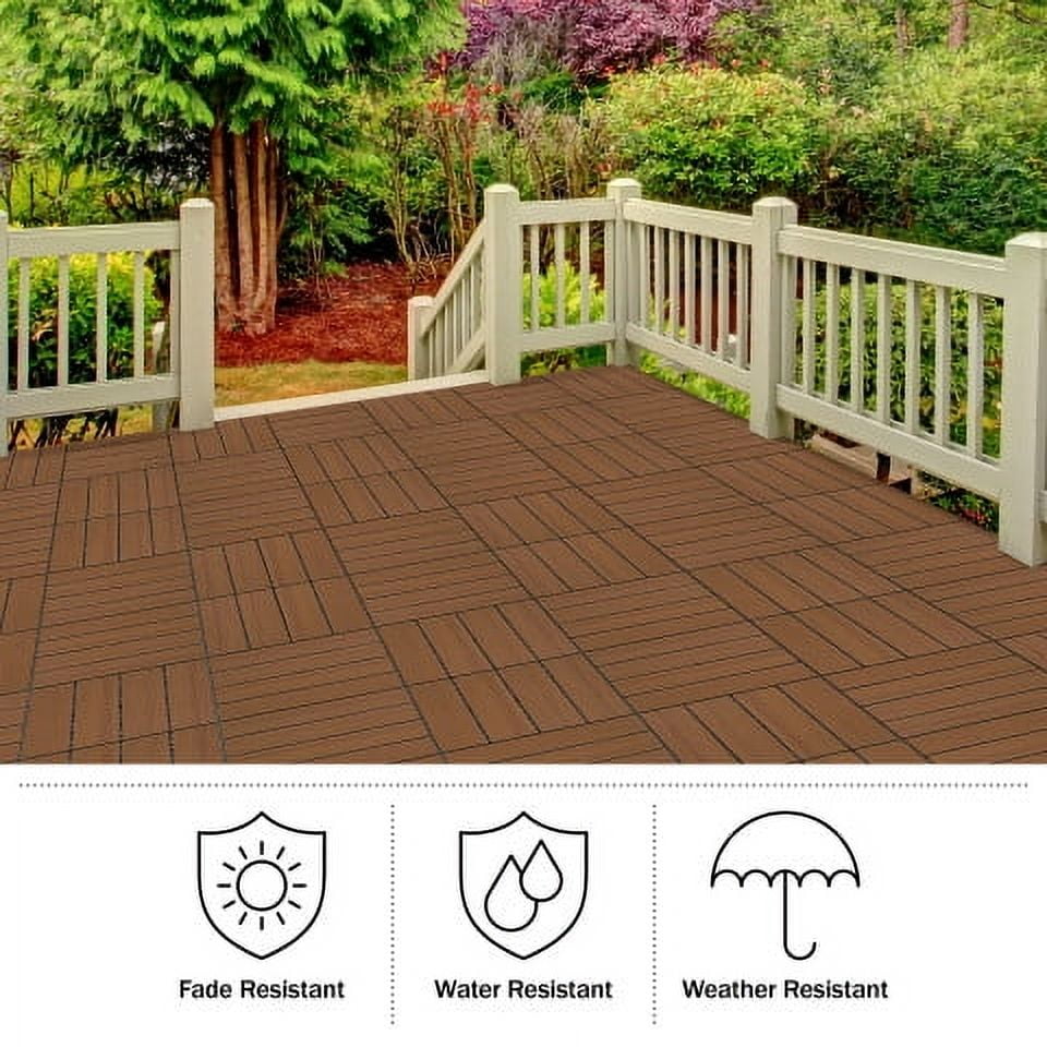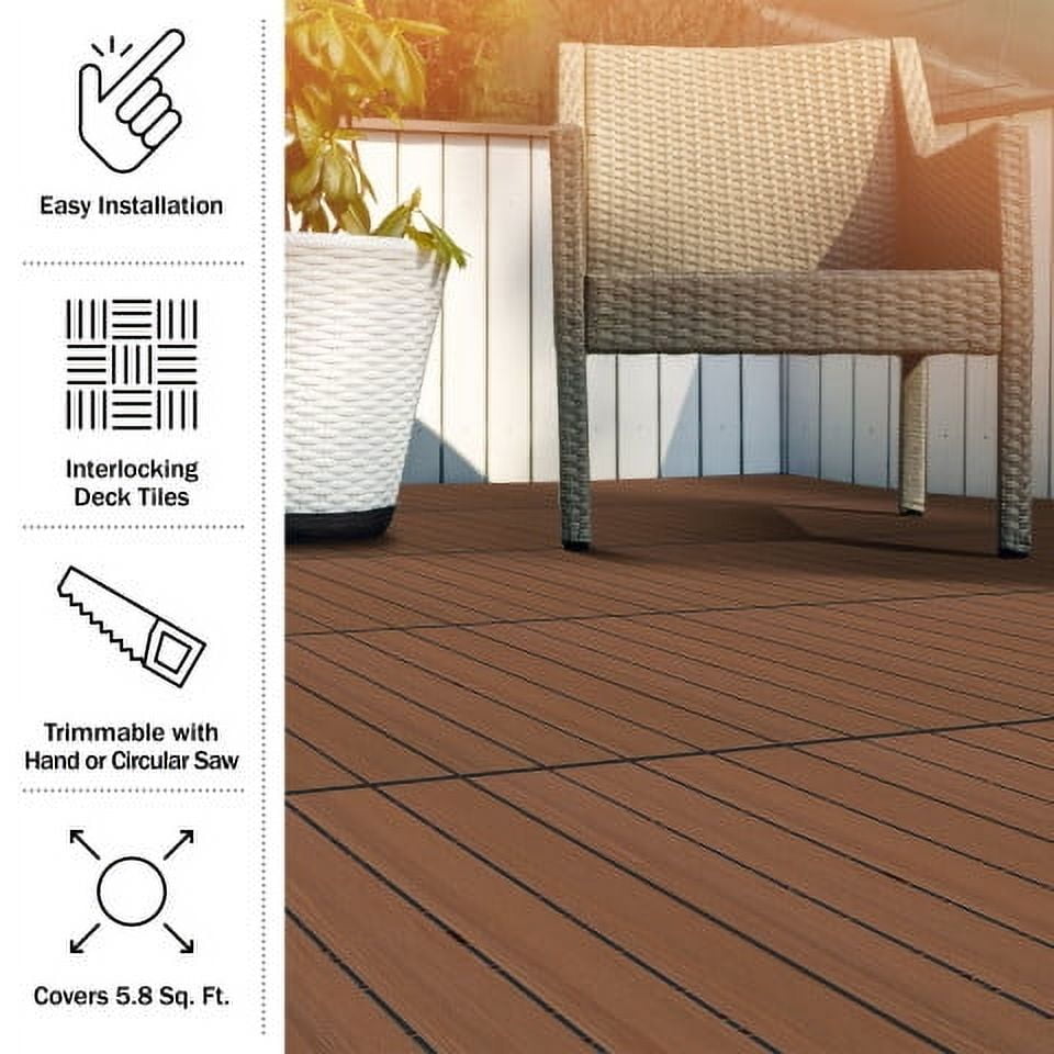 INTERLOCKING DECK TILES 6-PACK – The composite deck tiles are made from fade-resistant composite wood and plastic that allows airflow and drainage for enduring outdoor use. EASY INSTALLATION – These patio deck tiles snap together with no tools required, and can be trimmed to fit your space as needed. VERSATILE NONSLIP SURFACE – The woodgrain texture of the outdoor floor tiles increases friction to reduce slips, and the interlocking floor tiles can be used in stripe, check, or parquet patterns. COVERS 5.8 SQ FEET – Each patio flooring tile measures 11.63-inches, for a total coverage area of approximately 5.8-square-feet. MATERIALS – Composite Wood and PE Plastic. DIMENSIONS – Individual Tiles: (L) 11.63″ x (W) 11.63″ x (H) 0.88″; Coverage Area: 5.8-square-feet. COLOR – Brown Woodgrain with 4-Stripe Slat Pattern