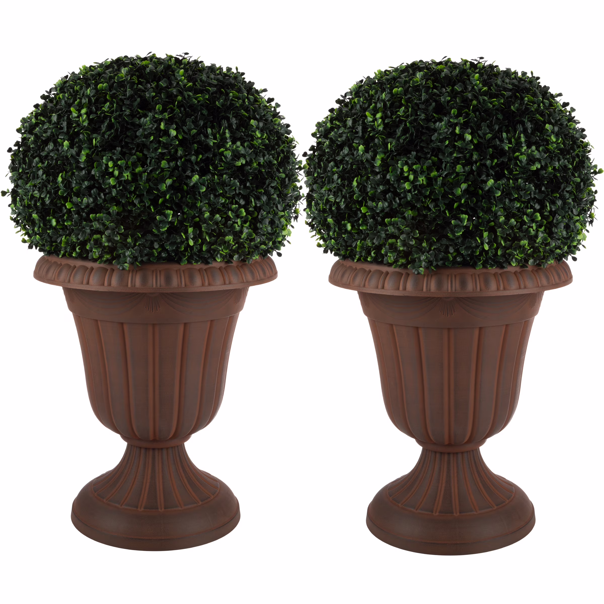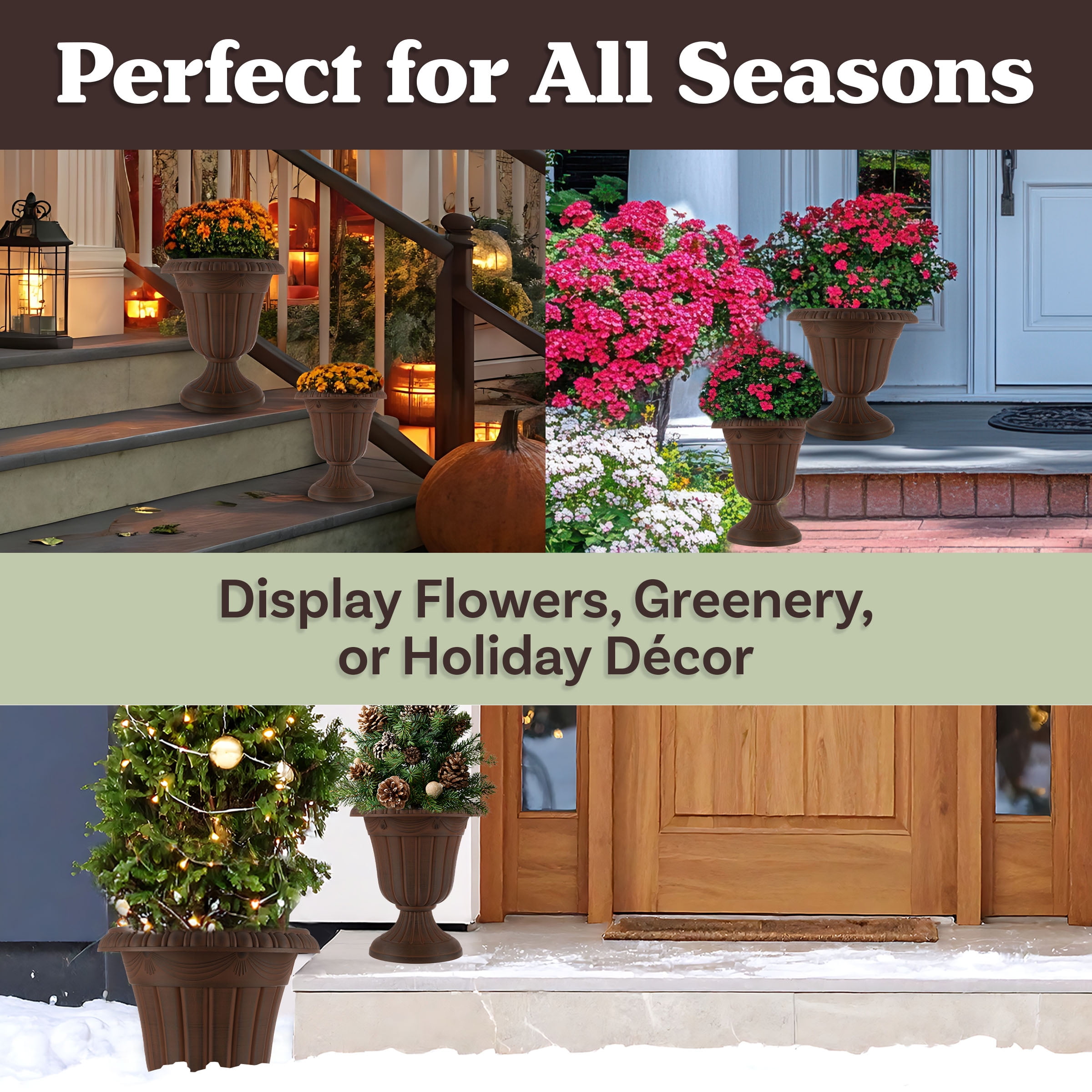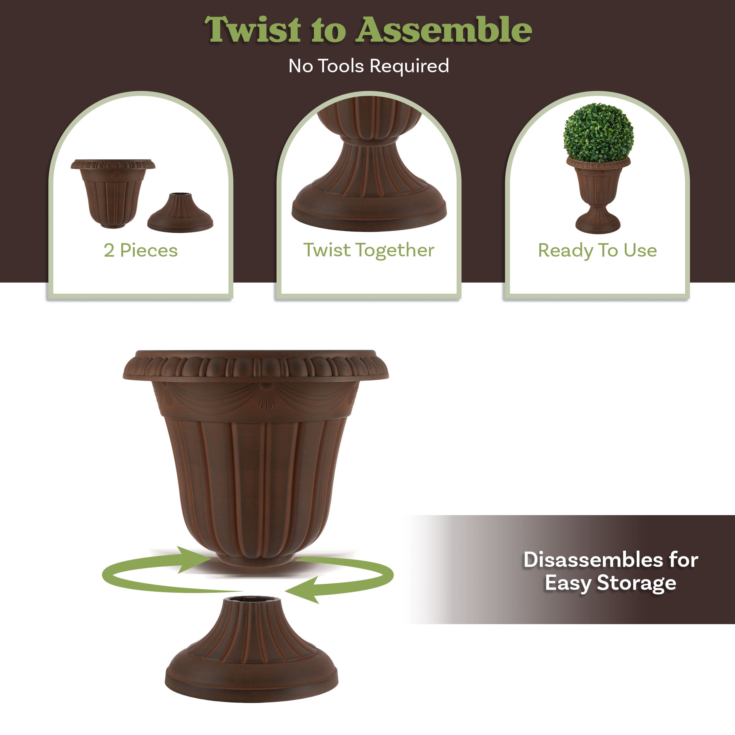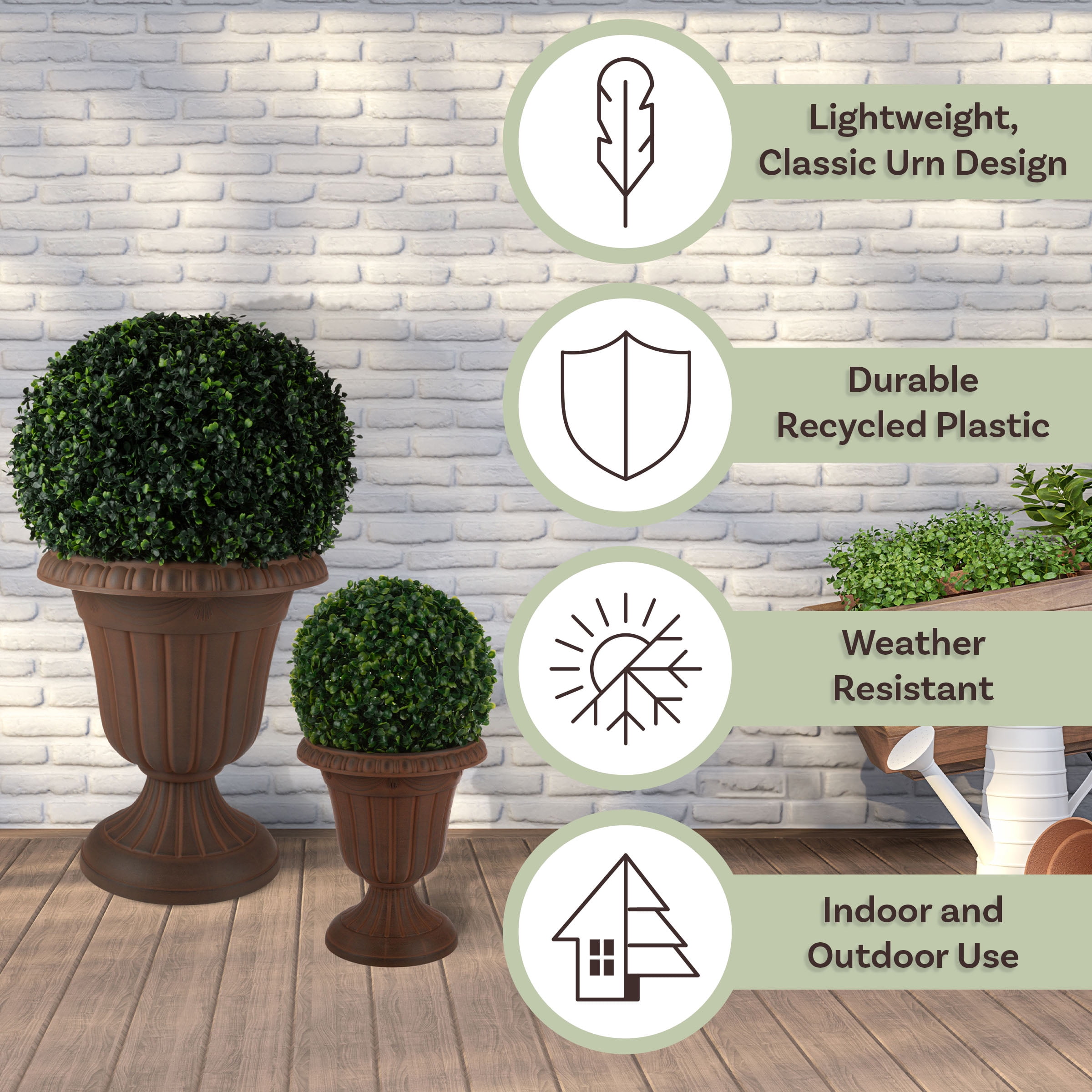 LARGE OUTDOOR PLANTERS 2-PACK – This urn planter set combines the traditional charm of a pedestal planter with a durable, lightweight, and easy-to-clean plastic construction. YEAR-ROUND USE – The recycled polypropylene material is tough enough to endure heat and cold, so you can enjoy these porch planters outdoors all year long. EASY ASSEMBLY – The pots for plants arrive in 2 pieces and assemble with a simple twist with no tools required, and drainage holes can be drilled in the bottom if desired. VERSATILE STYLE – The gardening pots can be used indoors or out with living or artificial plants, so you can use the outdoor planters for porch decor, to frame an entry with topiaries, decorate a deck, or fill your garden with blooms. MATERIALS – Recycled Polypropylene Plastic. DIMENSIONS – Lg: (L) 16” x (H) 18”; Interior: (L) 13” x (H) 12.75”; Weight: 3.8lbs; Capacity: 30lbs/13.6L; Sm: (L) 9.75” x (H) 11.25”; Interior: (L) 8” x (H) 7.875”; Weight: 2.42lbs; Capacity: 8.5lbs/3.9L. COLOR – Brown.