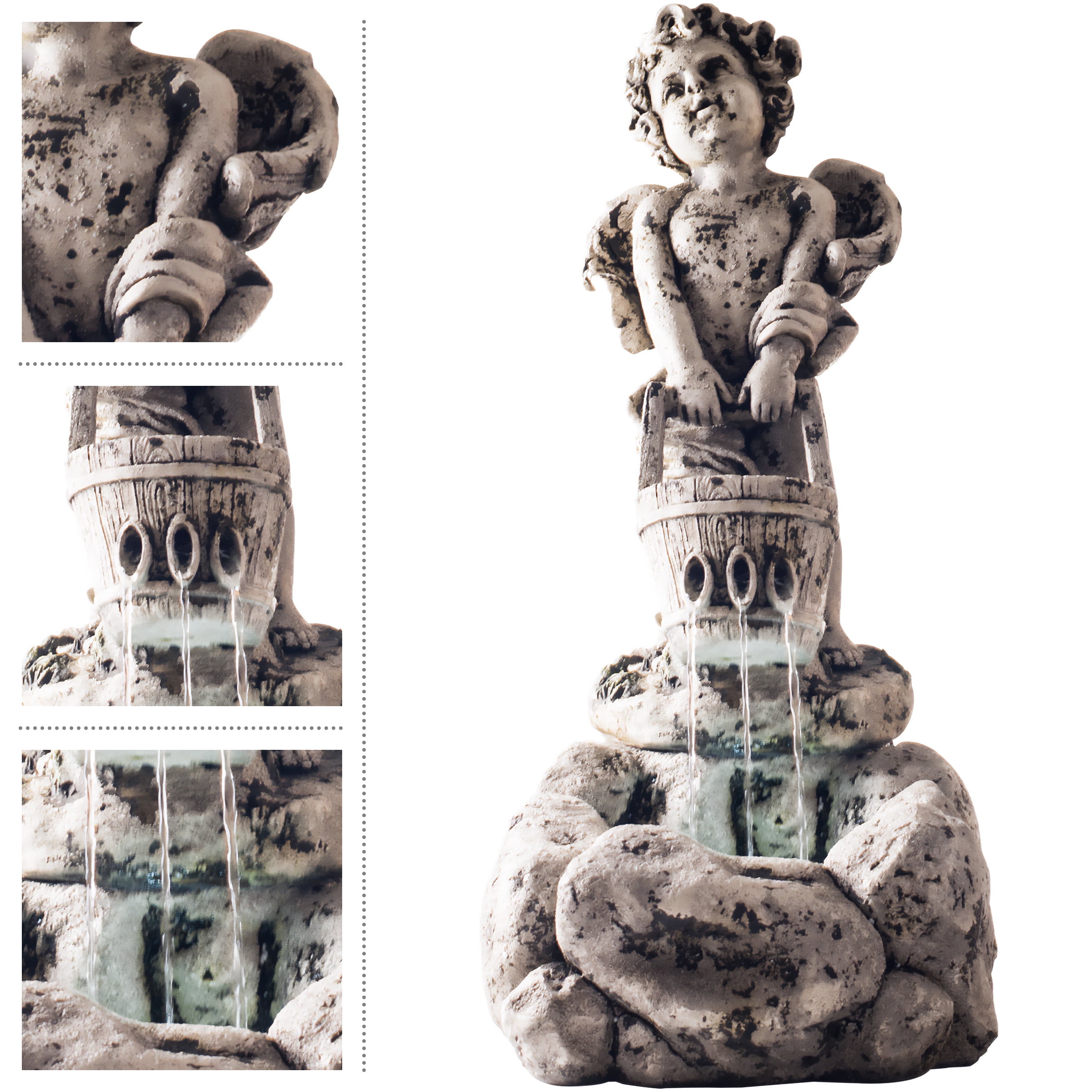The soothing water sounds and antique distressed stone look of the Cherub Statue Water Fountain by Pure Garden brings tranquility, relaxation, and whimsical beauty to your outdoor living area. The outdoor fountain features a polyresin construction for weatherproof durability, included pump with maximum flow of 70 gallons per hour, and is easy to set up for low stress assembly. Whether you use this fountain as decoration in your garden, on the patio, on your deck, or near the entranceway in front of your home, this water fountain is sure to bring an ambiance of peace and serenity, while leaving an elegant lasting impression! IMPORTANT: Avoid buying counterfeit products and transacting with unauthorized sellers. Look for our logo on the packaging for every one of our products. Pure Garden is committed to providing the consumer with the absolute best price and value on our entire line of products, which we ensure by applying a rigorous Quality Control process.