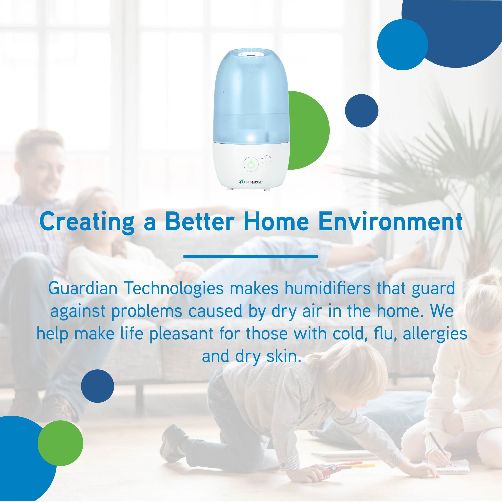 The 70-hour Ultrasonic Cool Mist Humidifier guards against problems caused by dry air in the home. It features an easy to fill 1 gallon tank, ideal for use in small to medium rooms. Silver Clean™ Protection is embedded in the tank to help keep the water tank cleaner longer. Thanks to ultrasonic technology, it disperses a fine mist into the air, and is ultra-quiet making it ideal to have on while you sleep. It has an optional aromatherapy tray so a few drops of essential oil can be added to create a relaxing atmosphere. A low water indicator light lets you know when it’s time to refill the water tank. It also features a soft glow night light. PureGuardian® humidifiers create a better home environment for those suffering from colds, allergies and dry skin. Note: Run time is based off of running the unit on low setting and cool mist, also depends on atmospheric conditions. Covers 320 Sq. ft.