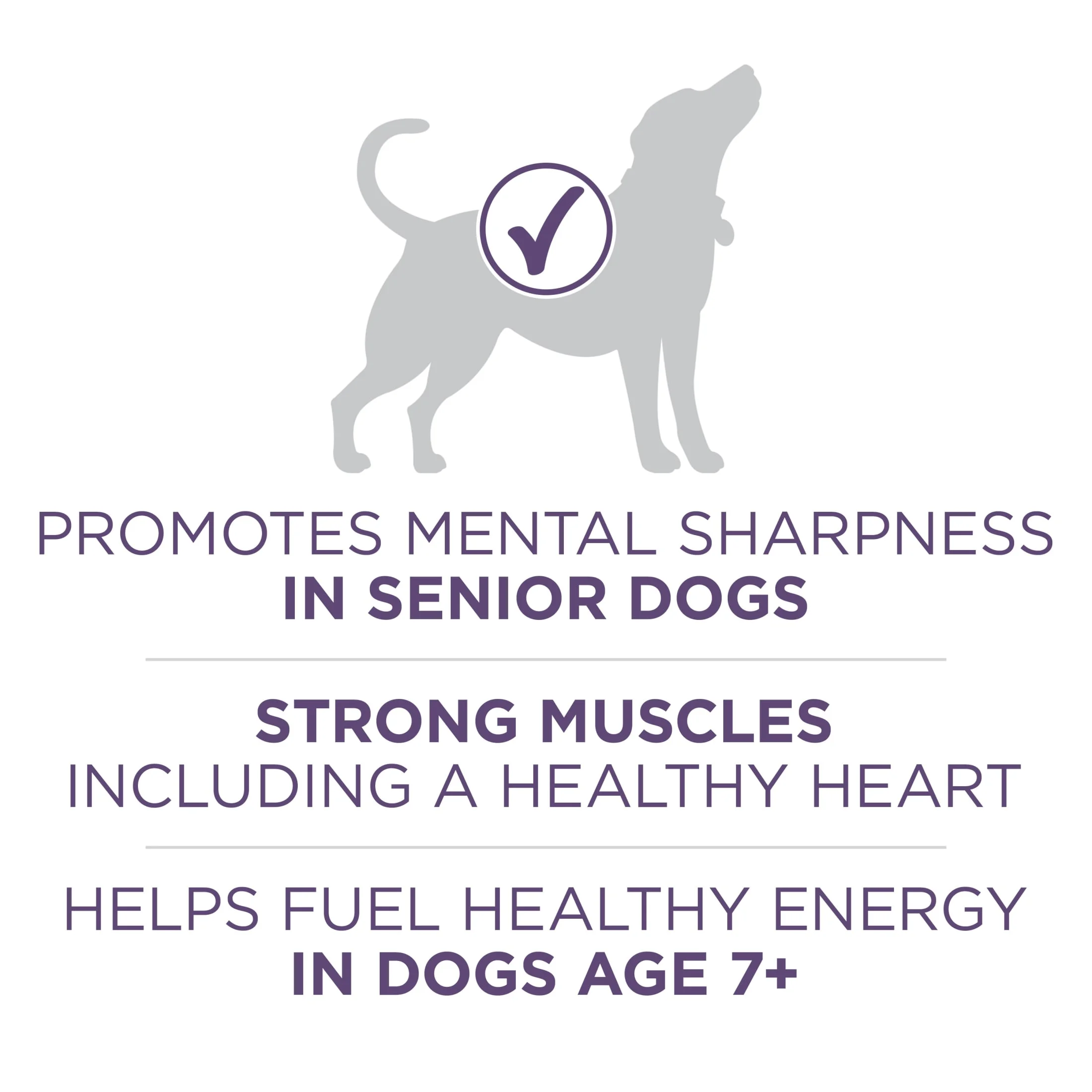 Purina One High Protein Senior Dry Dog Food, 31.1 lb Bag Purina senior dog food with 20 percent MCT-rich vegetable oil promotes mental sharpness and increases average activity levels in dogs seven and older High protein dry dog food starts with real chicken as the #1 ingredient and supports strong muscles, including a healthy heart High quality dog food for older dogs features omega-6 fatty acids, vitamins and minerals to support his shiny coat and healthy skin plus natural glucosamine sources to promote joint health for dogs High quality dog food for older dogs features omega-6 fatty acids, vitamins and minerals to support his shiny coat and healthy skin plus natural glucosamine sources to promote joint health for dogs Deliciously crunchy bites and tender meaty morsels provide the taste and textures dogs love and work with added calcium to support strong teeth and healthy gums