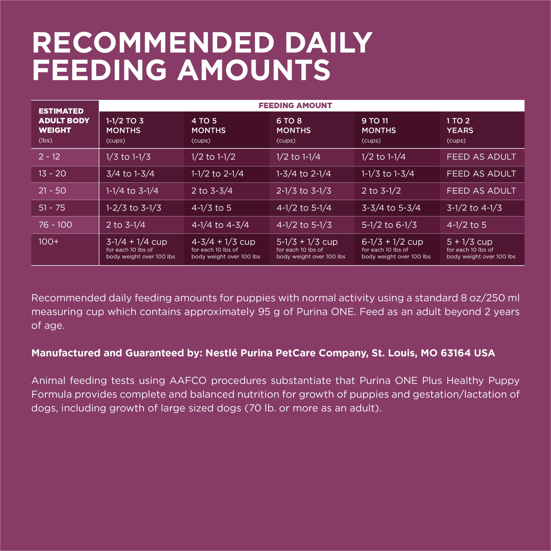 Give your new puppy what he needs with Purina ONE Plus Natural Healthy Puppy Formula puppy dry food with added vitamins, minerals and nutrients. Real chicken is the first ingredient in this natural dog food for puppies, helping to provide the protein he needs for strong muscles, including a healthy heart. Every serving of this Purina ONE Puppy food formula contains easily digestible rice and oat meal along with DHA, a nutrient found in mother’s milk, to support his vision and brain development. Also included is a blend of four antioxidant sources that helps promote a healthy immune system and omega-6 fatty acids to nourish his healthy skin and coat. This healthy puppy food formula is highly digestible, and natural sources of glucosamine for dogs help support healthy joints. Plus, crunchy kibble and calcium support his strong teeth and healthy gums. We use no artificial flavors or preservatives in this Purina ONE high protein dog food for puppies, which contains 100 percent complete and balanced nutrition for puppies and 0 percent fillers, so every ingredient has a purpose. Rest assured that you’re giving your puppy everything they need with this puppy dog food crafted by a veterinarian-recommended brand and proudly produced in Purina-owned facilities.