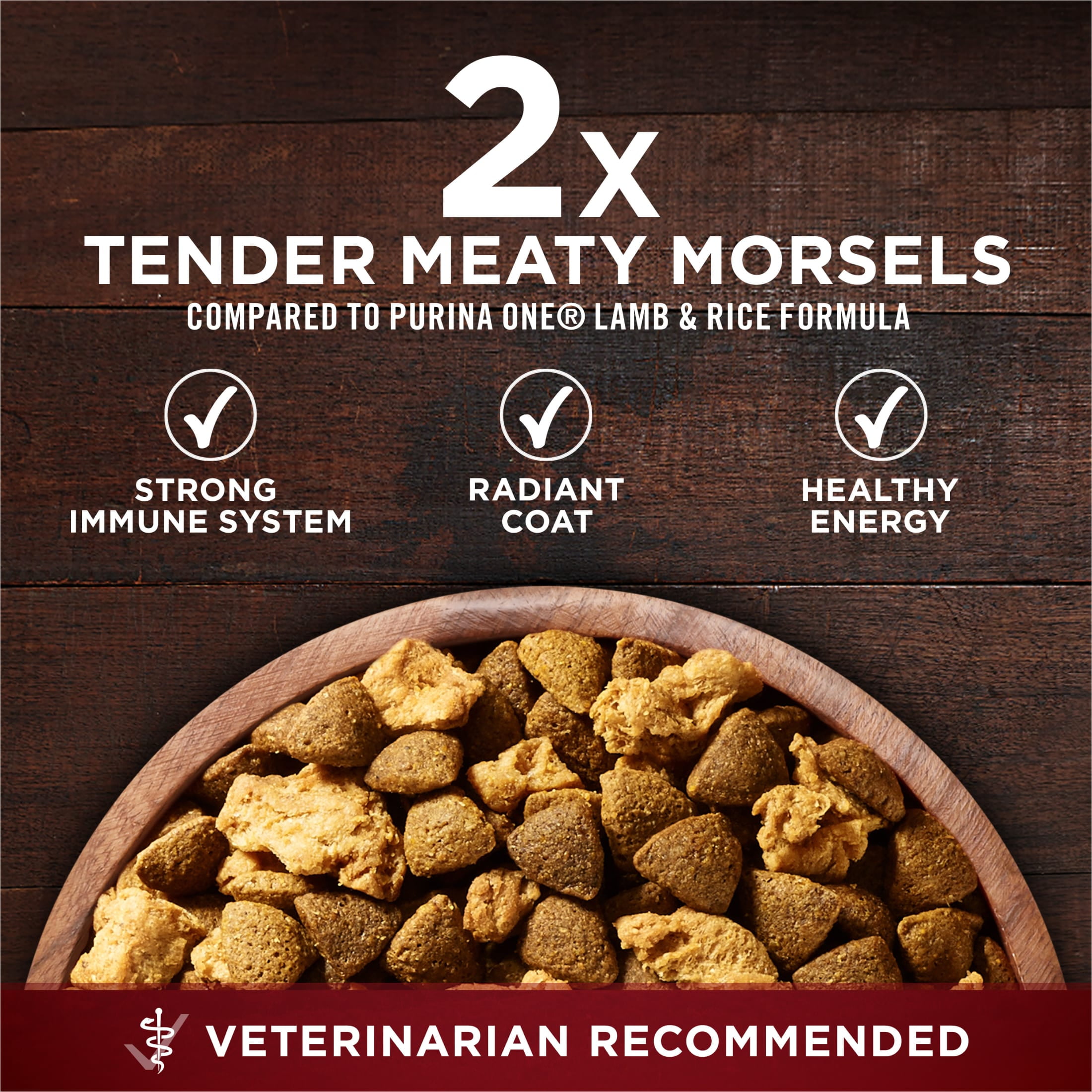 Proper nutrition can make all the difference in your dog’s daily life, so serve up Purina ONE True Instinct With Real Salmon and Tuna Natural With Added Vitamins, Minerals and Nutrients dry dog food formula to give your dog the nutrition he craves. With 100 percent complete and balanced nutrition for adult dogs and 0 percent fillers, every ingredient in this wholesome Purina ONE dry dog food has a purpose. Purina starts this high protein dog food recipe with real salmon as the number 1 ingredient while also including real tuna. Each delicious serving of this Purina ONE dry dog food delivers 30 percent protein, which helps support your active dog’s strong muscles, including his healthy heart. Purina also crafts this natural, high-protein dog food with added vitamins, minerals and nutrients and with no poultry by-product meal, artificial flavors or preservatives to ensure your dog gets everything he needs and nothing he doesn’t. Along with a highly digestible dog kibble formula that lets more nutrition go to work inside your pal, this nutrient-dense recipe also features natural sources of glucosamine for dogs to support joint health. This complete and balanced Purina ONE dry adult dog food features two times the meaty morsels compared to our Purina ONE Lamb and Rice formula.