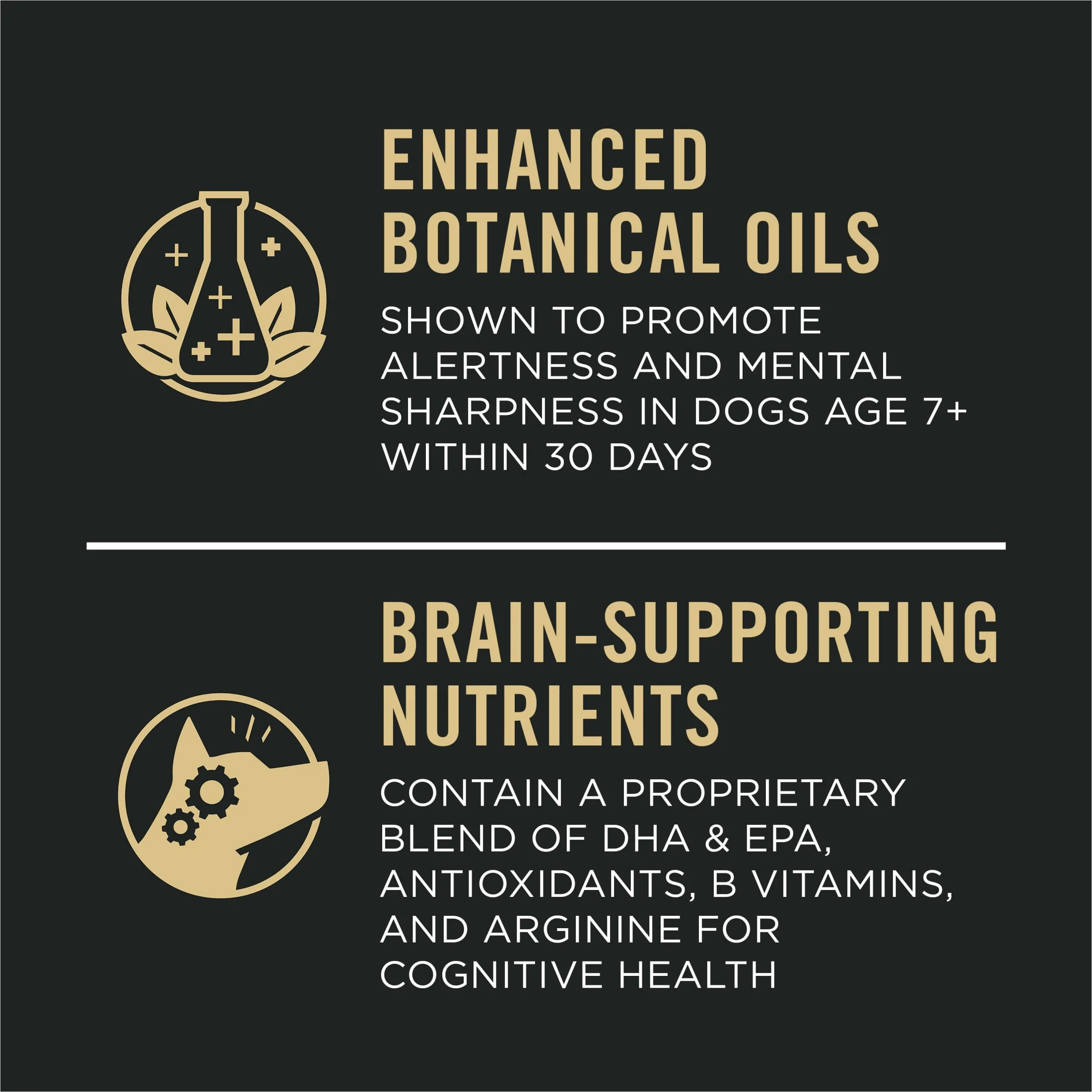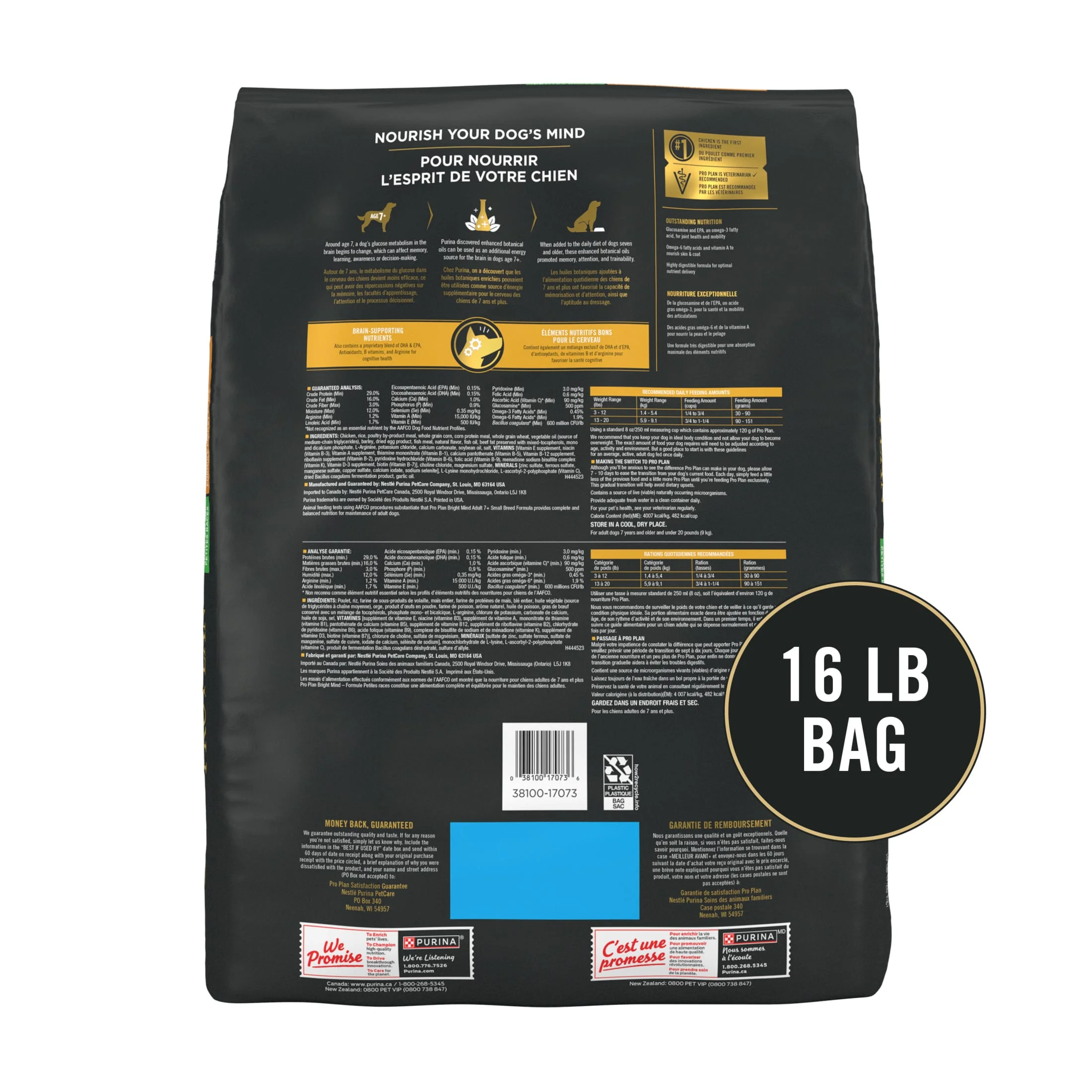Help your dog keep going strong in his golden years with nutrition designed to help him thrive by feeding him Purina Pro Plan Bright Mind Adult 7 Plus Small Breed Formula dry dog food. Included in this senior small breed dog food are enhanced botanical oils shown to promote alertness and mental sharpness in dogs ages 7 and older within 30 days to help keep his mind functioning like they did in his prime years. It’s also made with brain-supporting nutrients that contain a proprietary blend of DHA and EPA, antioxidants, B vitamins and arginine for cognitive health. A complete and balanced, high-protein dog food, this formula features 29 percent protein and 14 percent fat to help maintain his lean muscles while supporting an ideal body condition. It also gives your dog probiotic support for gut microbiome resilience. Plus, a nourishing blend of EPA, an omega-3 fatty acid, and glucosamine in this small breed Purina Pro Plan dog food formula helps support his joint health and mobility. Each serving of this super-premium dry dog food contains high-quality protein, including chicken as the first ingredient. Fill your small breed senior dog’s bowl at mealtime with a formula that represents a breakthrough innovation in dog nutrition with Purina Pro Plan Bright Mind Adult 7 Plus Small Breed Formula dry dog food. Pro Plan offers more than 80 Purina Pro Plan dog food formulas to support your dogs’ unique nutritional needs and taste preferences at every stage of life. These include specialized dog food formulas based on breed size, sensitive systems, or lifestyle, and exceptional wet and dry dog food formulas. These formulas include real, high-quality meat, salmon, chicken and lamb as the number 1 ingredient so your dog can enjoy Purina Pro Plan dog foods with great tastes and advanced nutrition at every age.