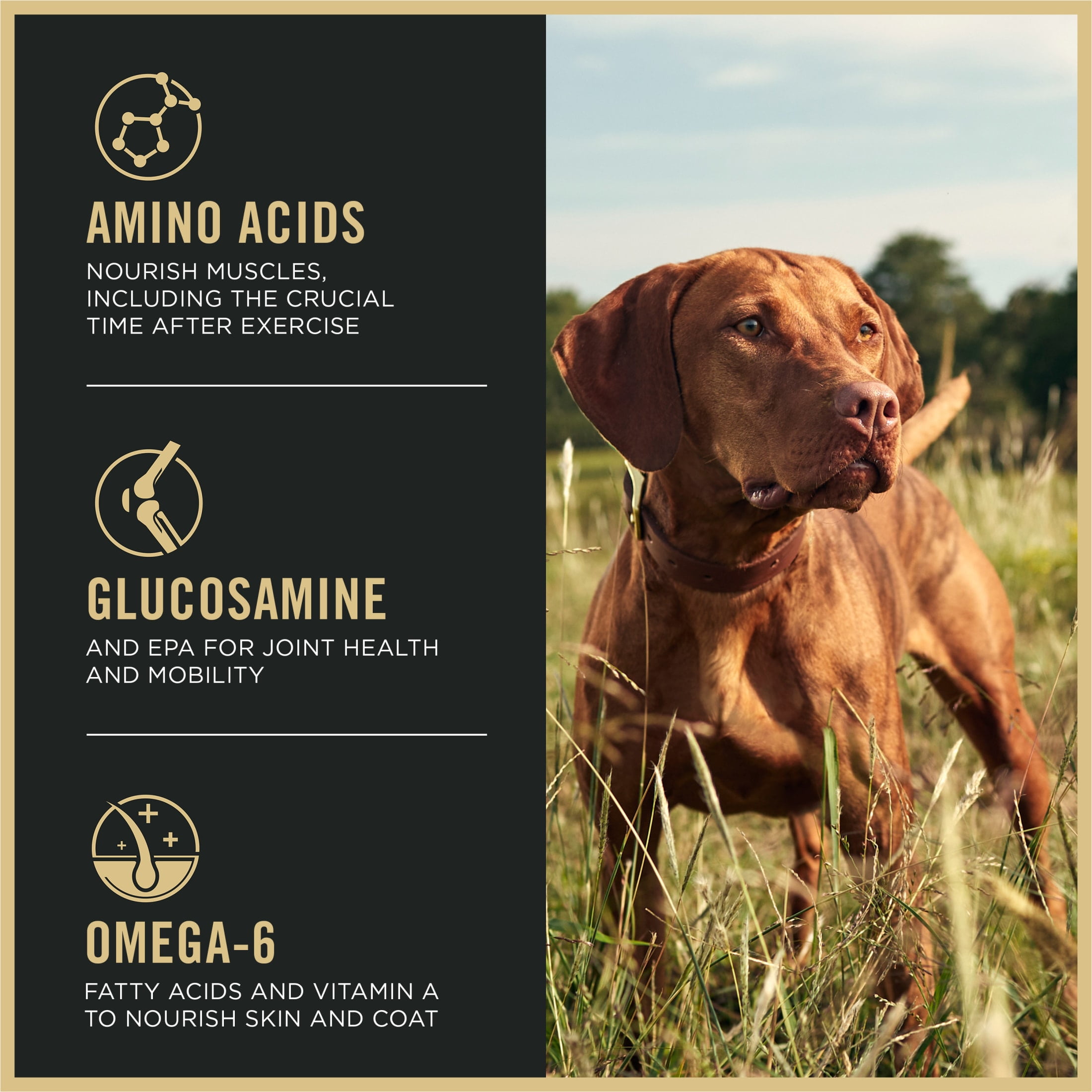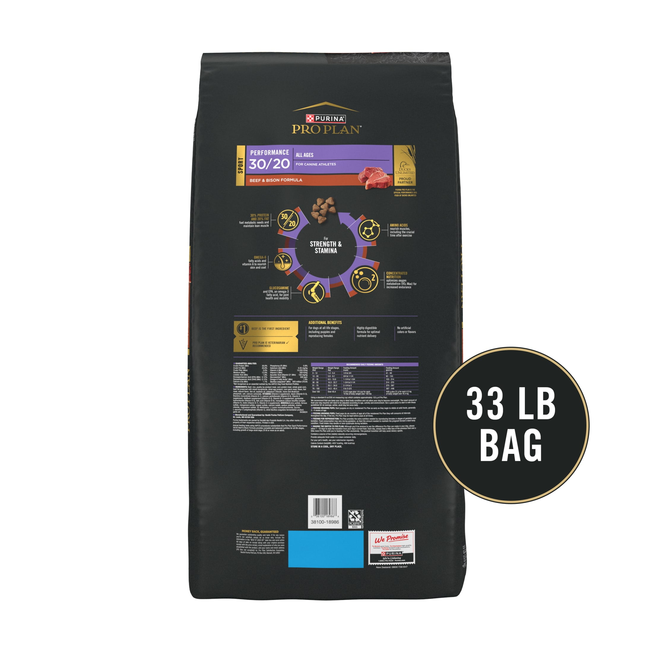 Support your dog’s active lifestyle with Purina Pro Plan Dog Food Sport Performance 30/20 Beef and Bison Formula Dry Dog Food. Specially designed for sporting dogs, this high protein dog food delivers the nutrition needed to fuel strength and endurance. It features real beef as the first ingredient to help maintain lean muscle, while a 30 percent protein and 20 percent fat ratio provides sustained energy for running, training, and high-performance activities. This dry dog food is fortified with dog probiotics to promote digestive and immune health, helping your dog absorb nutrients efficiently. Plus, it contains dog glucosamine to support joint health and mobility, which is essential for active and large breed dog food formulas. Designed to be highly digestible, this Purina Pro Plan Dog Food ensures optimal nutrient absorption, so your dog gets the most from every meal. With every serving, your dog receives 100 percent complete and balanced nutrition, crafted to support endurance, recovery, and overall well-being. Whether you have a small dog food preference or need a formula suited for larger breeds, Pro Plan Dog Food is made to meet the needs of active dogs. Choose Purina Pro Plan Dog Food Sport Performance 30/20 Beef and Bison Formula Dry Dog Food to give your dog the strength, energy, and nutrition they need to thrive.