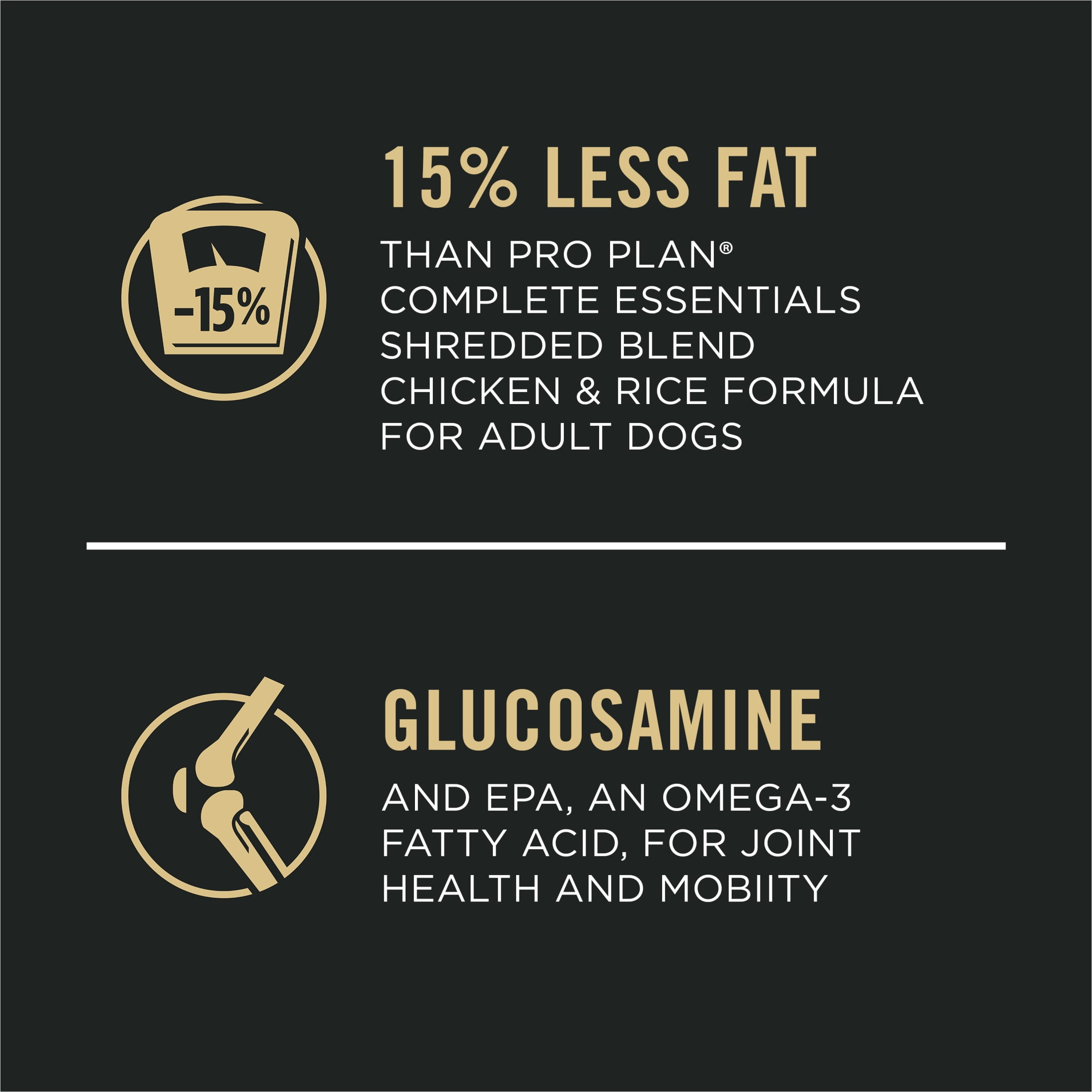 Dry dog food for overweight and less active adult large breed dogs over 50 pounds High protein dog food formula, with real chicken as the first ingredient and fortified with live probiotics for dogs to help promote gut microbiome resilience Large Breed Dog Food Formula. Optimal protein-to-fat ratio helps maintain muscle mass during weight loss Healthy weight dog food with natural prebiotic fiber for dogs from wheat bran helps promote digestive health. Contains glucosamine and EPA for joint health support Weight loss dog food with vitamin A and omega-6 fatty acids to nourish skin and coat This Purina Pro Plan dog food is proudly manufactured in Purina-owned U.S. facilities