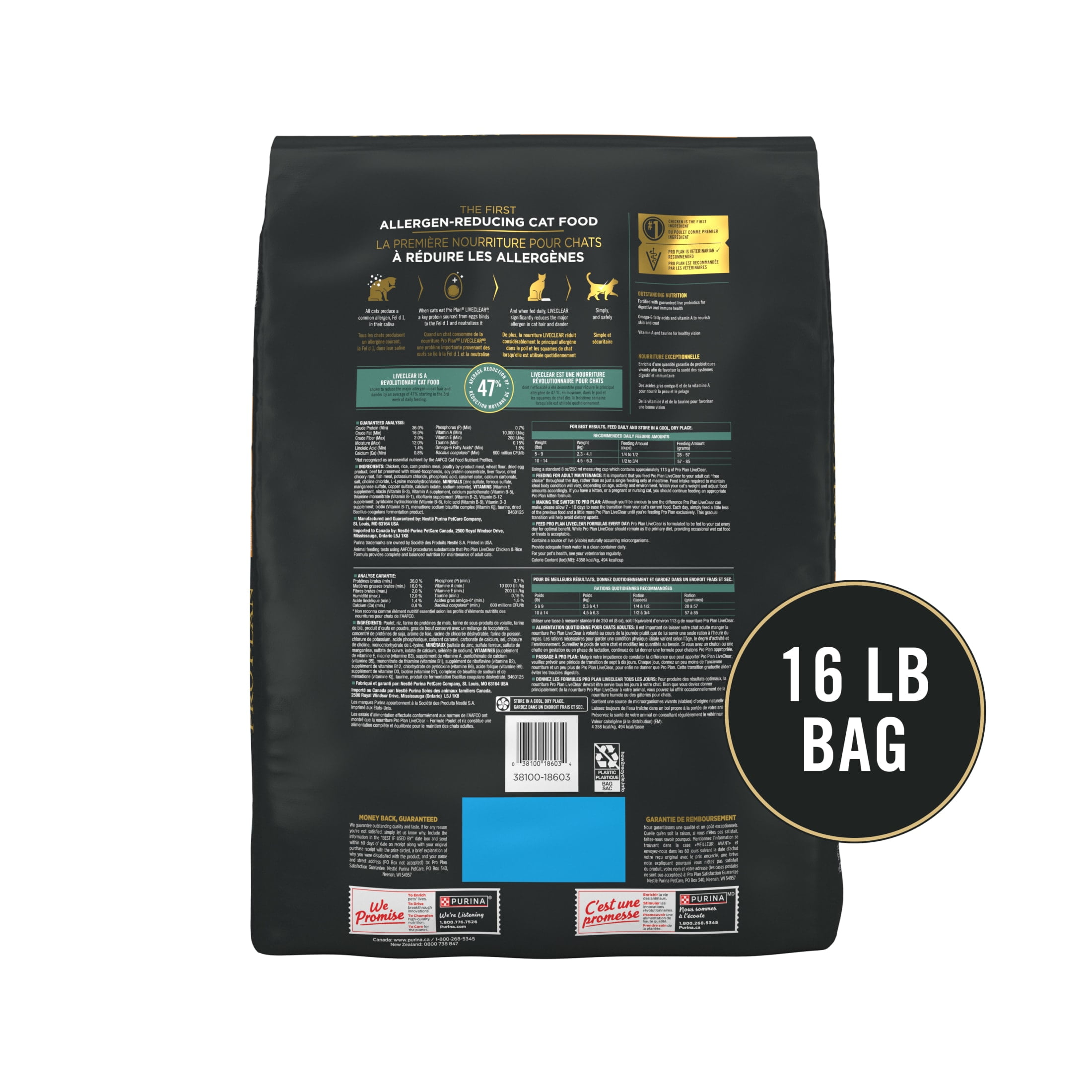 Purina Pro Plan Liveclear for Adult Cats Chicken Rice, 16 lb Bag The first cat food with the power to reduce cat allergens by simply and safely neutralizing Fel D 1 The major allergen in cat saliva, with a key protein from eggs Chicken is the first ingredient in this high dry protein cat food with rice to support muscle strength Safe and nutritious adult digestive dry cat food for skin and coat care is fortified with guaranteed live probiotics for digestive and immune health Try this allergen-reducing adult cat food risk freeKnow LIVECLEAR dry cat foods are targeted formulas from the Pro Plan SPECIALIZED line