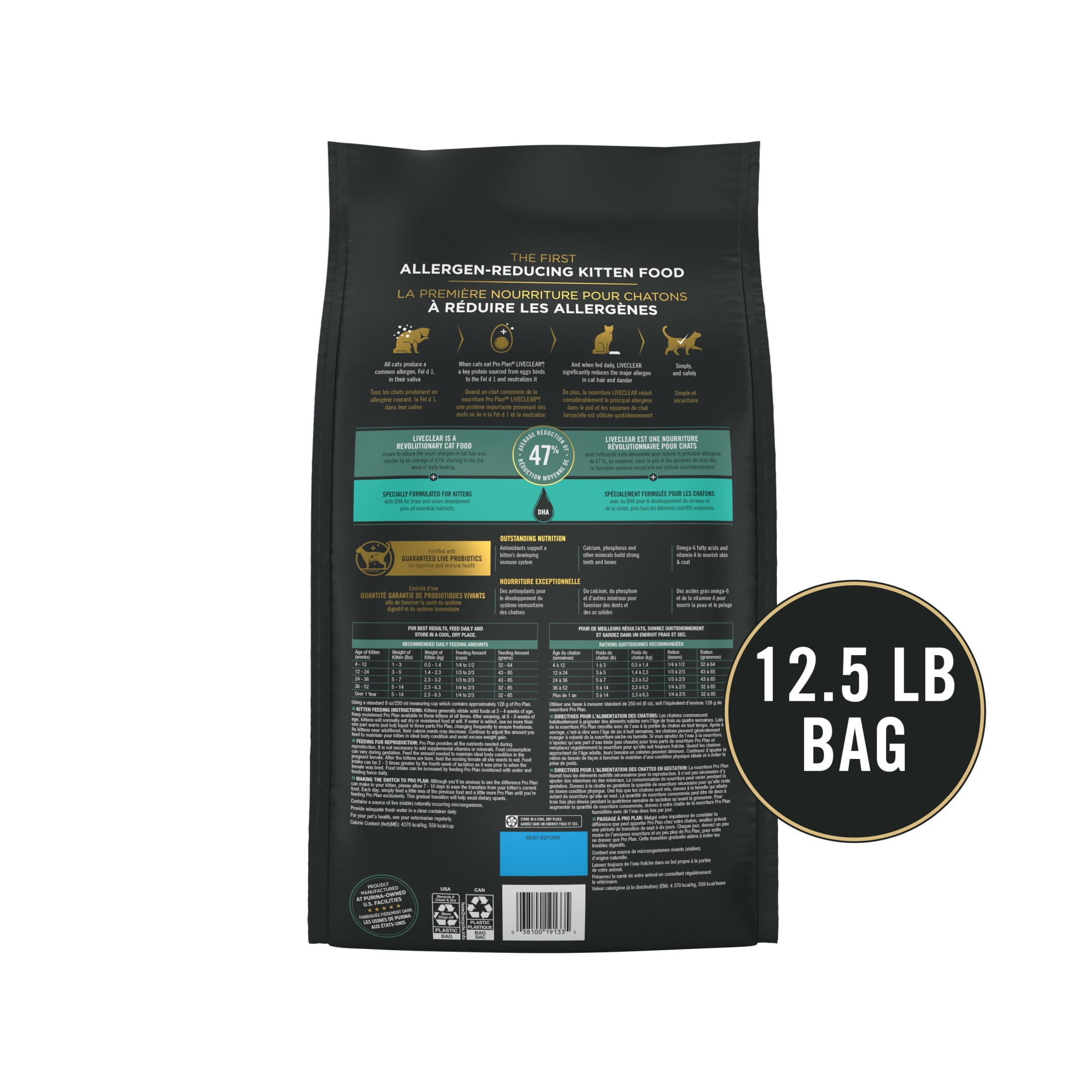 Purina Pro Plan LiveClear Dry Kitten Food Allergen Reducing Chicken and Rice Formula is the first kitten dry food of its kind. Backed by over a decade of research, this revolutionary chicken cat food formula uses a key protein sourced from eggs to simply and safely neutralize Fel d 1, a common allergen found in cat dander and saliva. It is shown to reduce this prominent allergen by an average of 47 percent starting in the third week of daily feeding. With real chicken as the first ingredient, this high protein kibble for kittens supports the development of strong, healthy muscles. Plus, it is fortified with guaranteed live probiotics for digestive support and immune health. Purina Pro Plan LiveClear Dry Kitten Food Allergen Reducing Chicken and Rice Formula is formulated specifically for kittens, with DHA for brain and vision development as well as antioxidants to support your kitten’s developing immune system. This Purina One dry kitten food also contains calcium, phosphorus, and other minerals to help kittens build strong bones and teeth. Try this revolutionary kitten cat food and discover how reducing your kitten’s allergens can change both of your lives—leading to more petting, and more purring, for you and your furry new family member.