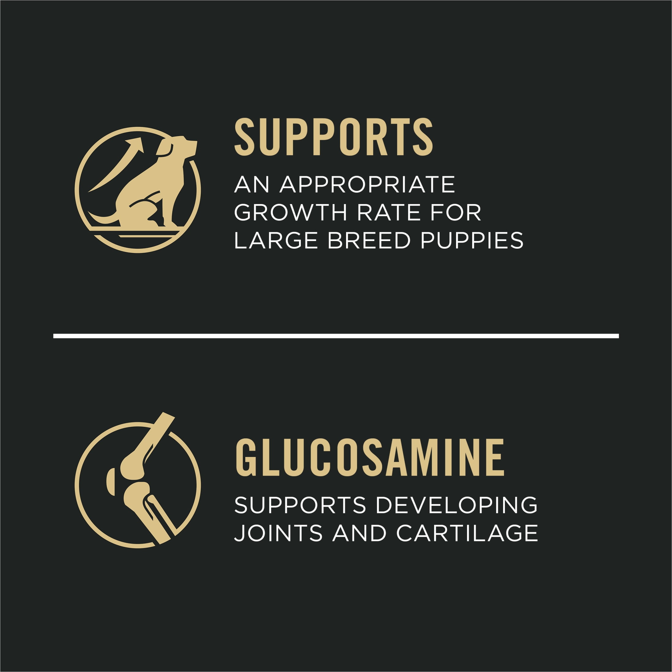 Purina Pro Plan Chicken and Rice for Puppies, 34 lb Bag Formulated to support an appropriate growth rate for large breed puppies Glucosamine supports developing joints and cartilage Vitamin A and omega-6 fatty acids to nourish skin and coat High protein formula, with real chicken as the first ingredient DHA from omega-rich fish oil nourishes brain and vision development
