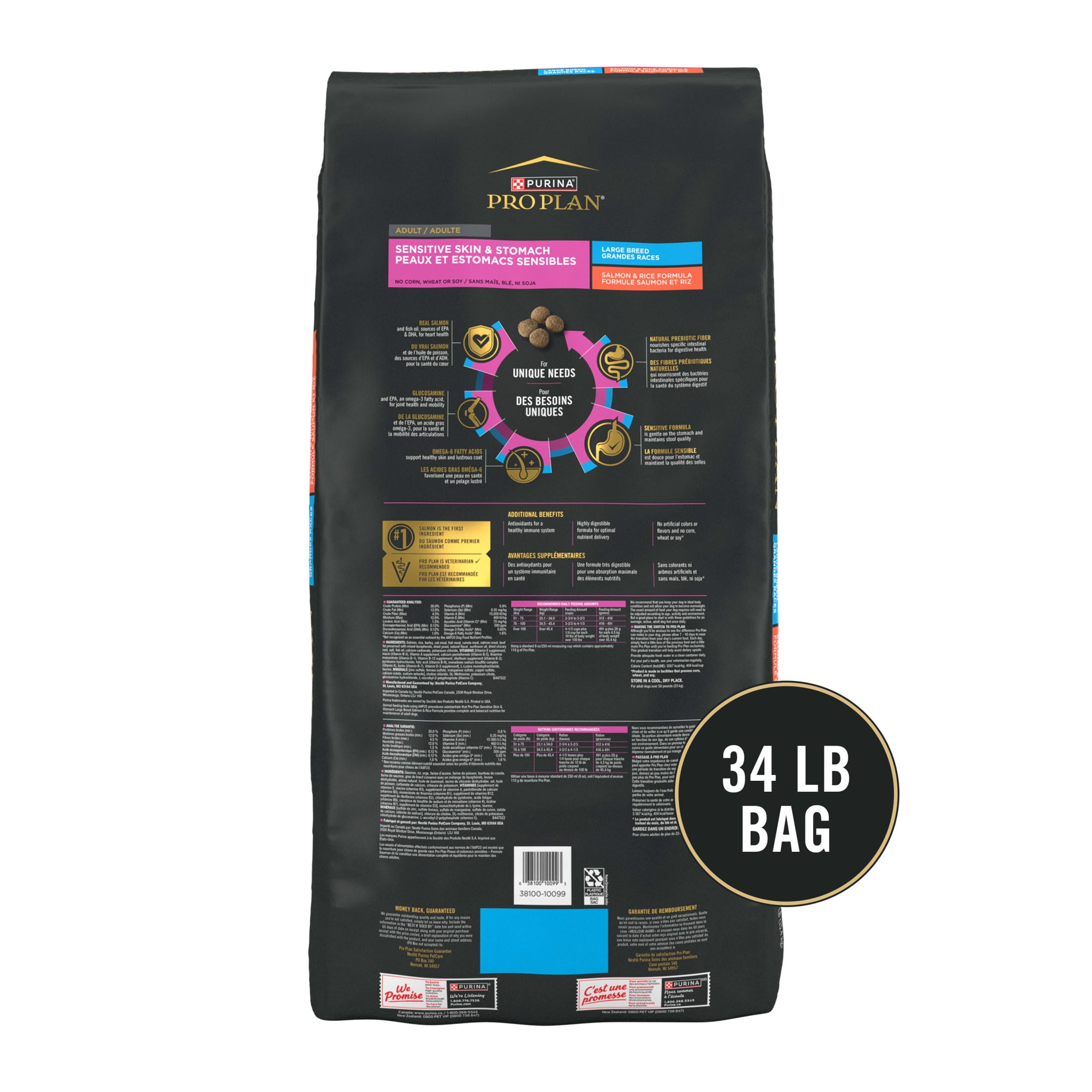 Purina Pro Plan Sensitive Skin and Stomach for Adult Dogs, 34 lb Bag Salmon is the first ingredient Glucosamine and EPA, an omega-3 fatty acid, for joint health and mobility Oat meal is easily digestible and gentle on the digestive system Sunflower oil rich in omega-6 fatty acids for healthy skin and coat Natural prebiotic fiber nourishes specific intestinal bacteria for digestive health