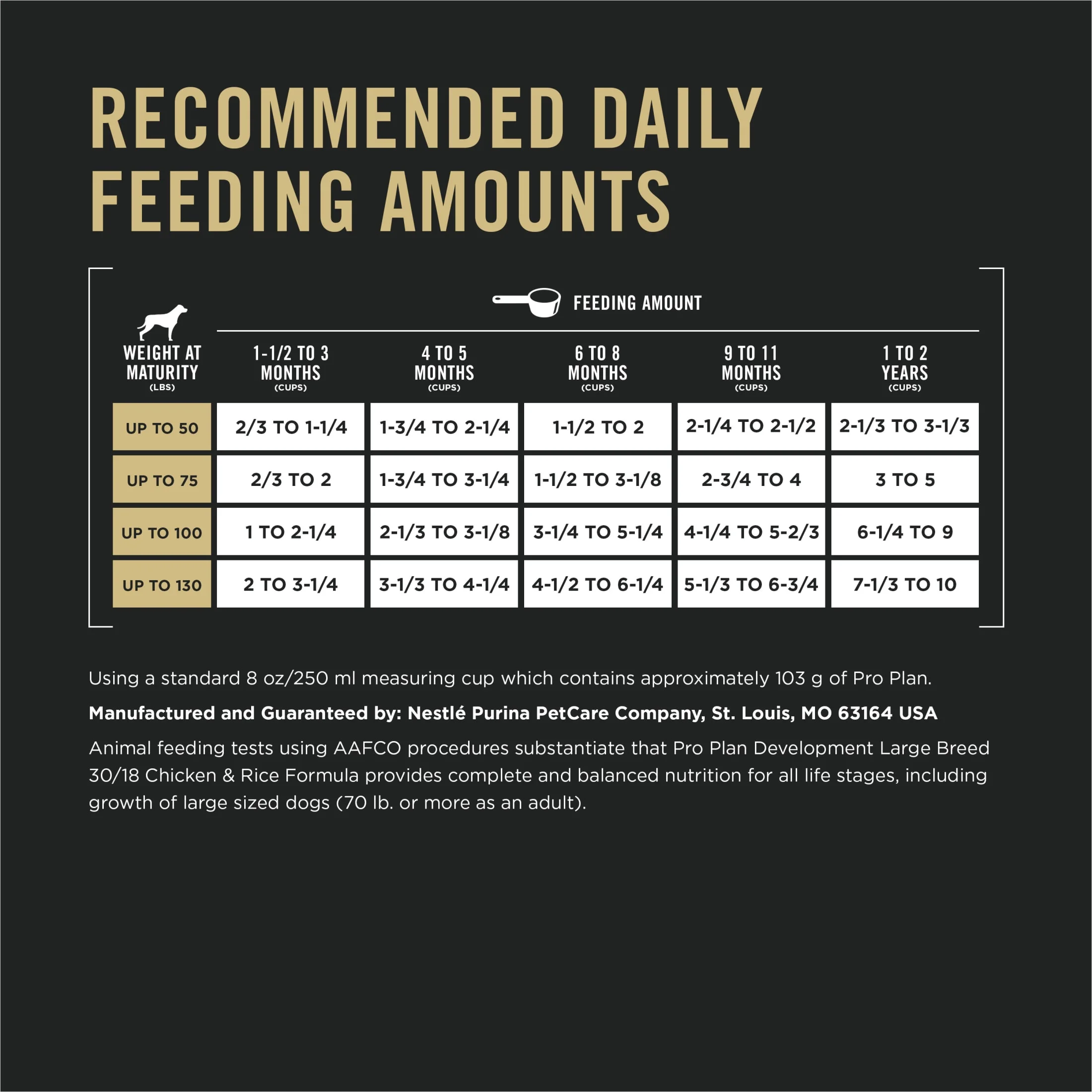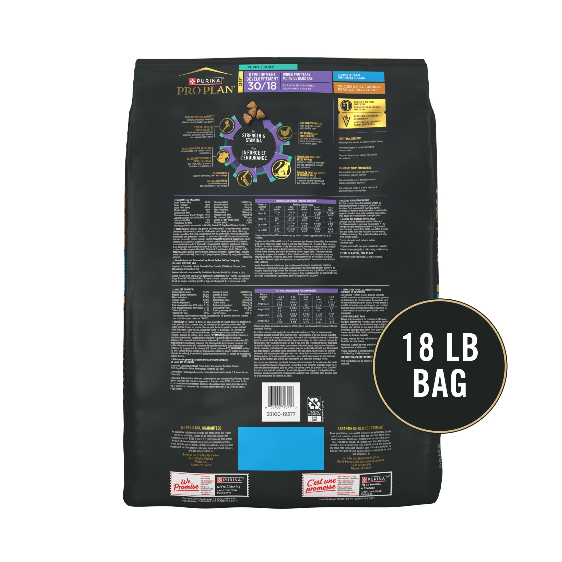 Real chicken is the number 1 ingredient in this Pro Plan large breed dry dog food for puppies from a veterinarian-recommended brand Complete and balanced puppy dog food that promotes concentration, problem-solving and trainability Large breed dog food for puppies delivering brain-nourishing nutrients, including DHA, EPA, taurine, choline, and vitamin C Purina large breed dry puppy food supporting a healthy growth rate and age-appropriate strength and endurance Purina Pro Plan dog food for athletic large breed puppies featuring bone-supporting nutrients calcium, phosphorus and essential vitamins promote healthy bone growth