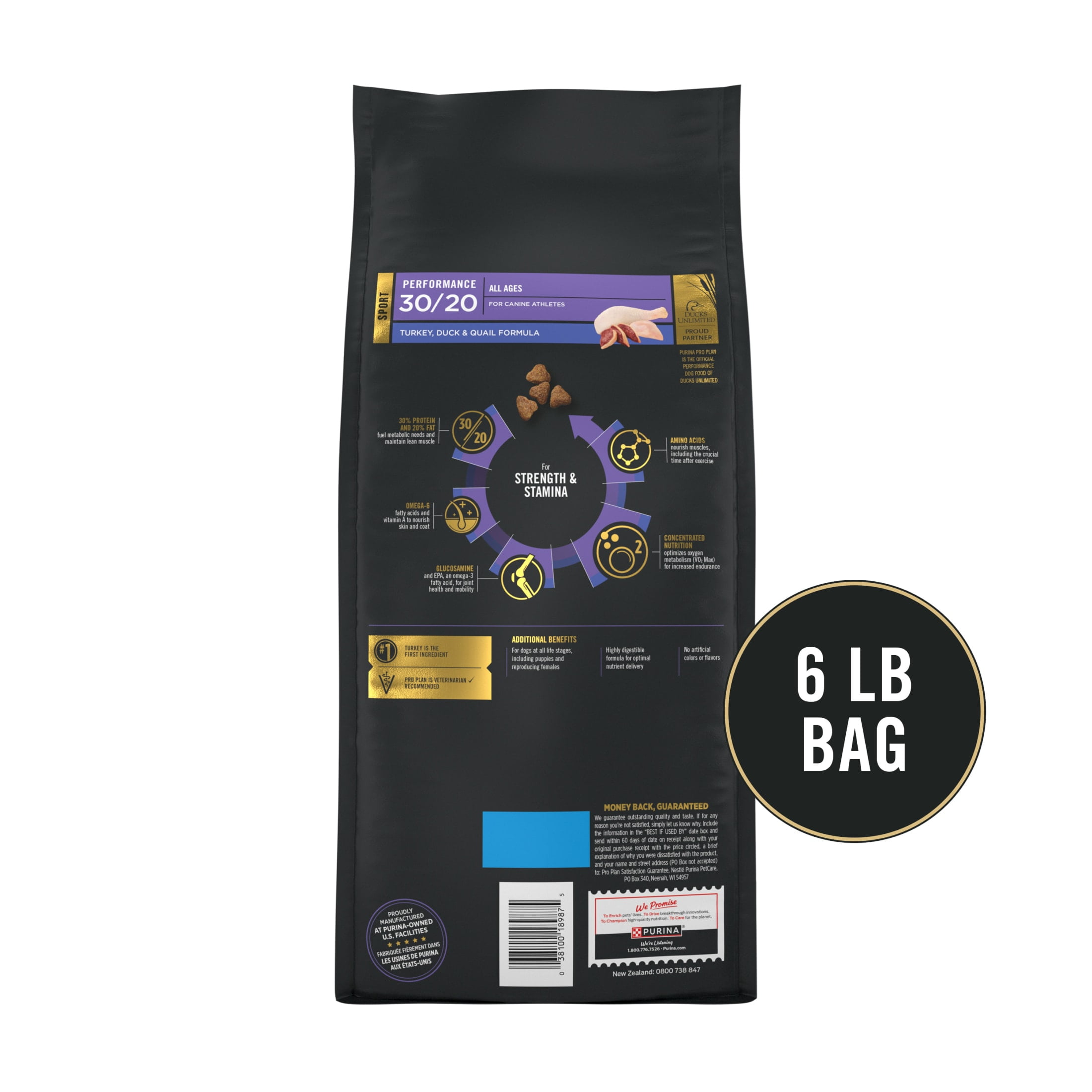 Purina Pro Plan Sport Performance 30/20 High Protein Dry Dog Food supports endurance and muscle strength and contains dog glucosamine to promote hip and joint care, ideal for large breed dogs. Real turkey is the first ingredient in this high protein dog food to help maintain lean muscle in active dogs. 30 percent protein and 20 percent fat ratio fuels energy levels for training, running, and play also fortified with dog probiotics to support digestive and immune health. Pro Plan Dog Food provides complete and balanced nutrition with a digestible formula for optimal nutrient absorption. Spoil your pet with Purina products. Reward yourself with points on every purchase. Download the myPurina app today.