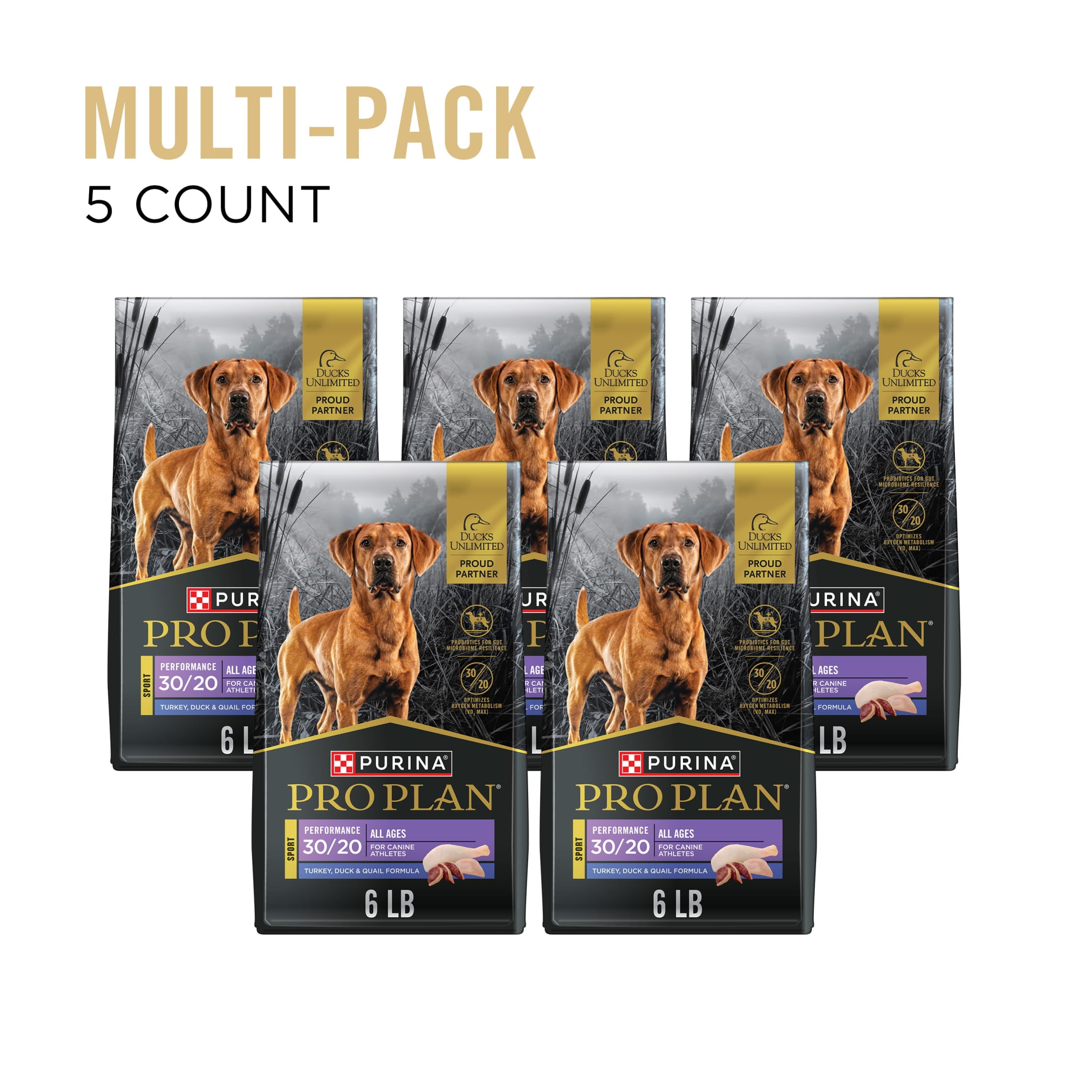 Fuel your dog’s active lifestyle with Purina Pro Plan dog food Sport Performance 30/20 High Protein Dry Dog Food, Turkey, Duck and Quail Recipe. This high protein dog food is designed to support the strength and endurance of sporting and active dogs. Real turkey is the first ingredient, helping to maintain lean muscle, while a 30 percent protein and 20 percent fat ratio provides the energy needed for training, running, and play. This dry dog food is fortified with dog probiotics to promote digestive and immune health, ensuring optimal nutrient absorption. Additionally, it contains dog glucosamine to help maintain joint mobility, making it a great option for both small dog food and large breed dog food needs. The nutrient-rich blend of turkey, duck, and quail delivers complete and balanced nutrition for adult dog food, providing high-quality ingredients in every bite. Crafted for peak performance, Pro Plan dog food includes omega fatty acids and essential amino acids to support a healthy coat, strong muscles, and overall well-being. Whether your dog is training, competing, or just enjoys an active lifestyle, this Purina Pro Plan dog food formula helps keep them fueled and ready for their next adventure. Give your dog the nutrition they need to perform at their best every day.
