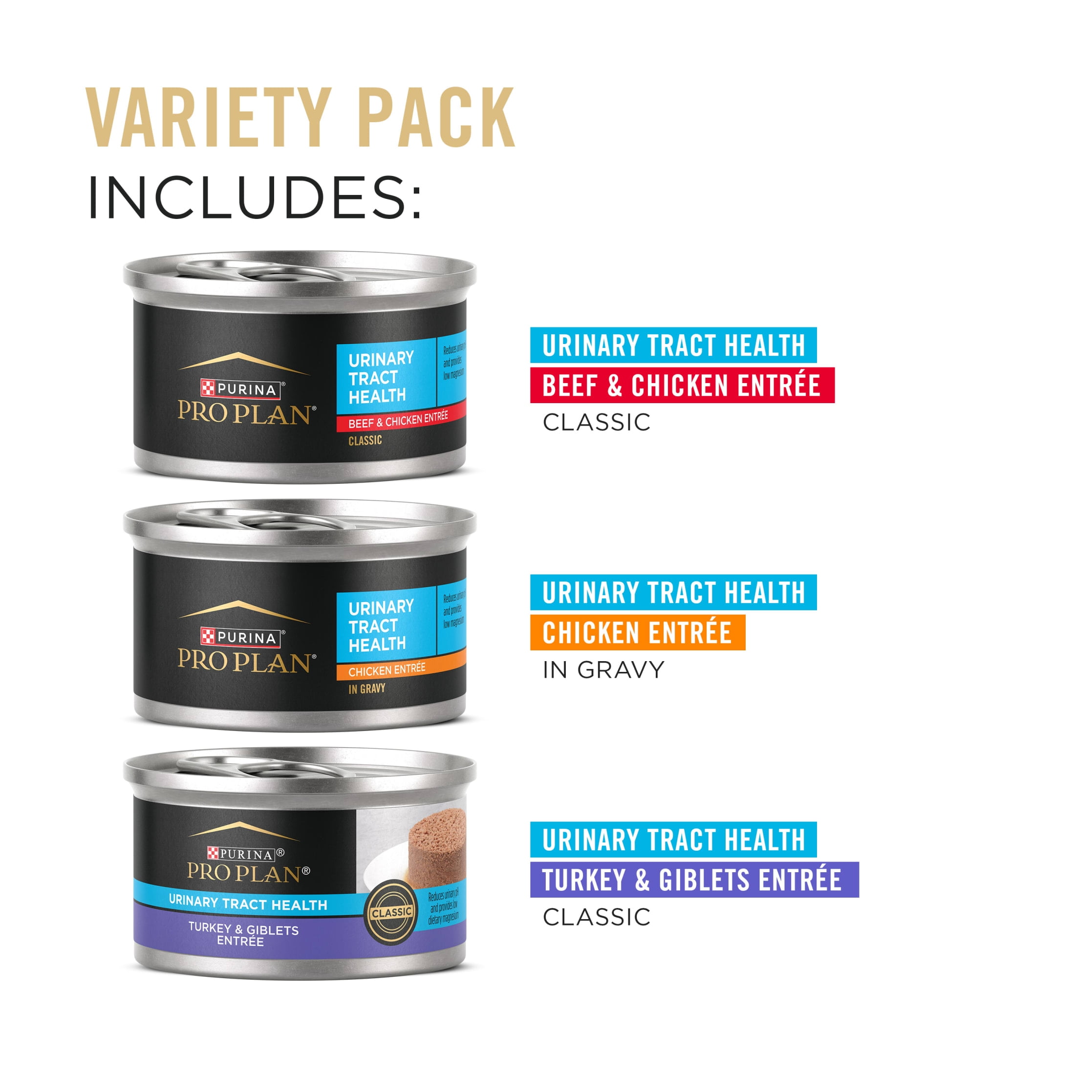 Urinary cat food reduces urinary pH and provides low dietary magnesium while supporting healthy hydration Purina Pro Plan cat food made with real beef or poultry for a taste cats love in a highly digestible formula that supports optimal nutrient delivery Urinary cat food provides focused nutrition to support unique needs Premium cat food with 25 essential vitamins and minerals plus taurine, an amino acid Canned wet cat food variety pack proudly manufactured at Purina-owned facilities, and you can try them risk-free