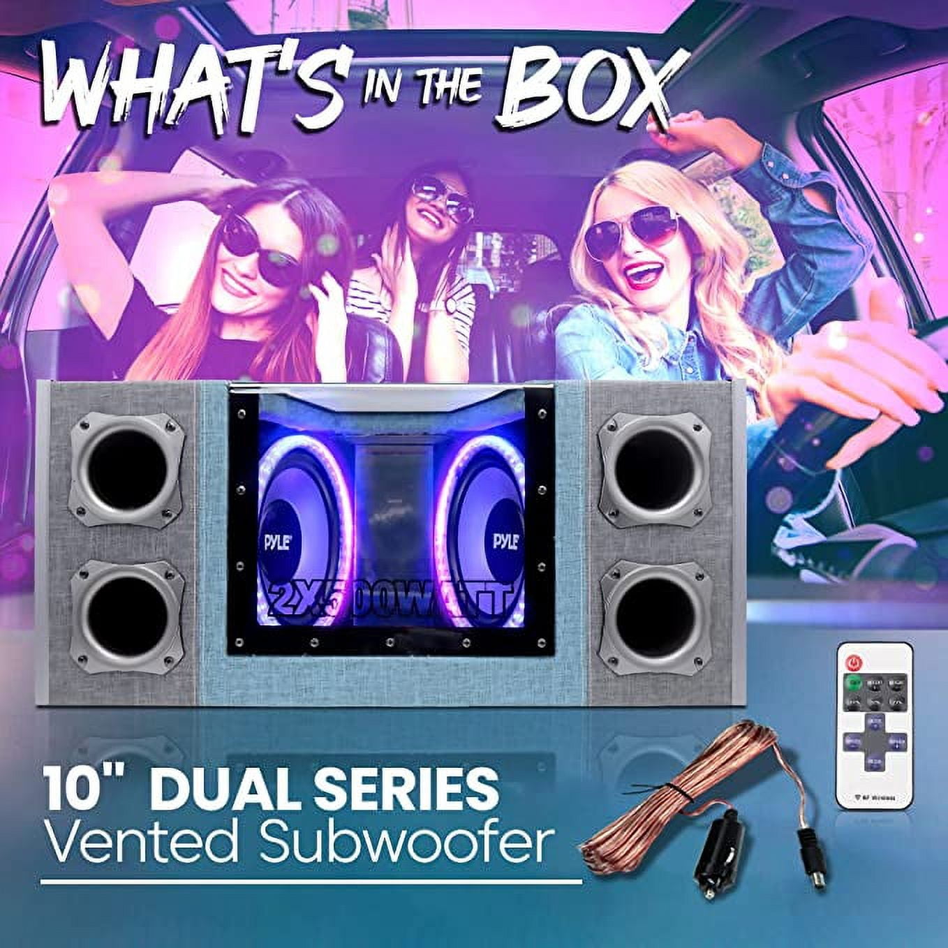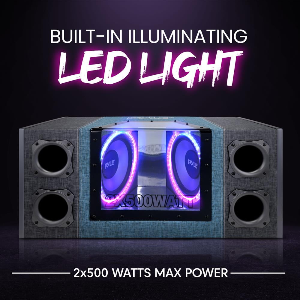 Pyle Adjustable High Efficiency Car Subwoofers with Paper Cone, Polyethylene Silver, 10 x 10 Inches Extra deep bass alignment bandpass for powerful sound that enhances your listening experience in the car Rear vented design minimizes enclosure movement, ensuring streamlined sound quality through both 10-inch subwoofers Customizable bass boost allows you to tailor low bass to your preferences for an optimized audio experience Improved output capability with a unique tuned port and 4 Layer Dual Voice Coils for enhanced efficiency and consistent low-frequency bass 2×500 Watt max power for continuous, undistorted sound, complemented by a 10-inch Silver Paper Cone for strong bass and fuller sound
