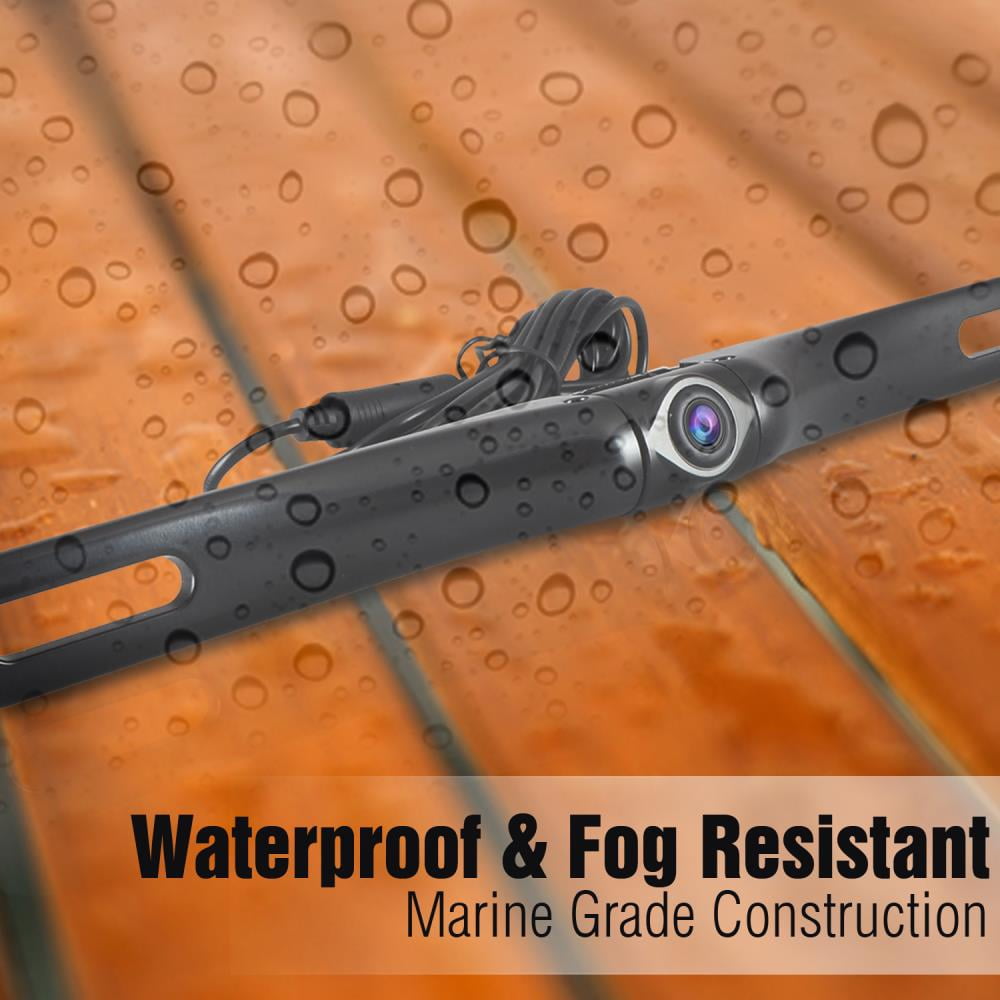 Kit includes a 4.3-inch monitor, backup camera, and all necessary cables/wires for installation 4.3-inch LCD display conveniently mounts to your windshield for easy viewing with built-in 2.4Ghz wireless video receiver Adjustable camera allows you to tilt the camera to your optimal viewing angle Marine-grade construction includes waterproof and fog-resistant design for added durability and safety Night vision capability allows for a clear view in the dark with low lux light performance and auto white balance Responsive/moving digital rearview distance scale line Automatic display activation when car is placed in reverse gear using the reverse camera priority signal sense feature Additional video monitor connection ability Wireless video transmission distance: Up to 100 feet Viewing angle: 170 degrees Total camera pixels: 656 x 492 Power supply: DC 12-volt, 200mA Color: Black Camera dimensions (W x H x D): 10 x 1.3 x 1.26 inches Weight: 1.49 pounds Manufacturer warranty: 1-year warranty