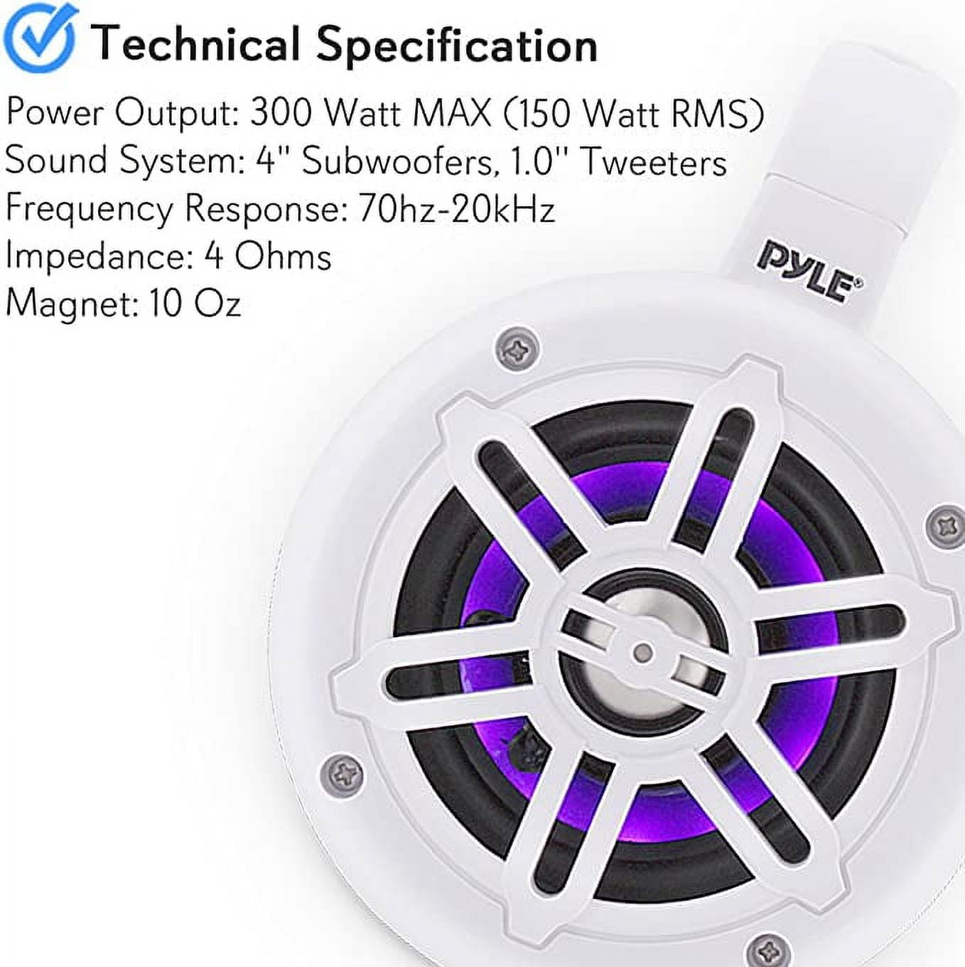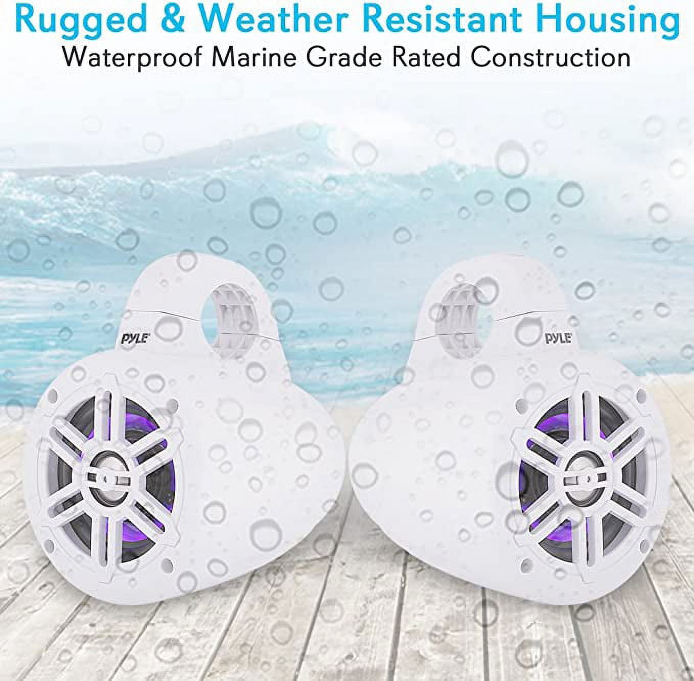 Includes (2) 4-inch powerful Bluetooth marine-grade speakers Marine-grade, waterproof construction makes these speakers great rain or shine Titanium dome 1-inch tweeters Built-in Bluetooth wireless streaming receiver 2-way full-range audio speaker system Built-in illuminating LED lights Engineered ABS speaker grills Rugged, durable and sleek housing Long excursion subwoofers Integrated universal roll bar mounting clamps Anti-corrosion with its weather-resistant and UV-resistant design What’s included: (2) 4-inch speakers, power supply cable, and integrated mounting clamps Bluetooth version: 4.0 Wireless range: 30+ feet Power Output: 300-watt MAX (150-watt RMS) Sound System: 4-inch subwoofers, 1.0-inch tweeters Waterproof Marine Grade Rating: IP-44 Boat Roll Cage / Roll Bar Support Size: Up to 1.96-inch (5 cm) Tweeter Type: Titanium Dome Frequency Response: 70 hz-20KHz Impedance: 4 Ohms Magnet: 10 ounces Sensitivity: 90 dB Construction Material: Engineered ABS Grills Power supply: DC 12-volt Color: White Dimensions (L x W x H): 5.4 x 7.6 x 7.0 inches Weight: 6.83 pounds Manufacturer warranty: 1-year warranty