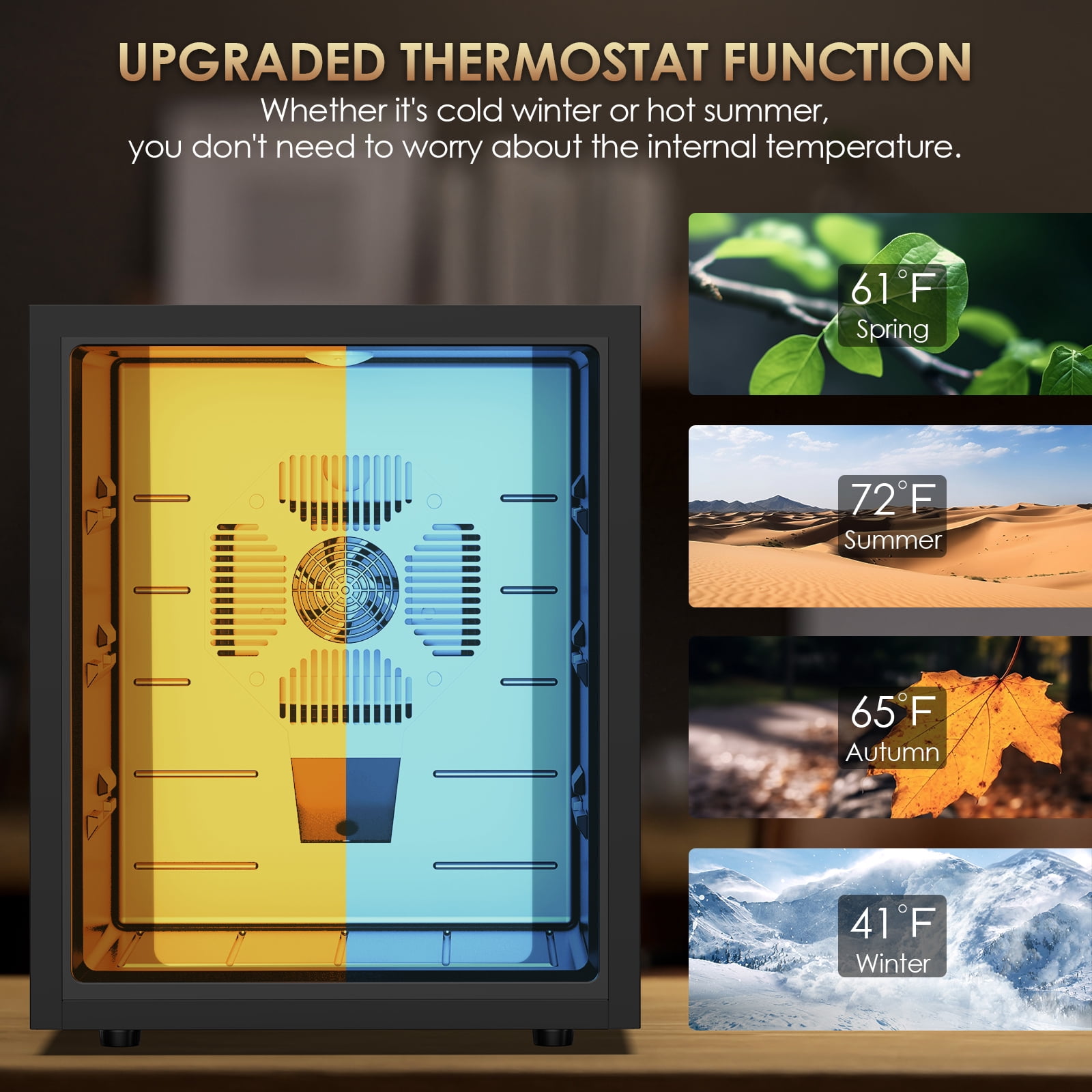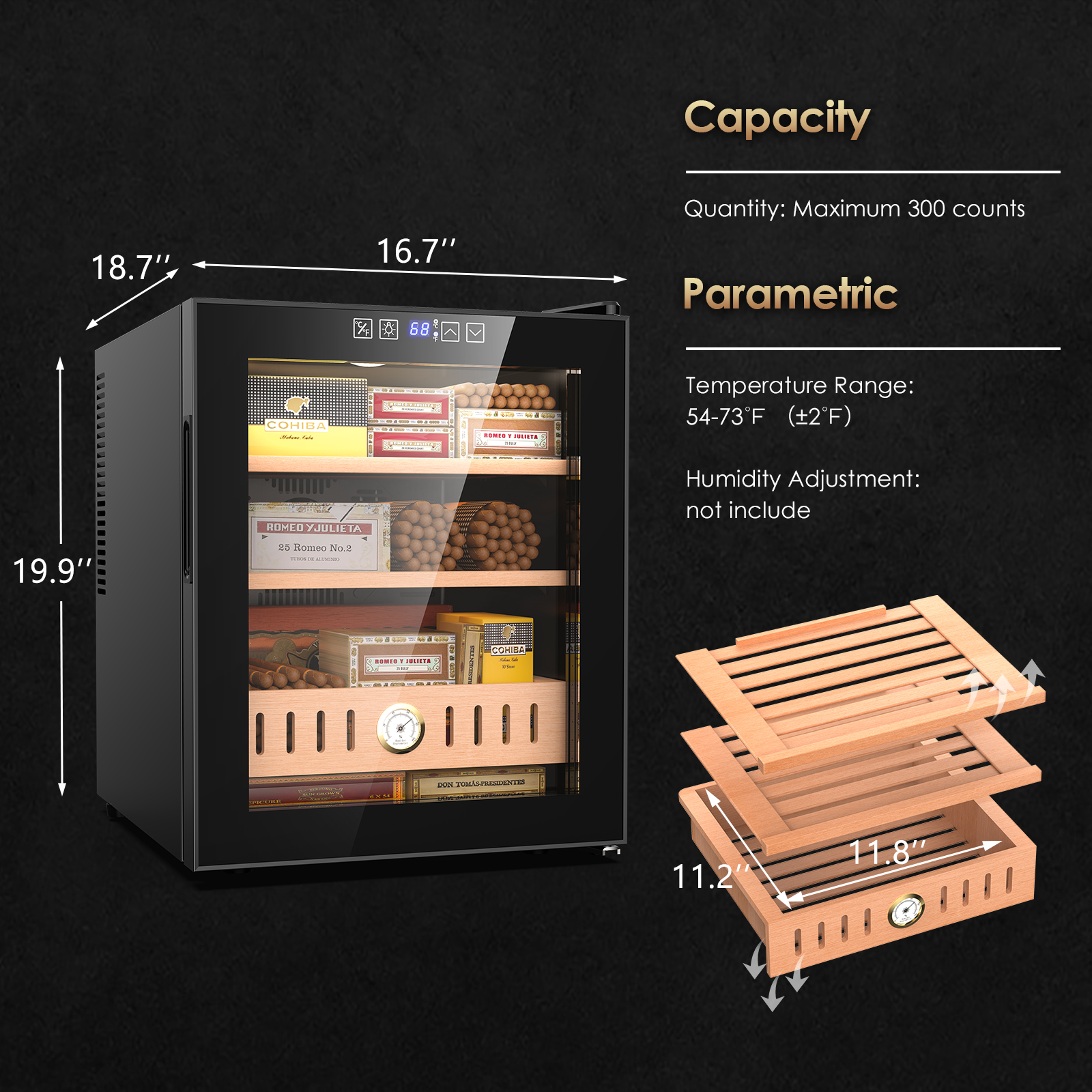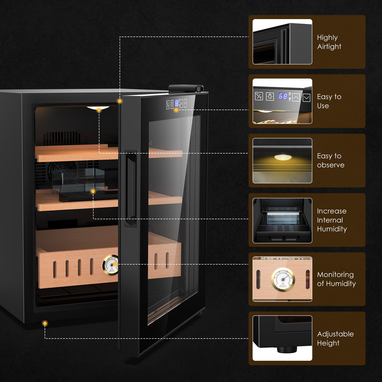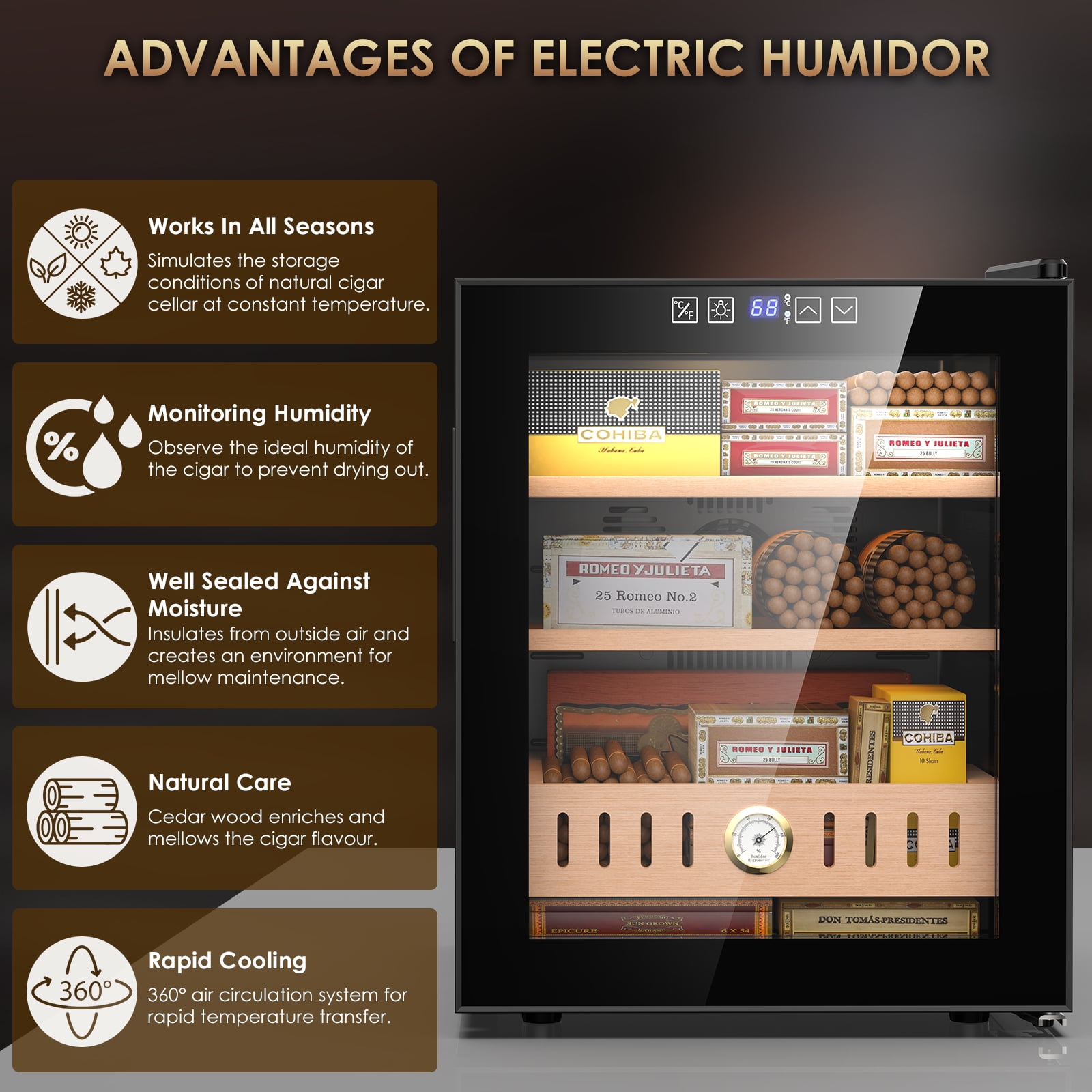 Innovation Design: We have improved the bottom space of the humidor, unlike other brand products where the bottom cannot be stored. This makes it easier for us to use the space more wisely to store more cigar collections, which is equivalent to an extra layer of space for you to display. Maintaining the Flavour: Made of high quality Spanish cedar wood frame. It will naturally emit aroma when you open the door, which not only moisturises your cigars, but also removes odours and prevents them from drying out and becoming mouldy. Our humidors have cut-outs in the drawer fronts and shelves to allow for better air circulation and keep your cigars in top condition. Rapid Cooling: Adopting semiconductor cooling technology, it effectively maintains air circulation and provides stable cooling environment for smarter storage. It works without any vibration, which is both energy efficient and environmentally friendly. Temperature range: 54-73°F (Note: This product can only cool down below the ambient temperature, it cannot warm up.) Excellent Sealing: The door is sealed with thickened sealing strips to effectively isolate the external heat. Double-layer mirror glass effectively protects against UV rays. Comes with water tank and humidifier strip, you can add water to increase the humidity inside and watch the humidity change with the hygrometer on the drawer. Gift for Men: Can be placed in the living room, study, bedroom and wine cellar. Perfect gift for fathers, friends, husbands as milestone birthdays, retirement, Christmas, anniversaries. (Note: Humidity cannot be adjusted, but can be increased with the included sink or humidifier.)