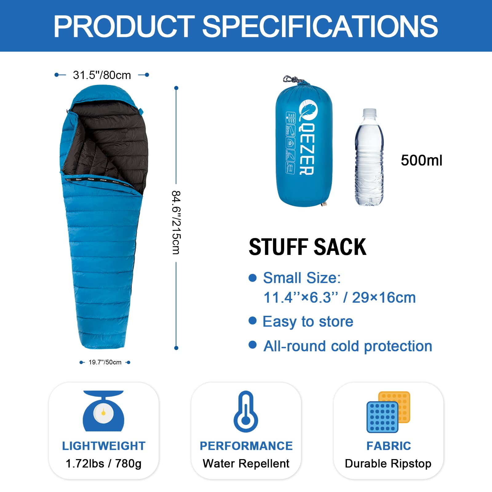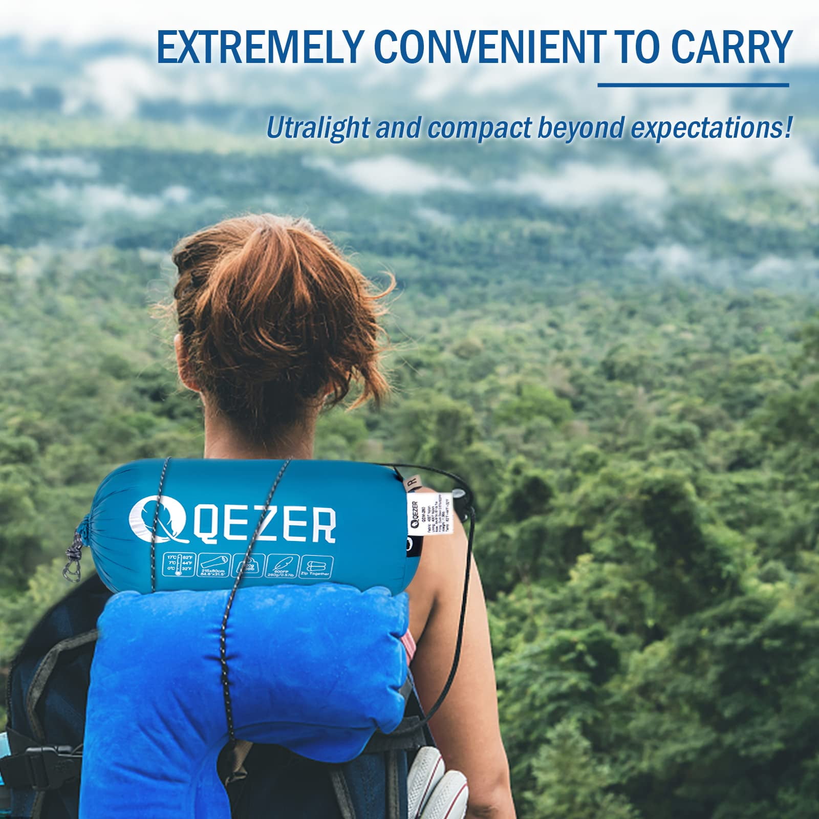 QEZER Ultralight Down Sleeping Bag for Adults 37-59 Degree F with Compression Sack for Backpacking, Hiking and Camping (Blue)