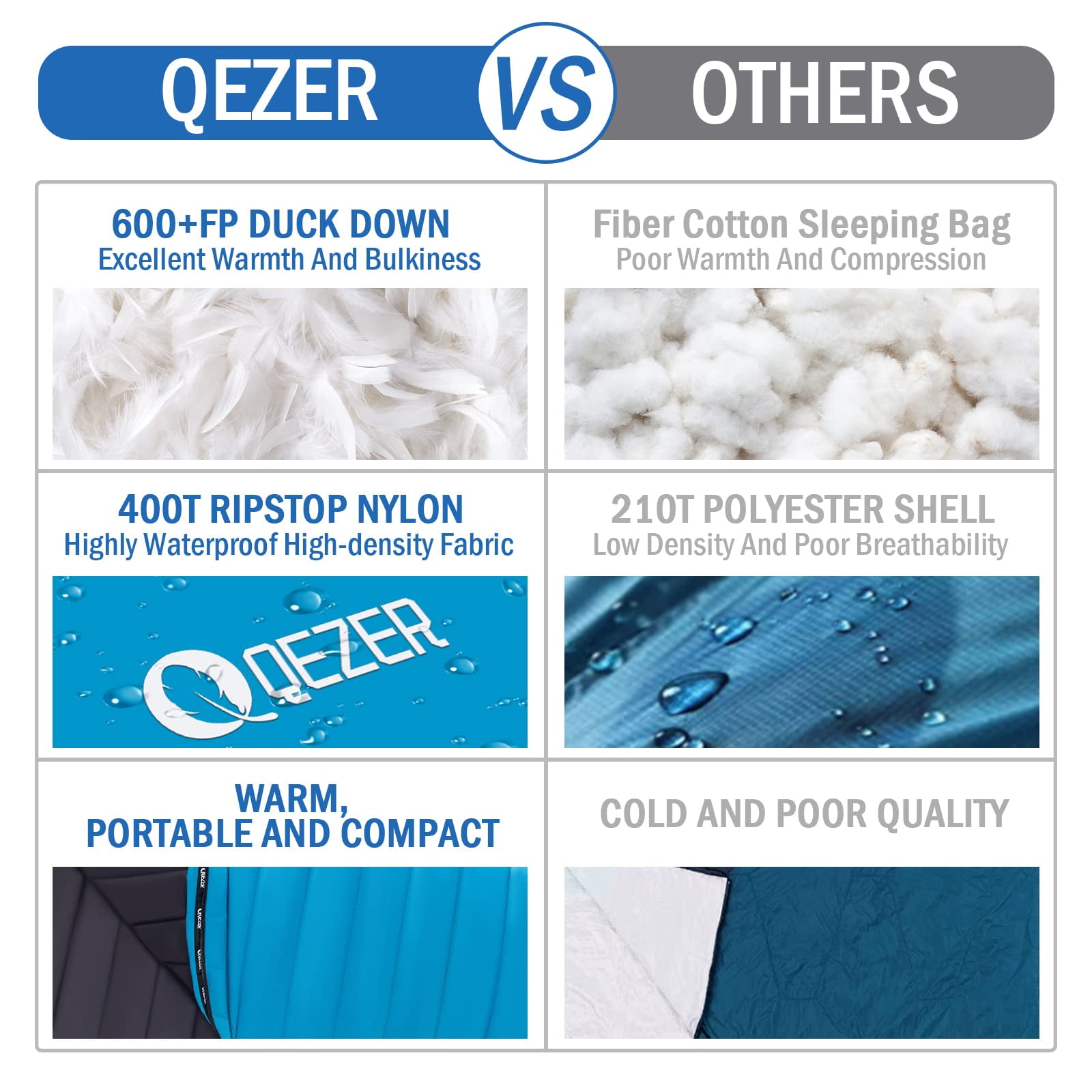 【KEEP WARM】The adult sleeping bag is filled with 260g selected duck down with 600 Fill Power, suitable for warm weather. Pure natural and healthy material, fluffy and soft, no odor or impurities. The sleeping bag specially adds a 1.6 ” cloth strips for wind protection. Comfortable Temperature:59°F-68°F, Minimum Temperature: 45°F. 【KEEP WARM】The adult sleeping bag is filled with 260g selected duck down with 600 Fill Power, suitable for warm weather. Pure natural and healthy material, fluffy and soft, no odor or impurities. The sleeping bag specially adds a 1.6 ” cloth strips for wind protection. Comfortable Temperature:59°F-68°F, Minimum Temperature: 45°F. 【 LIGHTWEIGHT & COMPACT 】 Use size: 84.6″ x 31.5″, Storage size: 10.2″ x 6.7″ (dedicated compression storage bag), Weight: 1.36lbs. It is about half the weight and volume of a polyester cotton sleeping bag. It is super compact and easy to carry. (Note: The product is extremely compressed when stored, it is recommended to ventilate for 3-4 hours after opening.) 【 EXCELLENT DESIGN 】The Mummy Sleeping Bag has a snug fit and is lighter than Envelope Sleeping Bag. The bottom adopts a wide trapezoidal, you will not feel cramped when sleeping. More spacious than ordinary mummy sleeping bags. The inner bag can hold small items such as keys and mobile phones. Attach left and right zippers and can also be used as a 2 person sleeping bag, perfect for couple travel. 【 DURABLE & LONG LASTING 】The outer and inner layers of the lightweight sleeping bag are made of 400T 20D tear-resistant nylon fabric, ultra-high-density fabric with excellent waterproof & windproof performance, and also prevent down overflow.The backpacking sleeping bag is small and practical, easy to carry, suitable for camping, backpacking, hiking, adventure, mountaineering, emergency escape, etc. 【 SATISFACTION GUARANTEE 】QEZER always provides our customers with the best sleeping bag products and services. If you have any product questions, please contact us, we will respond sincerely and do our best to keep you satisfied. 【 SLEEPING BAG LINER 】It also can be used as a sleeping bag liner in winter.