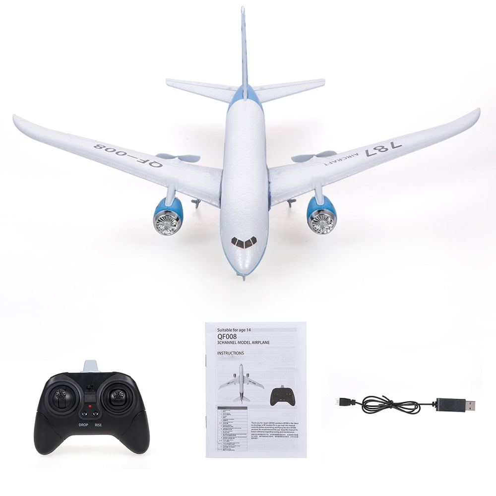 Functions: Turn left/right, turn up/down, accelerate/decelerate, loop. High Degree of Authenticity: This rc airplane is designed based on the latest giant airbus 787, which features perfect smooth surface and exquisite details to achieve a high degree authenticity. 3 Channel Design: three-channel design includes a channel to control turn left and right, a channels to control take off and landing and a channel to control the plane throttle. 6-Axis Gyro: 6-axis flight control system with adjustable gyro sensitivity guarantees more stability for the beginners to master easily, which is a good gift for the beginners and children. Powerful Engine: Powerful engines with two motors make the airplane could take off from the ground easily. High efficiency motor-battery combo achieve 12 minutes flying time. Two Types Of Rudder: The small rudder mode suits beginners for easy to operate; the big rudder mode fits professionals for providing clever operations such as rolling and looping. Easy to Fly: The single wing layout makes it convenient for operation. The airplane is easy to fly even you have never flown a model before. Specifications: Item Name: 787 Aircraft Model: QF008 Color: White Main Material: EPP Material Remote Controller: 2.4Ghz 3CH Motor: Coreless 720*2 Motor Remote Distance: 500m/1640ft Wind Resistance: <4 level Flight Time: About 12 minutes Charging Time: About 45 minutes (0.5A charging current) Battery for Aircraft: 3.7V 300mAh 25S Li-po Battery Remote controller battery: 3 * AA Battery (not included) Plane size: 550*445*145mm/21.65*17.52*5.71in Age: ≥14 Package List: 1 * Aircraft parts 1 * Remote Controller 2 * Spare Propeller (1 * CW Propeller & 1 * CCW Propeller) 1 * User Manual 1 * USB Wire