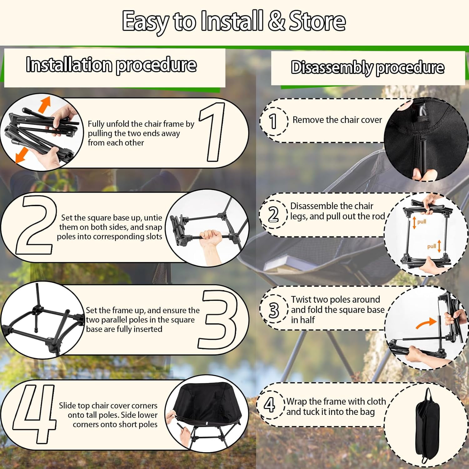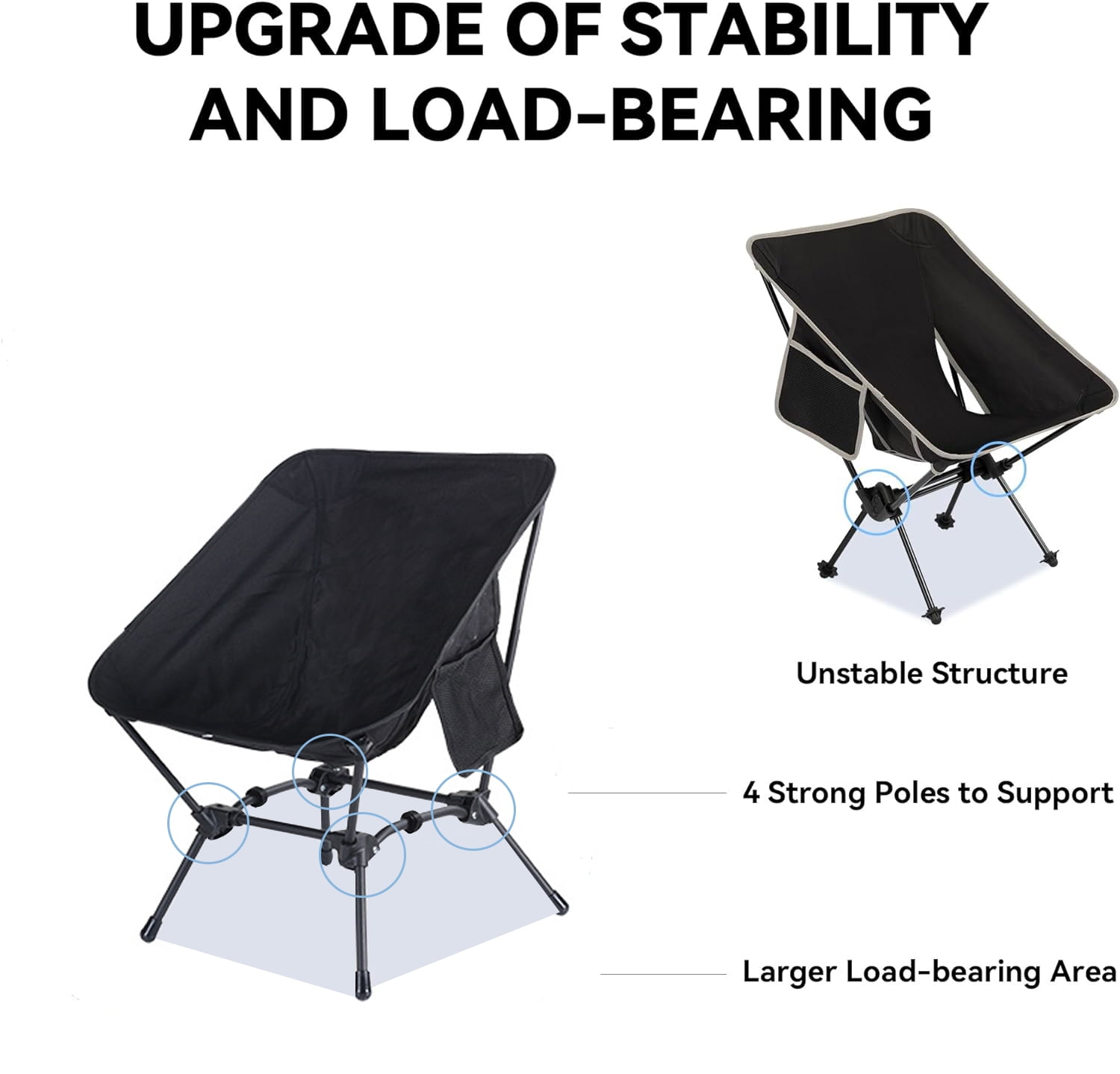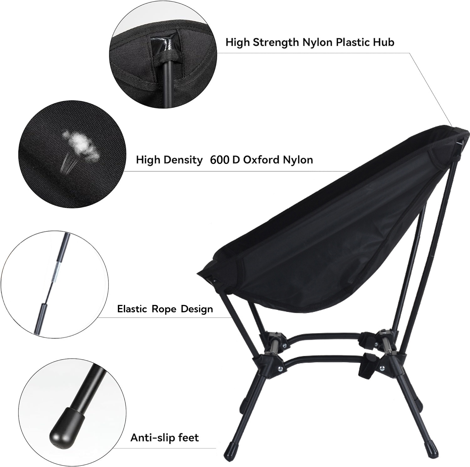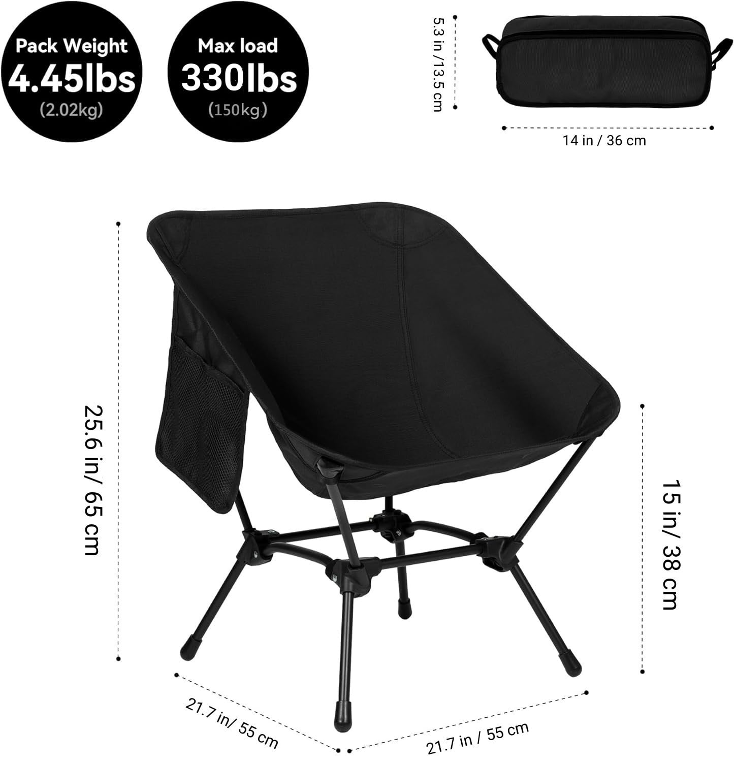 MATERIAL Crafted from highly stretchable 600D Oxford fabric with reinforced double seams, this chair provides stable support for endless leisure time. Enjoy unparalleled comfort no matter where you are. SIZE Unfolded, the chair measures 16.5″ (L) x 16.5″ (W) x 25.6″ (H), with a moon-shaped deep seat for ultimate relaxation. When folded, it compacts to 14.5″ (L) x 5.5″ (W) x 5.5″ (H), making it easy to carry on your back or while cycling. Despite its compact size, it supports up to 330 lbs. PORTABLE The adjustable bracket allows you to choose between two heights. Equipped with a storage bag, transportation is a breeze, letting you take comfort wherever adventure calls. EASY TO SET UP Our tip-proof foldable chair is an outdoor solution that you can set up in just 5 seconds. Our high-back camping chair poles basically pop into place on their own. Then, the fabric seat cover fits just over the 4 poles. Two velcro straps help to fold up quickly so you can tie the poles together on one side first and then the other side.