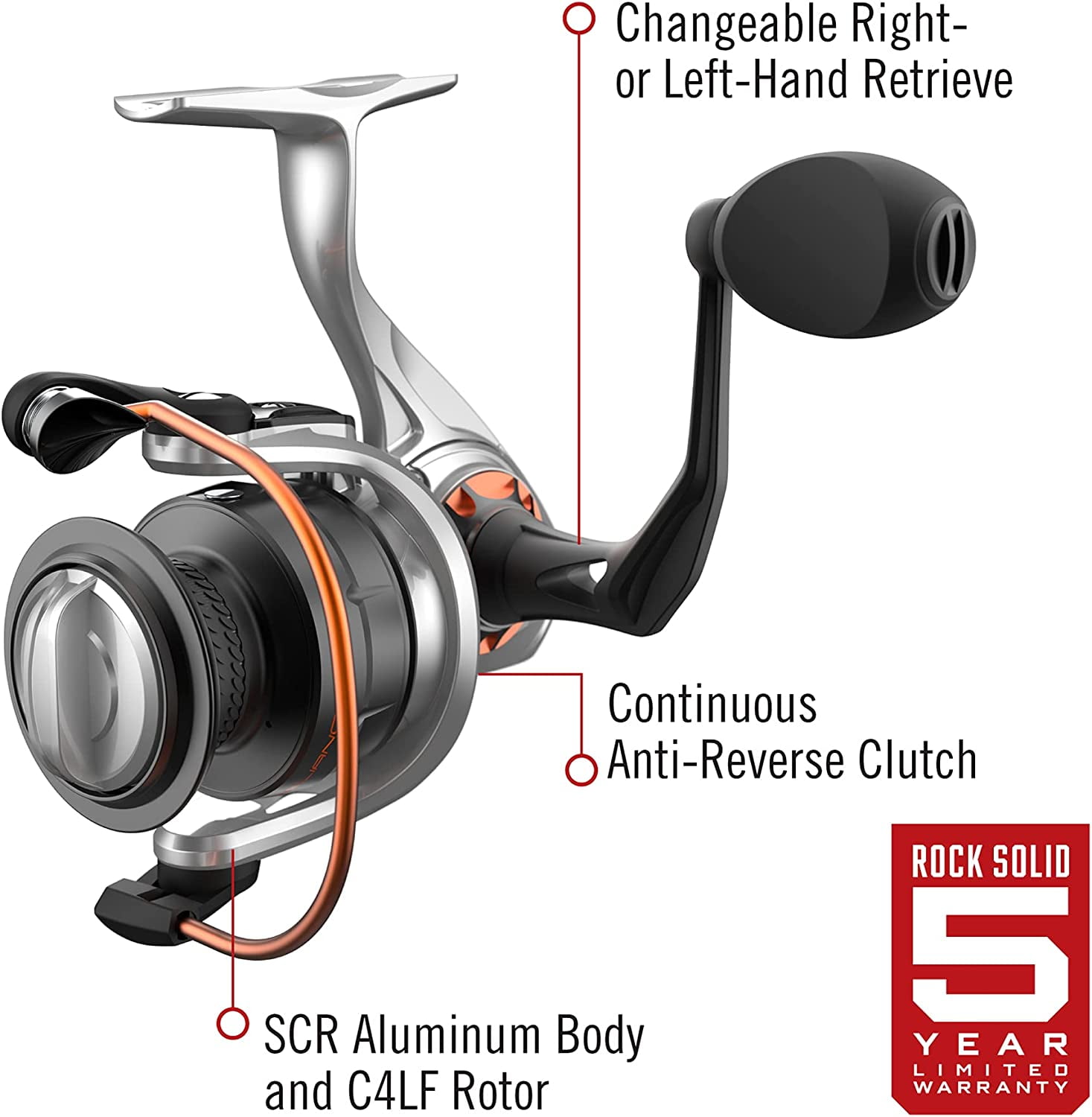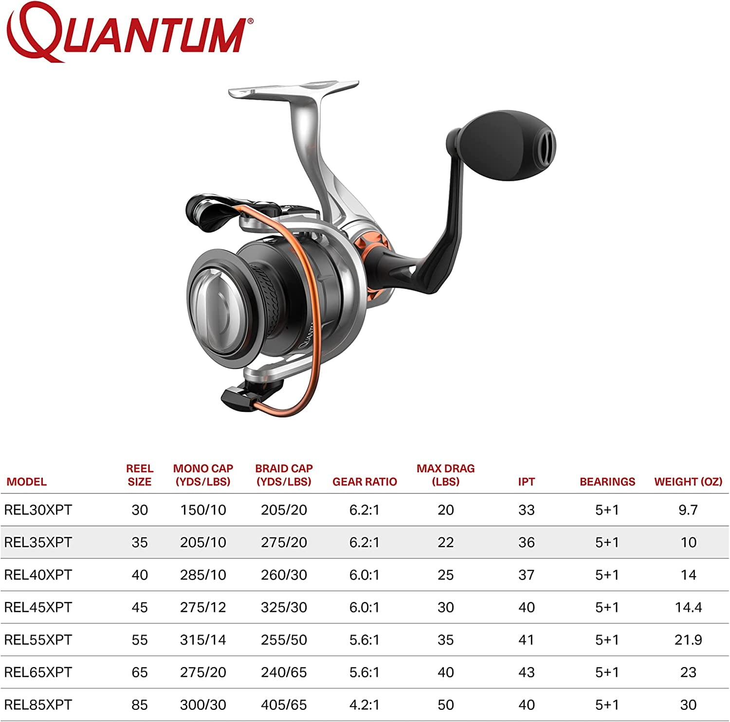 ULTRA-DURABLE PERFORMANCE: Long after its competitors fizzle out the Reliance size 35 spinning reel performance is designed with a durable aluminum body, forged aluminum spool and sturdy one-piece K-alloy handle, to keep on fighting TROUBLE-FREE SALTWATER USE: Quantum Reliance reel features saltguard protection and 6 anti-corrosion bearings (5 + 1) to take on any fish in any element, equally at home in freshwater or saltwater. The roller bearings provide instant anti-reverse for immediate hooksets and super smooth performance for any application WATER-TIGHT SEAL: Ready to go in all elements including rain, sleet or high winds, thanks to the water resistant fully sealing and maintenance free design that protects the reel’s bearings, gears and other critical components from water corrosion, sand and wear SUPERIOR DESIGN: This spinning reel is constructed with an SCR aluminum body and CFLF rotor, 6.2:1 gear ratio and 36 IPT for a smooth and consistent retrieve. The reel features the convenience of a changeable right- or left-hand retrieve. The ceramic carbon drag system can hold up to 22-pounds of max drag giving you the ultimate in design and strength to reel in your prize catch ROCK-SOLID PROTECTION: All Quantum gear is protected for a rock-solid 5-years from original date of purchase against defects in workmanship and/or materials. Engineered for real-world performance, your Quantum fishing rods, reels, and combos are guaranteed to work as hard as you do, year after year