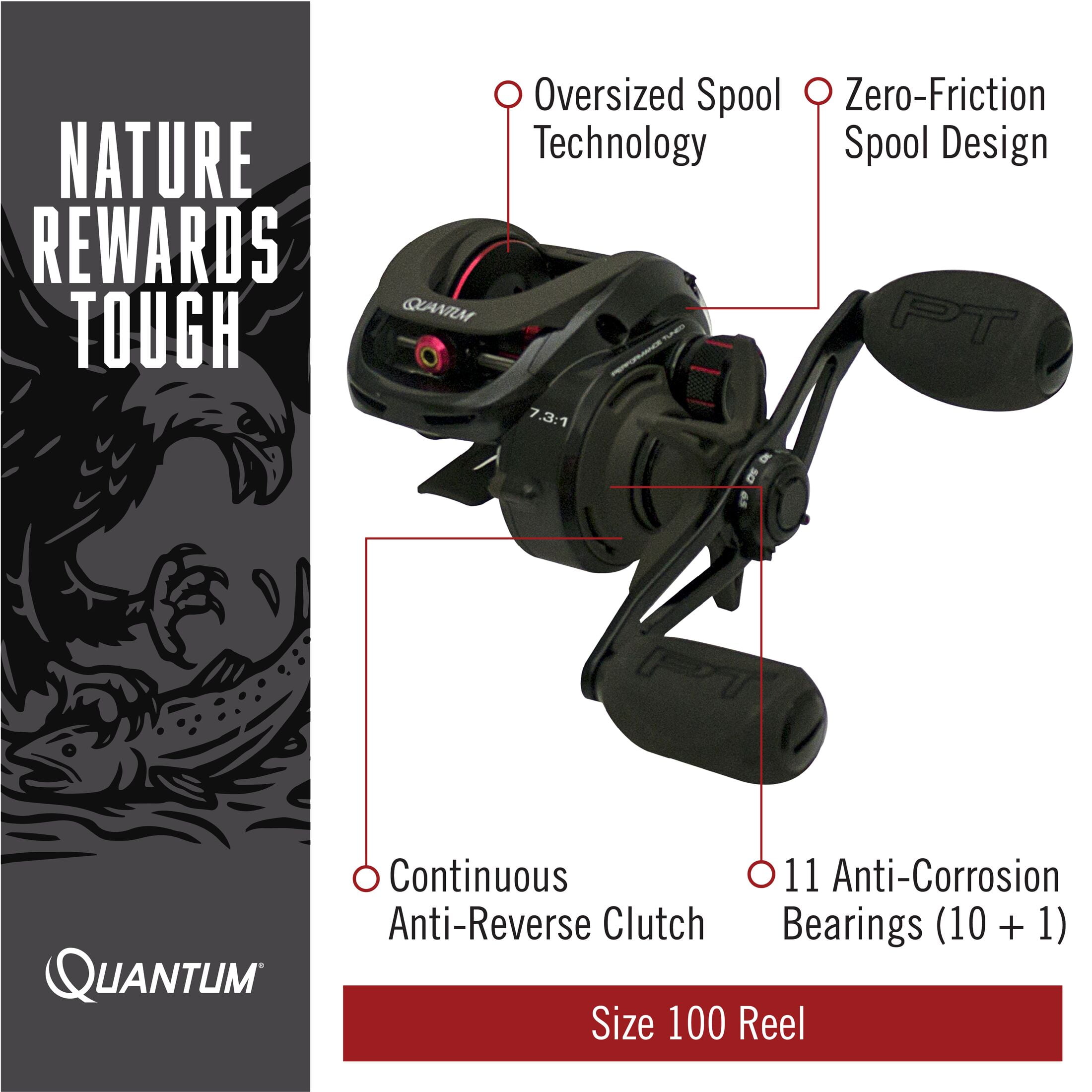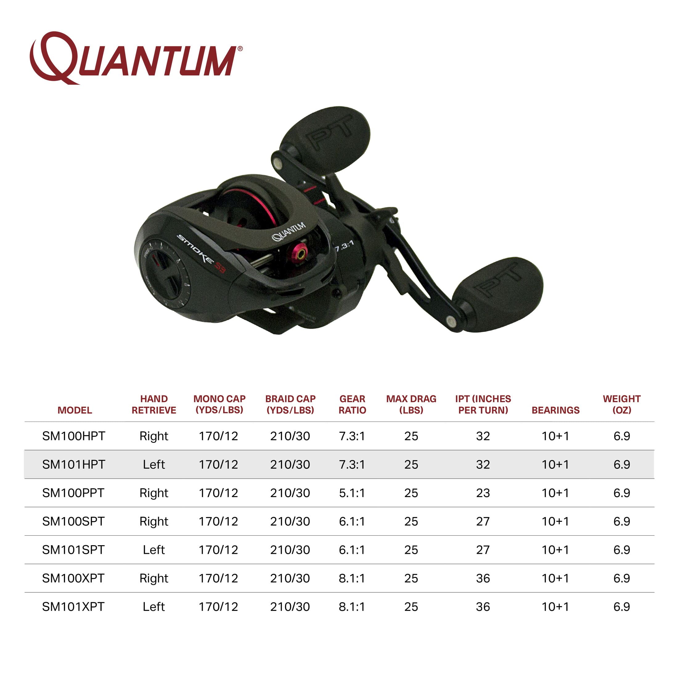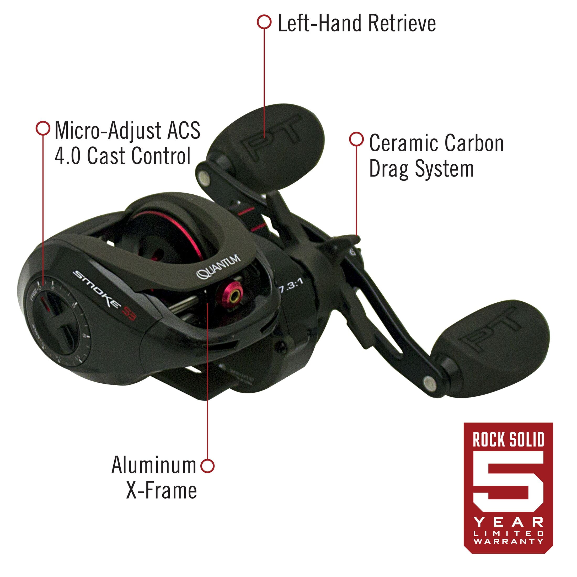 ULTRA-DURABLE PERFORMANCE: The Quantum Smoke size 100 baitcast reel has been quality engineered from top to bottom. So while most of the fishing industry focuses on smaller reels with tiny spools, the Smoke is designed with a larger 35.5 mm spool in a very compact aluminum frame with a zero friction spool design that’s always in its element TROUBLE-FREE USE: The Quantum Smoke reel features saltguard protection and 11 anti-corrosion bearings (2 PTS, 3PTAC, 5BB, 1RB) to take on any fish in any element. The roller bearing provides continuous anti-reverse for immediate hooksets and super smooth performance for any application. It features a left-hand retrieve and large EVA handle knobs SUPERIOR DESIGN: This baitcast reel features a 7.3:1 gear ratio and a 32 IPT (inches per turn) for a smooth and consistent retrieve. The ceramic carbon drag system can hold up to 25-pounds of max drag giving you the ultimate in design and strength to reel in your prized catch VERSATILE USE: With a mono line capacity of 150/14 yds/lbs and the ability to hold up to 210-yards of 30-pound braided line, this reel offers smooth performance and unrivaled durability. Ideal for targeting medium and heavy species from walleye to bass, catfish, striper and more ROCK-SOLID PROTECTION: All Quantum gear is protected for a rock-solid 5-years from original date of purchase against defects in workmanship and/or materials. Engineered for real-world performance, your Quantum fishing rods, reels, and combos are guaranteed to work as hard as you do, year after year