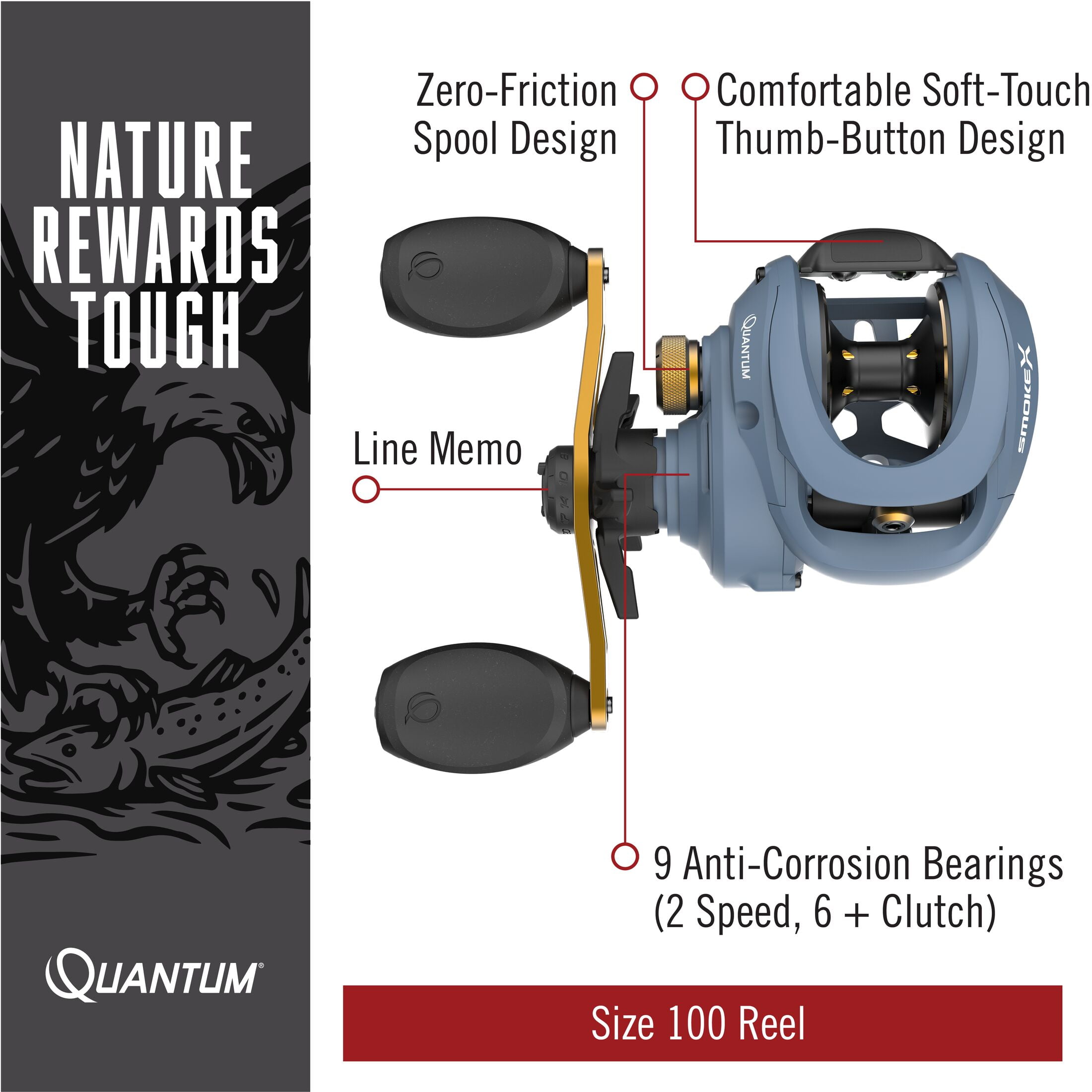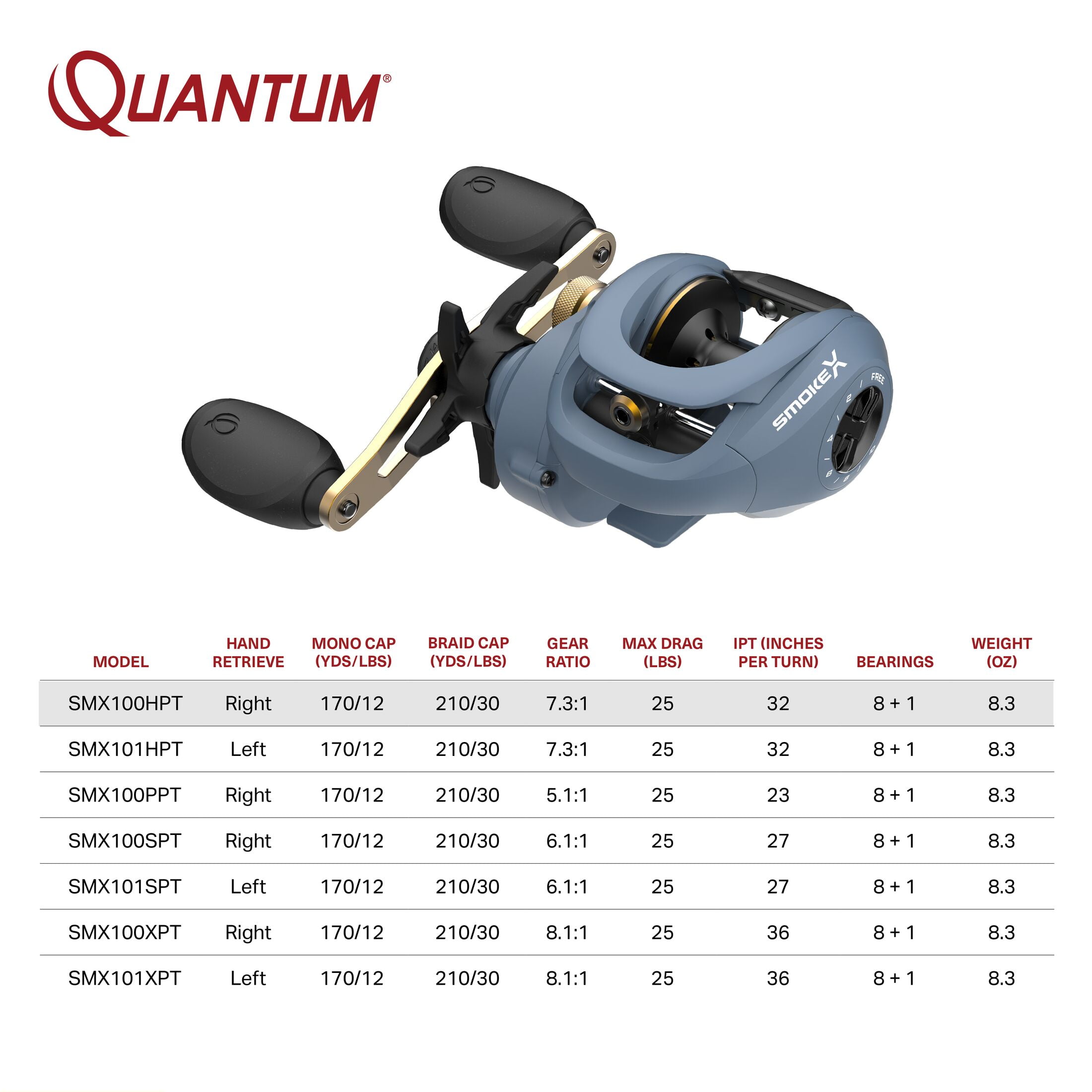 HEIGHTENED PERFORMANCE: Quantum’s Smoke X baitcast reel is designed with a saltguard-protected one-piece aluminum frame for durability and ACS cast control for accurate and comfortable operation SMOOTH OPERATION: Built with a Continuous Anti-Reverse clutch and 9 anti-corrosion bearings (2 speed, 6 + clutch, this left-hand baitcast reel promises smooth casts and retrieves SUPERIOR DESIGN: Featuring Quantum’s zero friction spool design, 7.3:1 gear ratio, and 32 inches per turn, this reel delivers premium performance every time. The carbon fiber and ceramic drag system is powerful and has a max drag of 25-pounds VERSATILE APPLICATION: With a mono capacity of 170/12 and the ability to hold up to 210-yards of 30-pound braided line, this reel is great for medium and heavy species such as walleye, bass, catfish, and striper ROCK-SOLID PROTECTION: All Quantum gear is protected for a rock-solid 5-years from original date of purchase against defects in workmanship and/or materials. Engineered for real-world performance, your Quantum fishing rods, reels, and combos are guaranteed to work as hard as you do, year after year