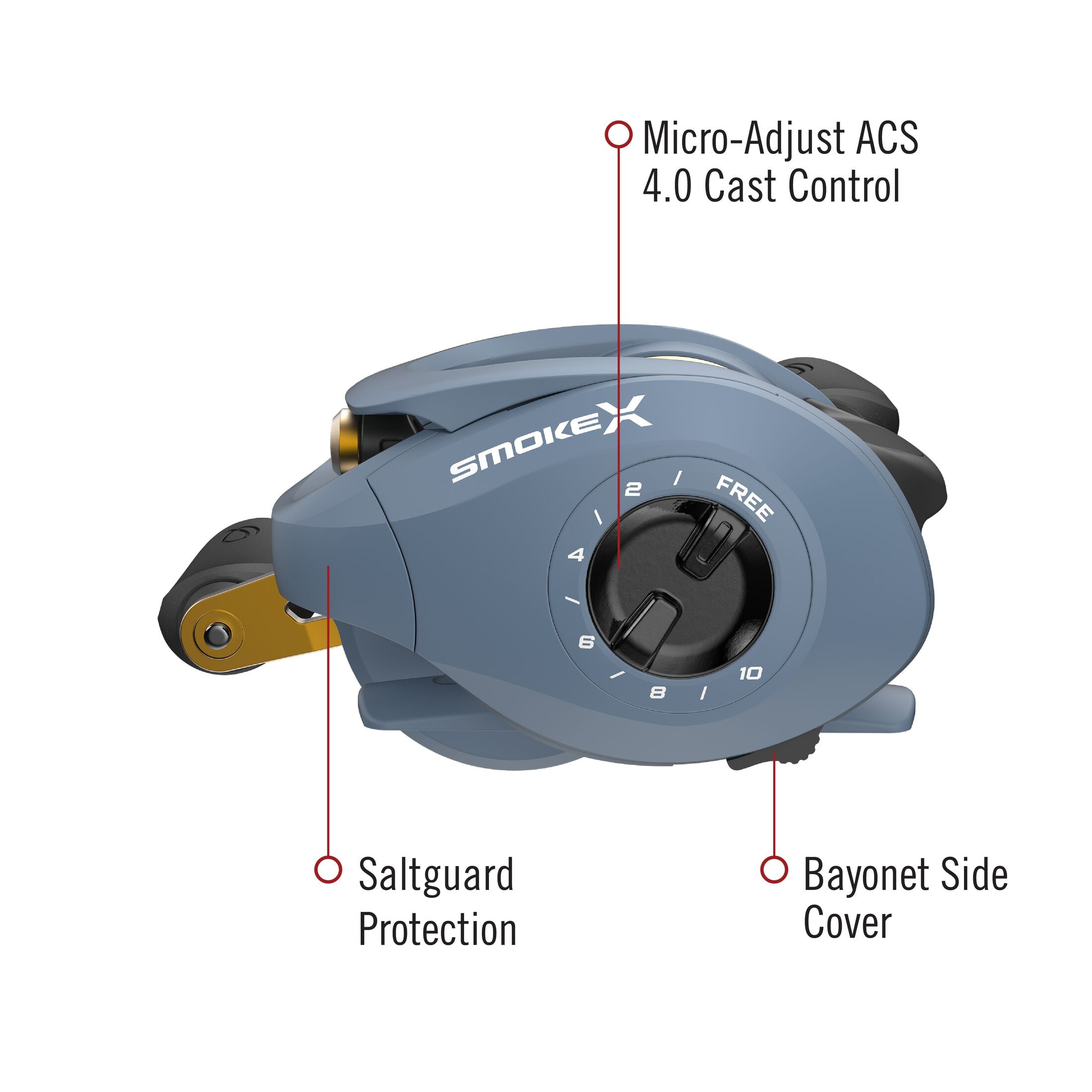 Quantum Smoke X Baitcast Fishing Reel, Size 100 Reel, 7.3:1 Gear Ratio, Right-Hand Retrieve, Blue