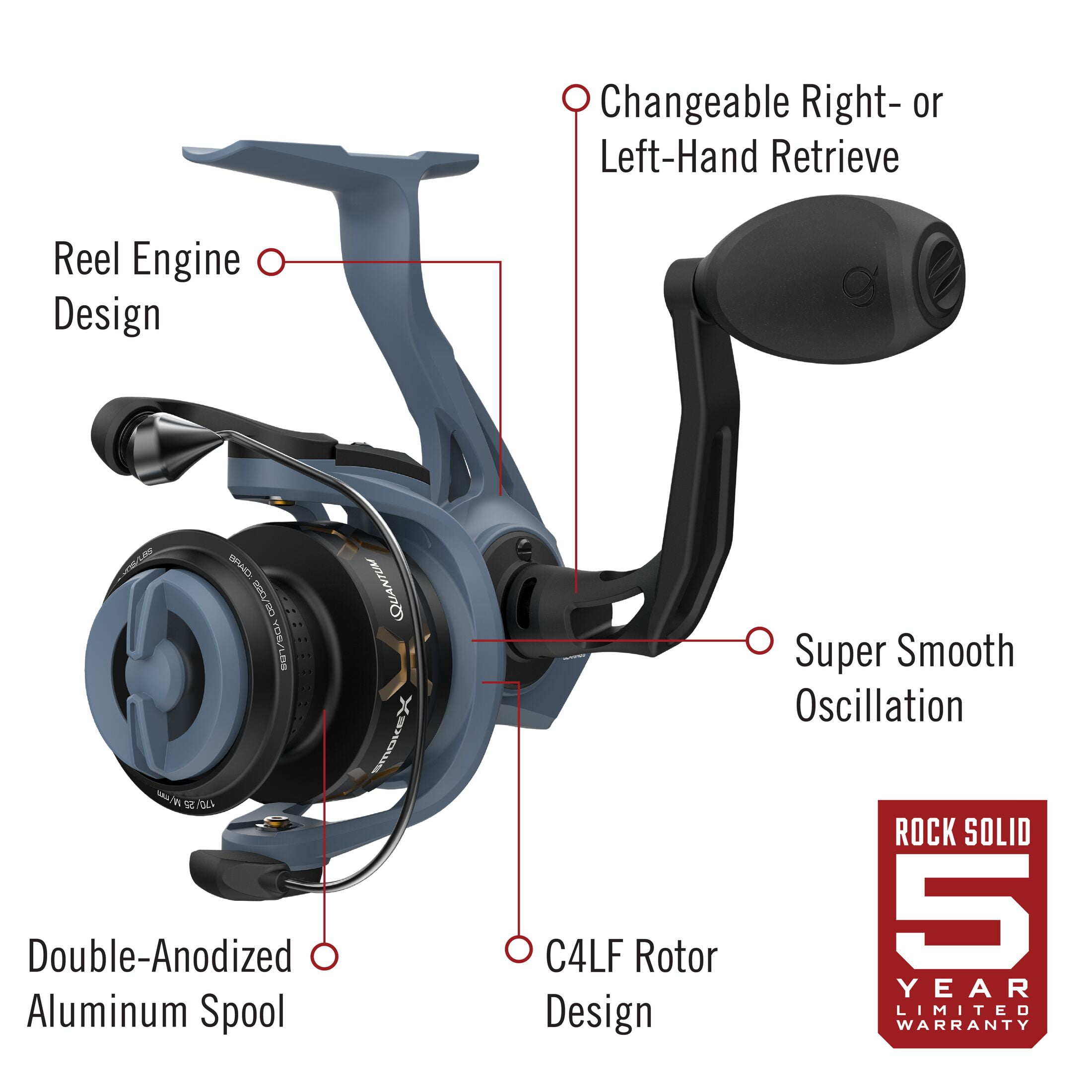 Quantum Smoke X Spinning Fishing Reel, Size 15 Reel, 5.7:1 Gear Ratio, Blue