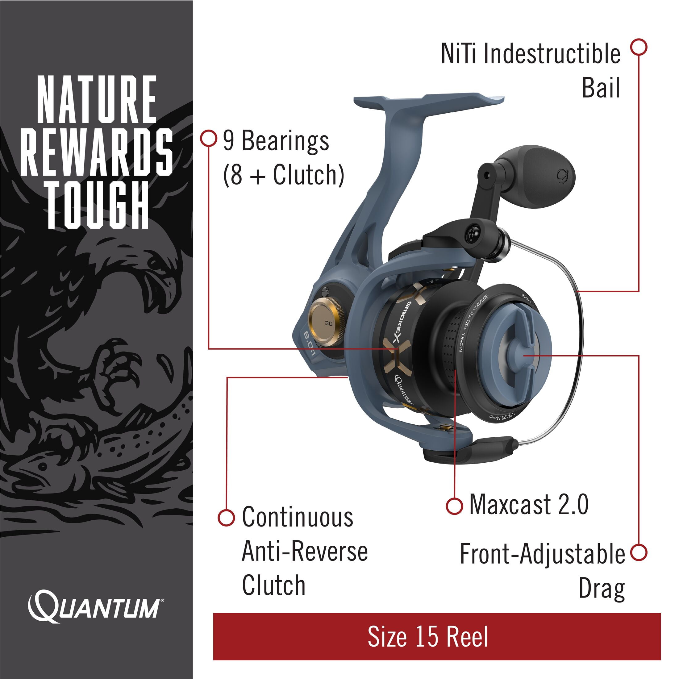 With cutting-edge technologies and an eye-catching design elevating this reel to a new level of spinning performance, Quantum’s Smoke® X spinning reel offers smooth, extended casting and unrivaled durability. Dishing out equal parts smooth and durable, Smoke X emphasizes smoothness with 9 bearings, an ultra-balanced C4LF™ rotor design, and a carbon fiber and ceramic drag system, while also driving home durability with Reel Engine Design (R.E.D), a 1-piece SCR alloy frame with saltguard protection, NiTi™ indestructible bail, and Dura-Lok clutch. Locked down by Quantum’s 5-Year warranty, Smoke X spinning reel is ready to take on any challenge, at any time.