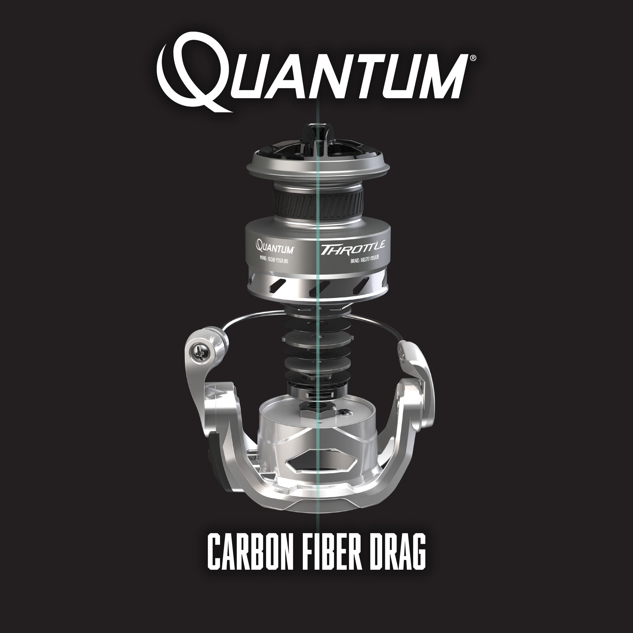 ULTRA-DURABLE DESIGN: Quantum Throttle size 25 spinning reel is designed with a lightweight, durable carbon fiber body and side cover. It features a forged and machined double-anodized spool for lightweight strength and heightened performance versus other spinning reels SMOOTH CASTS AND RETRIEVES: Throttle spinning reels feature 11 bearings and a Dura-Lok anti-reverse clutch for smooth performance and high-powered lockdowns. Changeable right- or left-hand retrieve makes this reel customizable for any angler SUPERIOR DESIGN: This spinning reel features a lightweight, durable carbon fiber rotor, a 6.2:1 gear ratio, and 3 inches per turn for a smooth and consistent retrieve. The carbon fiber drag system has a max drag of 16-pounds for locking down the fish on your line VERSATILE APPLICATION: With a mono capacity of 15/8 and the ability to hold up to 16 yards of 2-pound braided line, the Throttle spinning reel is ready for hauling in light to medium species, like panfish, trout, walleye, and bass ROCK-SOLID PROTECTION: All Quantum gear is protected for a rock-solid 5-years from original date of purchase against defects in workmanship and/or materials. Engineered for real-world performance, your Quantum fishing rods, reels, and combos are guaranteed to work as hard as you do, year after year
