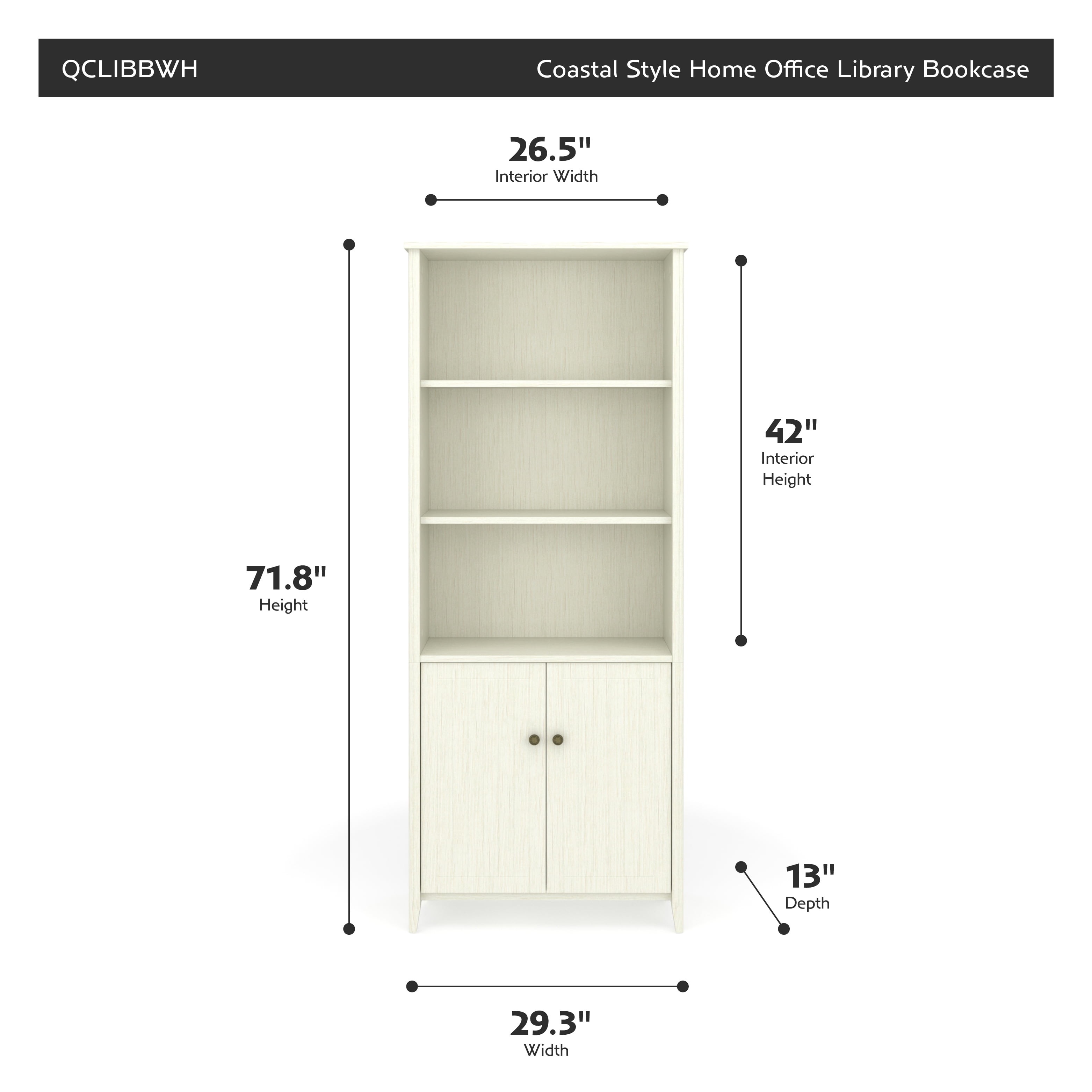 Quarters & Craft High Tide Collection Home Office Library Bookcase, in Weathered White (QCLIBBWH)