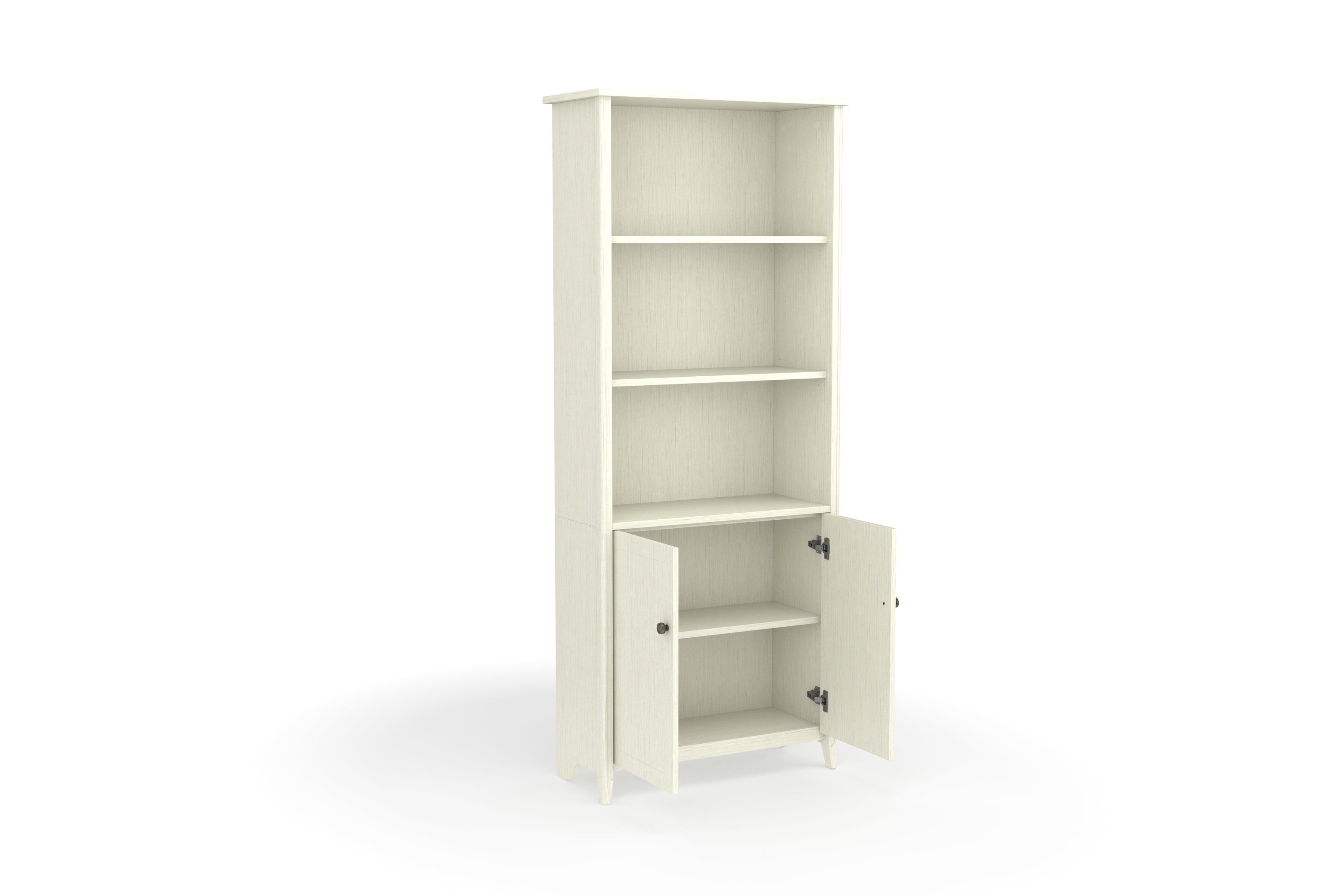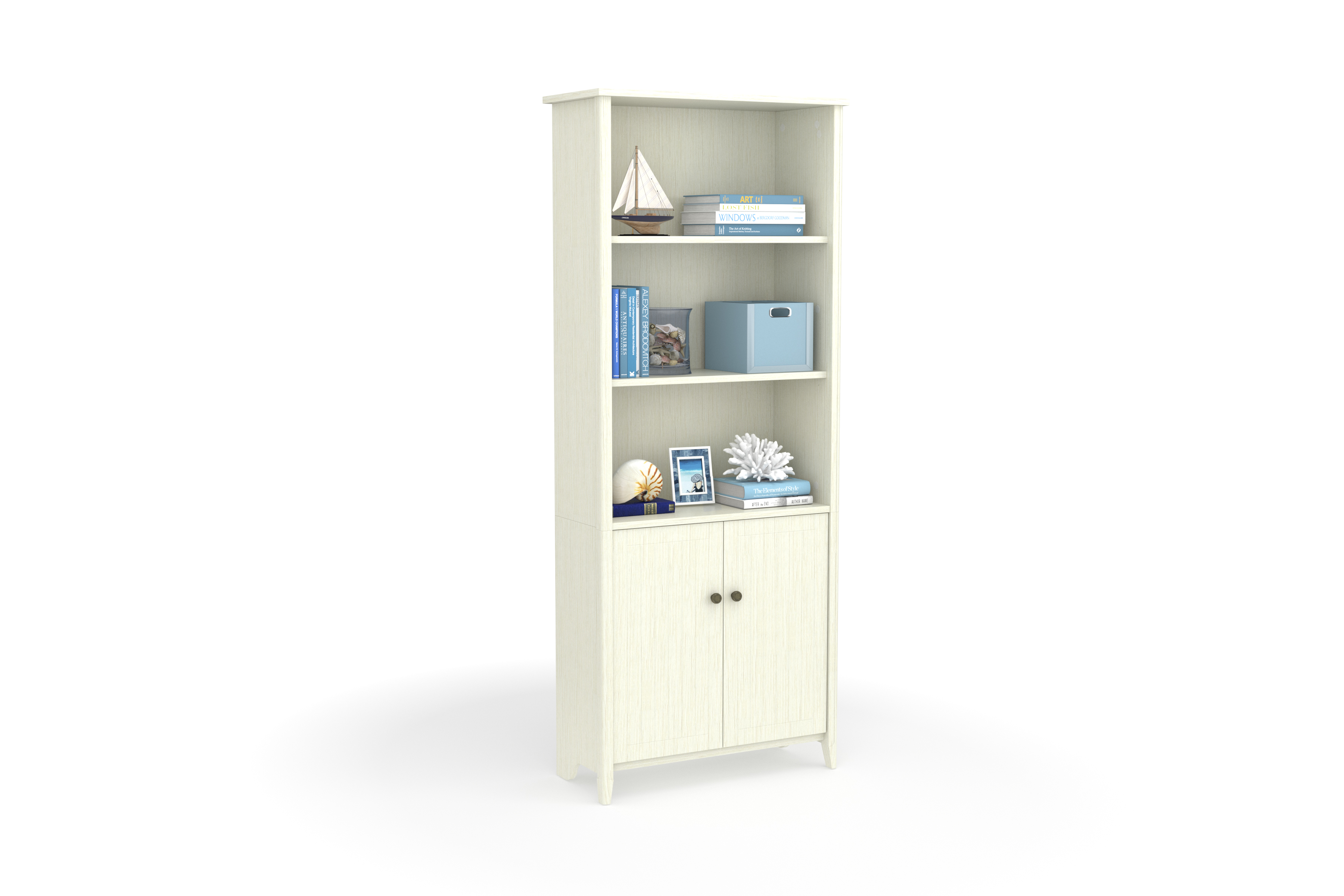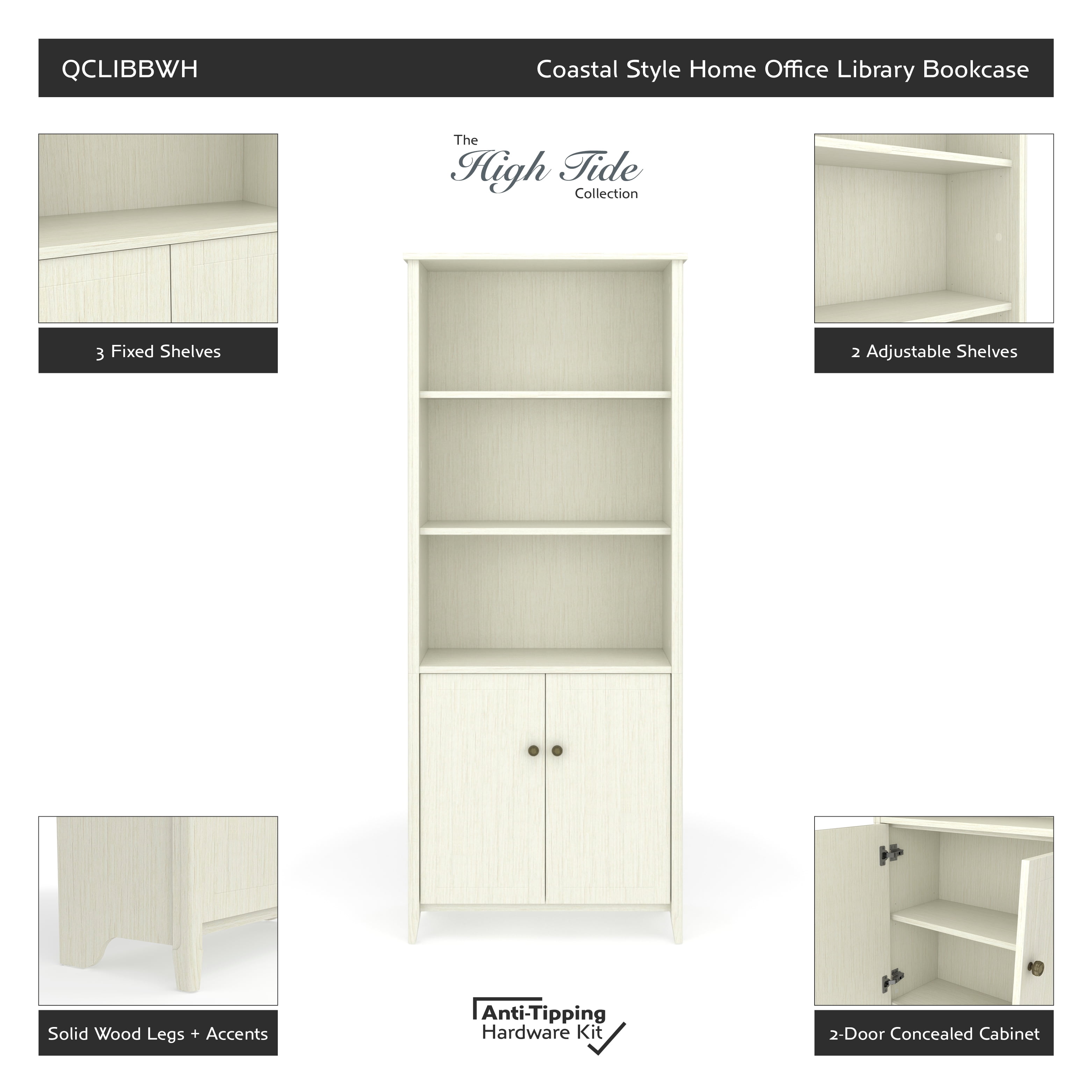 The calming and soothing sea isn’t always close, but the High Tide Collection brings you the essence of the beach experience with commercial-grade furniture featuring a beach bungalow vibe great for home or office Space is premium, this bookshelf with doors can easily slip into your existing living or working spaces and add valuable storage or display space With 5 shelf surfaces, this bookshelf can hold anything from books, decorations, binders, or your family heirlooms Beneath the open shelving area is a 2-door concealed cabinet area ideal for items you don’t want on display The tall bookcase features 3 fixed shelves, one in the 2-door cabinet area, that provide stability for the bookshelf unit 2 adjustable library shelves allow you to scale the unit to the right size for its contents The cabinet doors feature accented hardware in keeping with the collection aesthetic The library bookcase features solid wood legs for a strong base able to support books or decorations This library bookshelf comes with easy, frustration-free hardware that simplifies assembly to save time Real wood accents cover the entire vertical front edges on the front of the bookcase providing a warm feel perfect for home or office The bookcase backing helps stabilize the unit, helps hide power cords, and prevents items from falling behind the unit