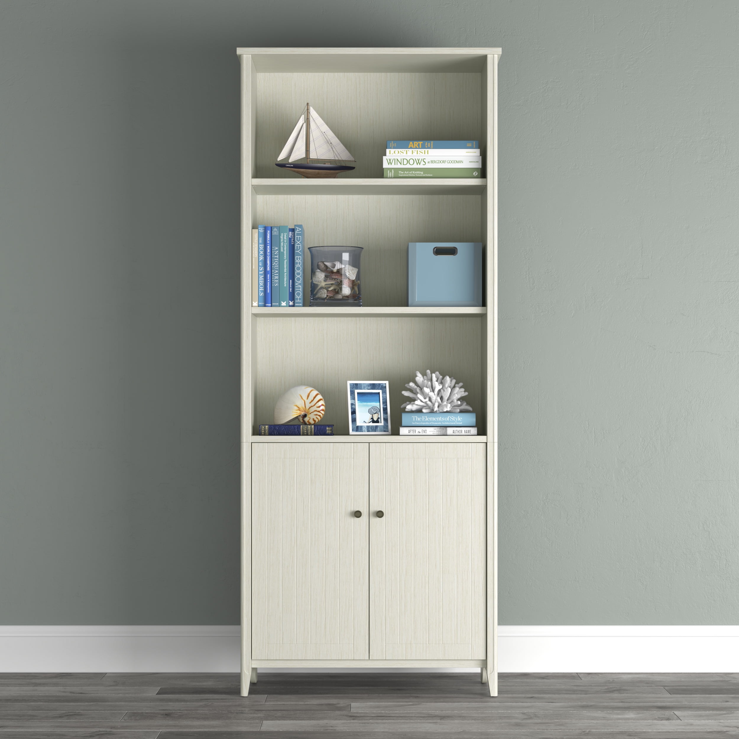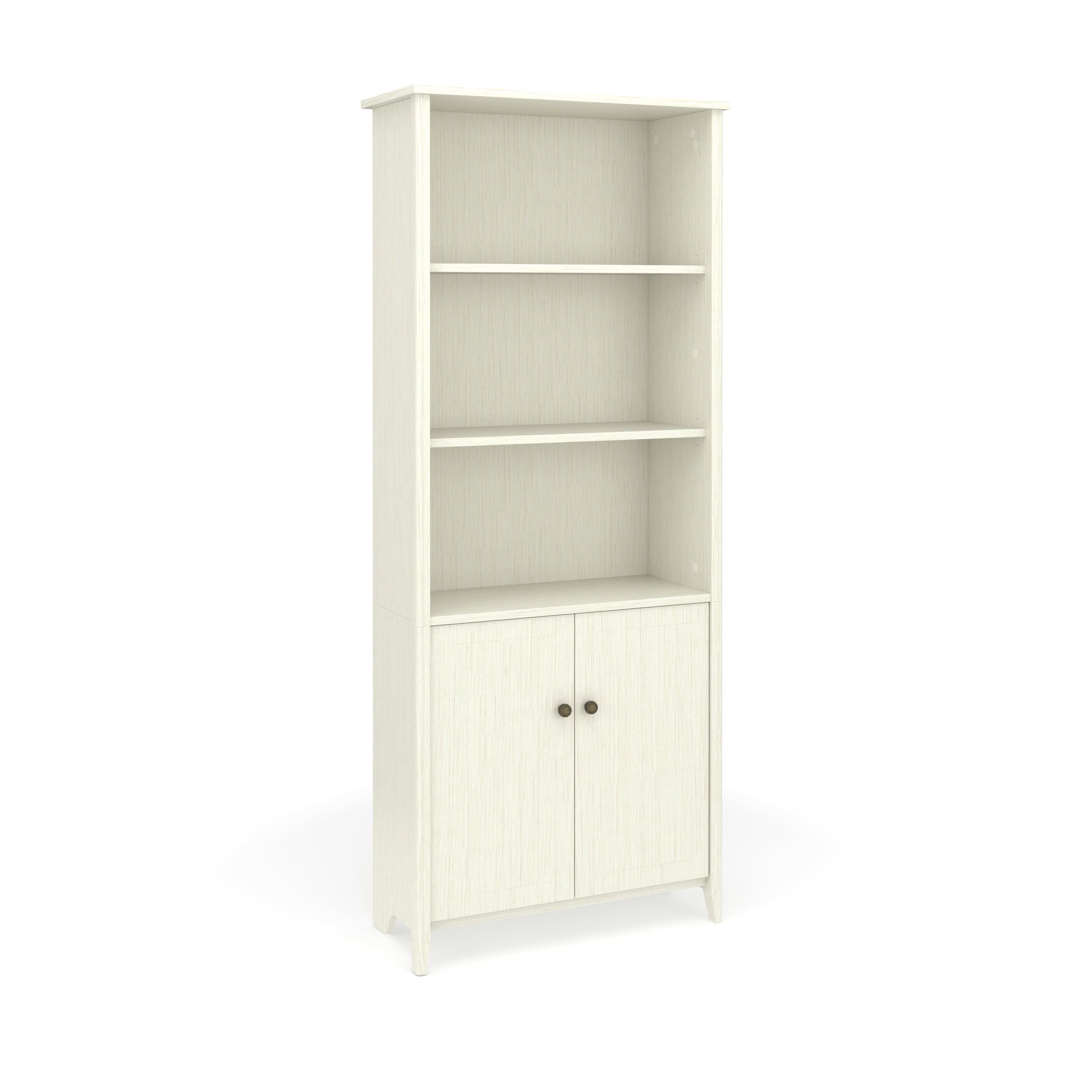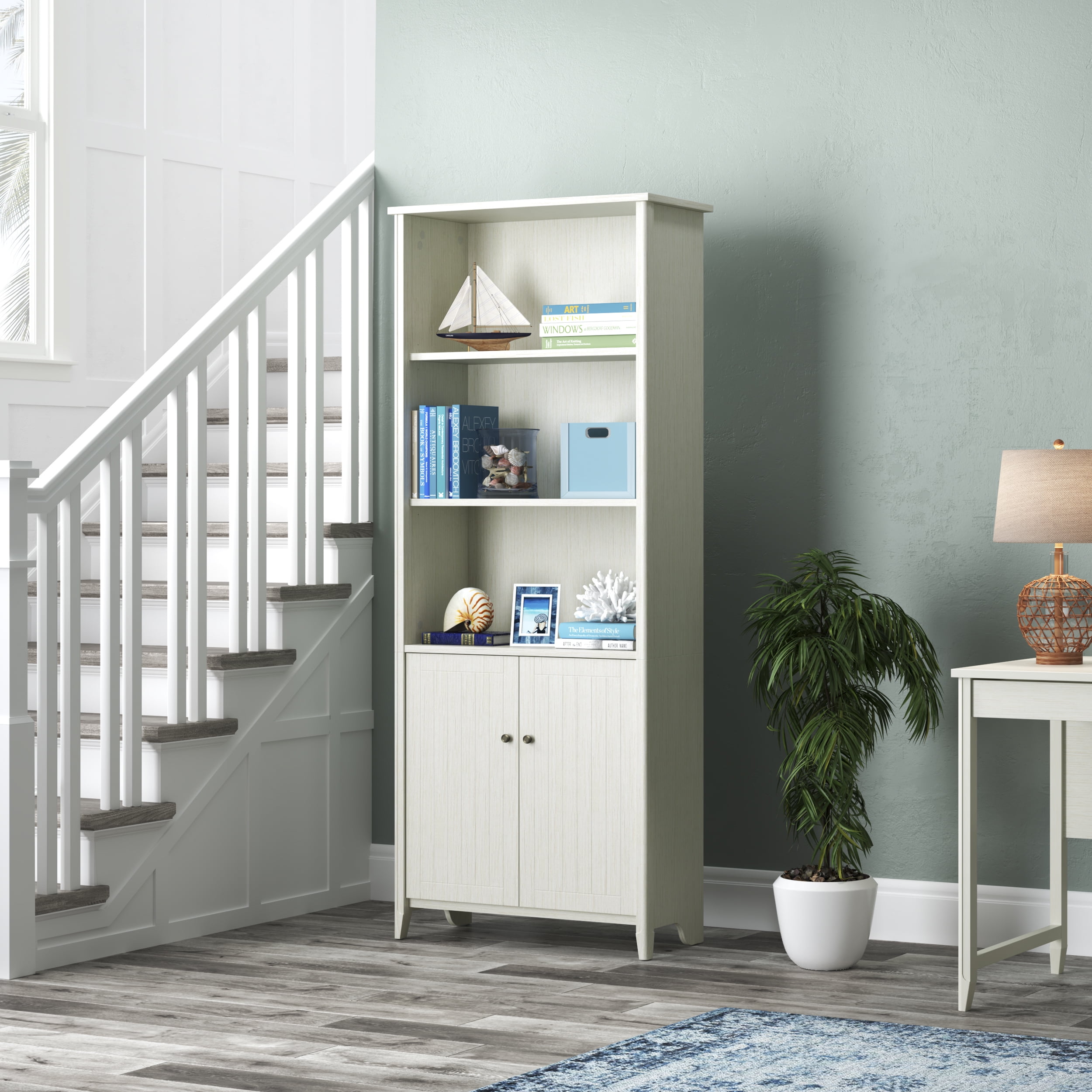 The calming and soothing sea isn’t always close, but the High Tide Collection brings you the essence of the beach experience with commercial-grade furniture featuring a beach bungalow vibe great for home or office Space is premium, this bookshelf with doors can easily slip into your existing living or working spaces and add valuable storage or display space With 5 shelf surfaces, this bookshelf can hold anything from books, decorations, binders, or your family heirlooms Beneath the open shelving area is a 2-door concealed cabinet area ideal for items you don’t want on display The tall bookcase features 3 fixed shelves, one in the 2-door cabinet area, that provide stability for the bookshelf unit 2 adjustable library shelves allow you to scale the unit to the right size for its contents The cabinet doors feature accented hardware in keeping with the collection aesthetic The library bookcase features solid wood legs for a strong base able to support books or decorations This library bookshelf comes with easy, frustration-free hardware that simplifies assembly to save time Real wood accents cover the entire vertical front edges on the front of the bookcase providing a warm feel perfect for home or office The bookcase backing helps stabilize the unit, helps hide power cords, and prevents items from falling behind the unit