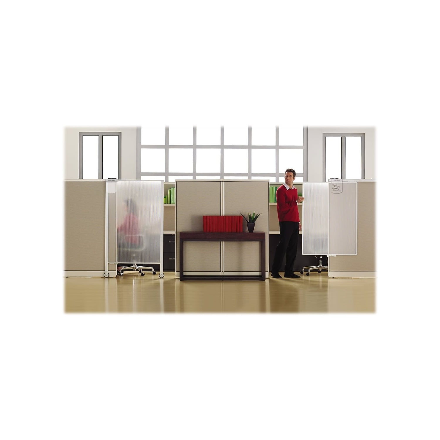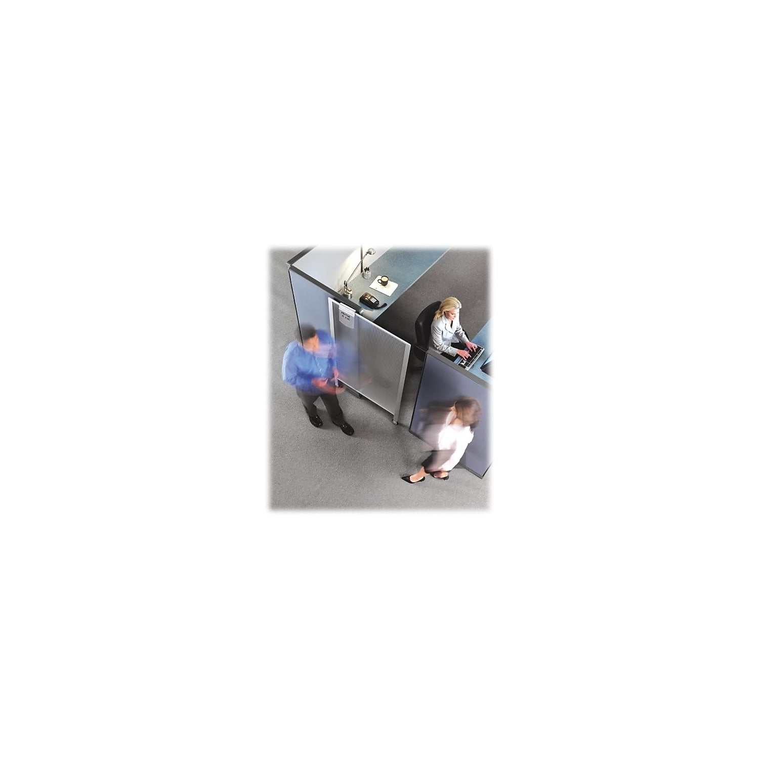 Full-length workstation privacy screen transforms cubicles into an interruption-free work zone. Shatterproof, polycarbonate material is ideal for any office. Screen measures 38\”w x 64\”h and covers openings of approximately 30\” in width. Translucent screen lets natural light shine through. Aluminum frame with two wheels.