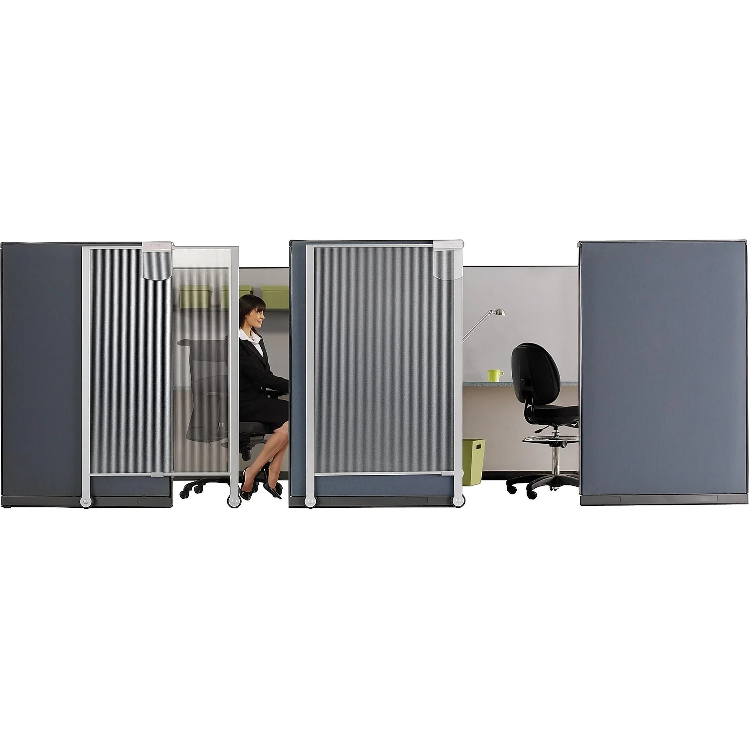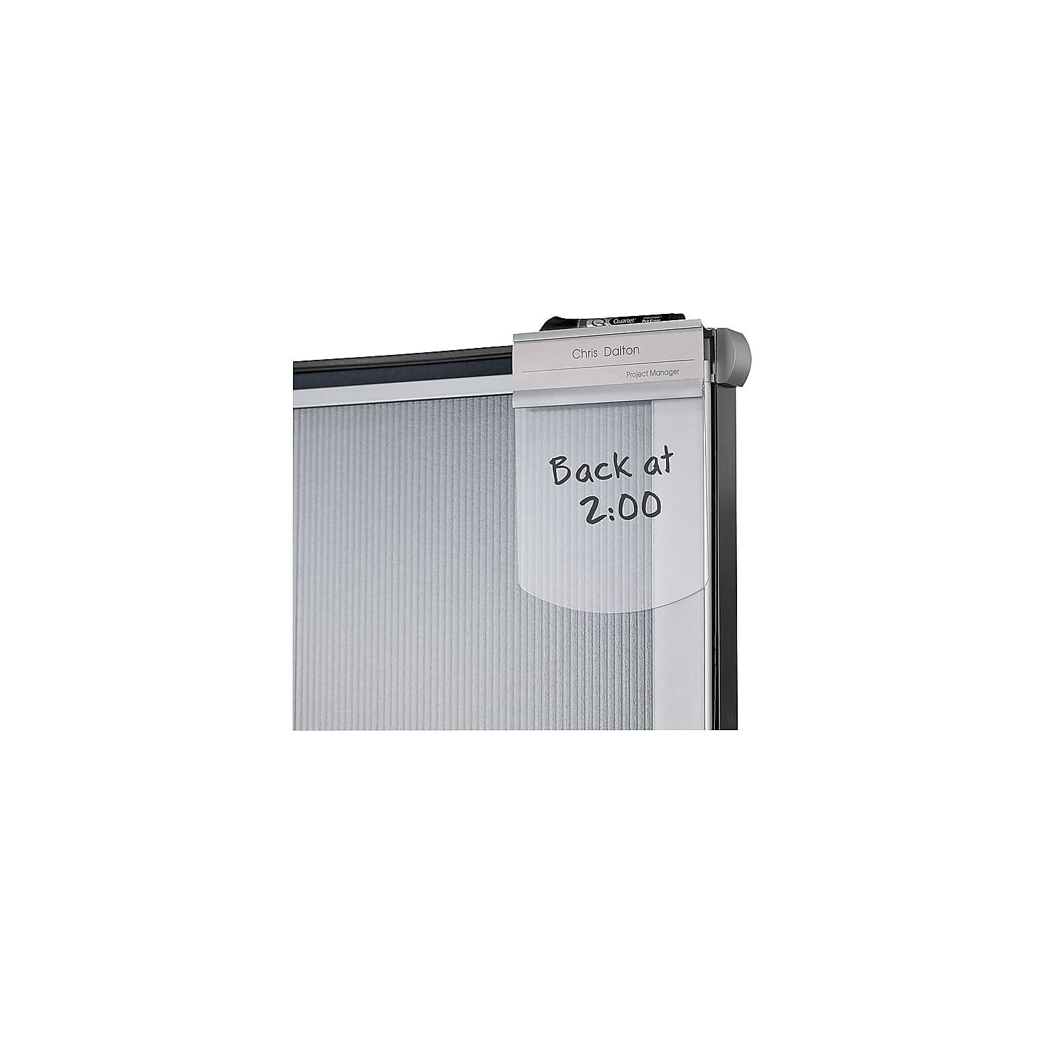 Easy gliding door-like privacy screen mounts to outside of any cubicle panel room divider system. High quality, clear plastic provides glass appearance. Privacy screen has two wheels at the base of the H-frame design. Install on 1-1/4″ to 3-1/4″ thick panels that stand at least 65″ tall. Use included height extenders for panel height over 68″. Privacy screen includes nameplate to identify cubicle user and dry-erase board with a marker. Quartet Workstation Privacy Screen, 38″ x 64″, Rolling, Full Length, Clear