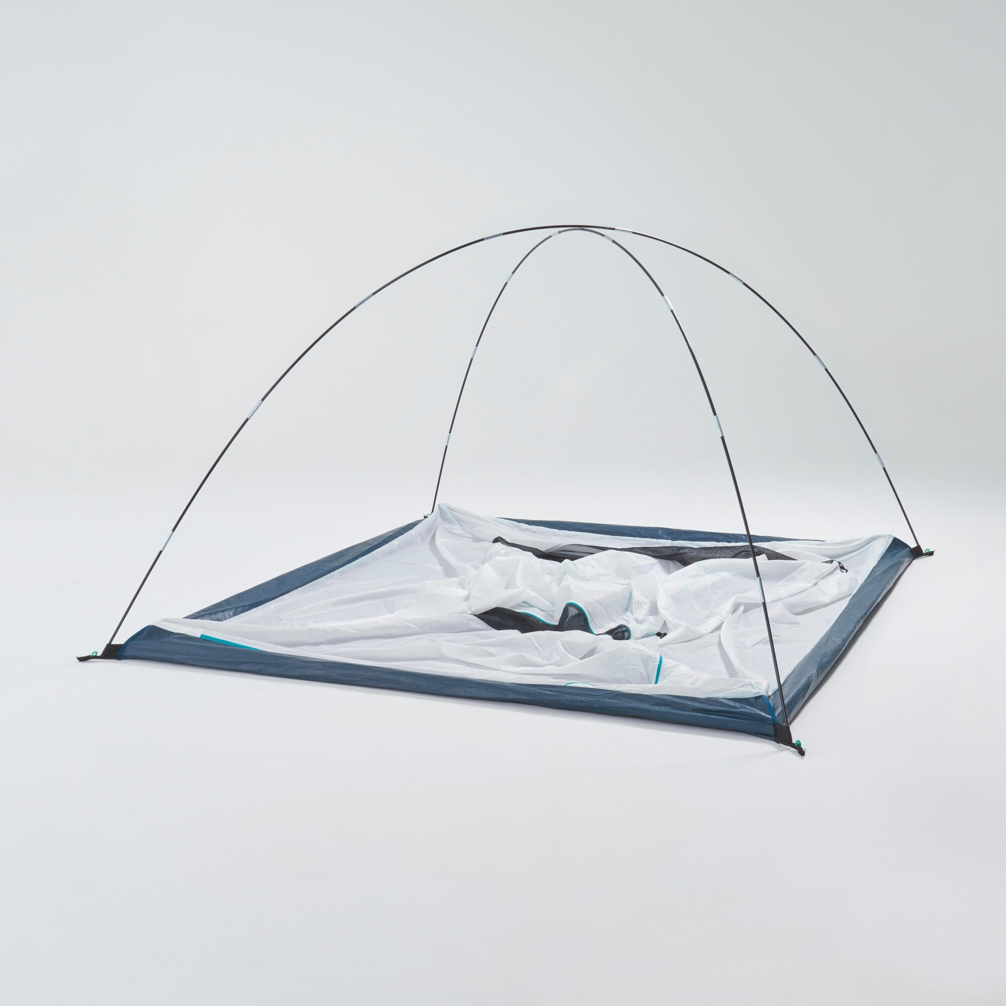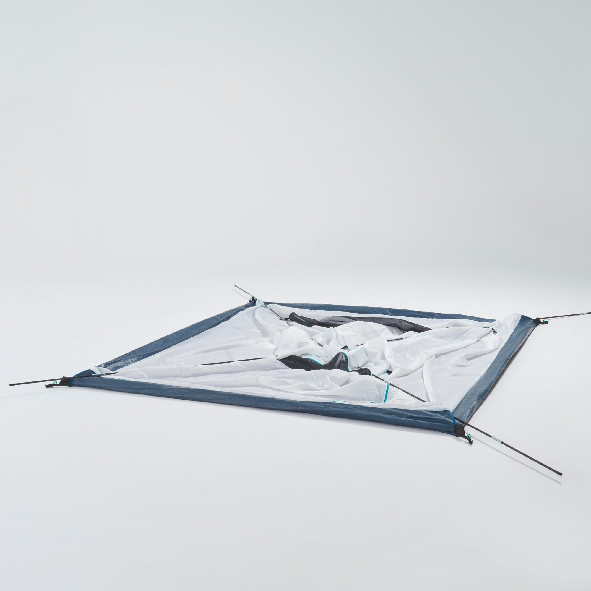 Total weight: 7.5 lbs. We recommend it for short trip backpacking or car-camping. Living space dimensions: 82.7″ x 76.8″. Living space height of 49.2″. 1 bedroom compartment – 1 waterproof flysheet – 2 poles – 8 pegs – 4 guy ropes – 1 bag Free-standing structure. Simple to pitch with poles. The bedroom is pitched with poles, and the flysheet is then fastened on top. Reverse procedure when dismantling. If it is too windy, we advise to attach the guy ropes that are provided in the tent bag. Flysheet and ventilation at the back. This tent is not equipped with Fresh technology. The flysheet fabric has UPF 30 sun protection. Be very careful as large amounts of UV rays can get in through a simple open door. 1 upper rear air vent. Correctly position the lateral tent pegs to maintain a space between the flysheet and the ground all around the tent. The good air circulation between the bedroom and the flysheet will limit the amount of condensation. Our tent has been tested in a Tropical rain laboratory to withstand 200 mm of water per hour per m². We test all our tents in a wind tunnel on a turntable. The goal is to expose each side of our tent to the same wind intensity. Properly pitched, with the guy ropes deployed, this tent remains habitable in wind speed 5, measured at 25 mph.