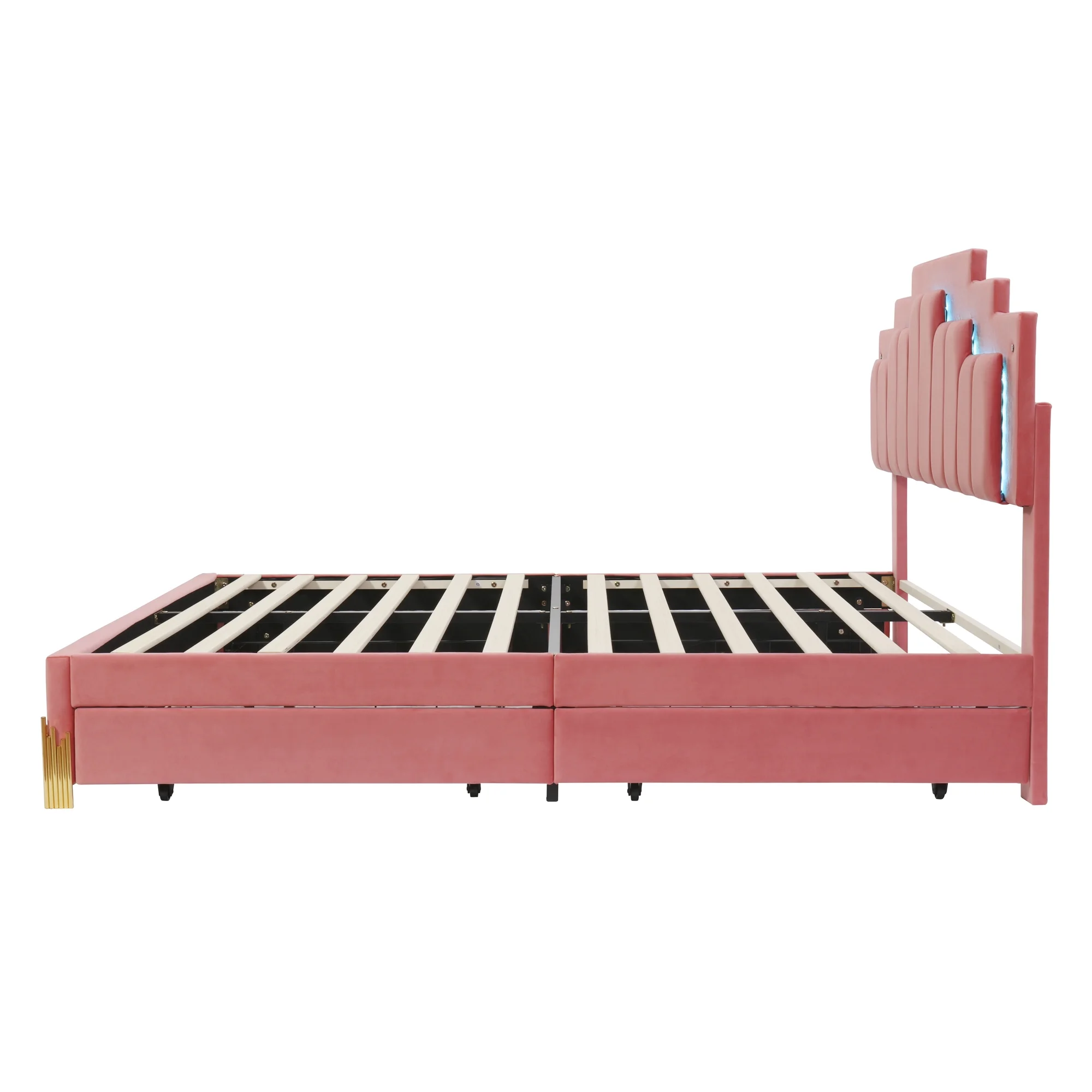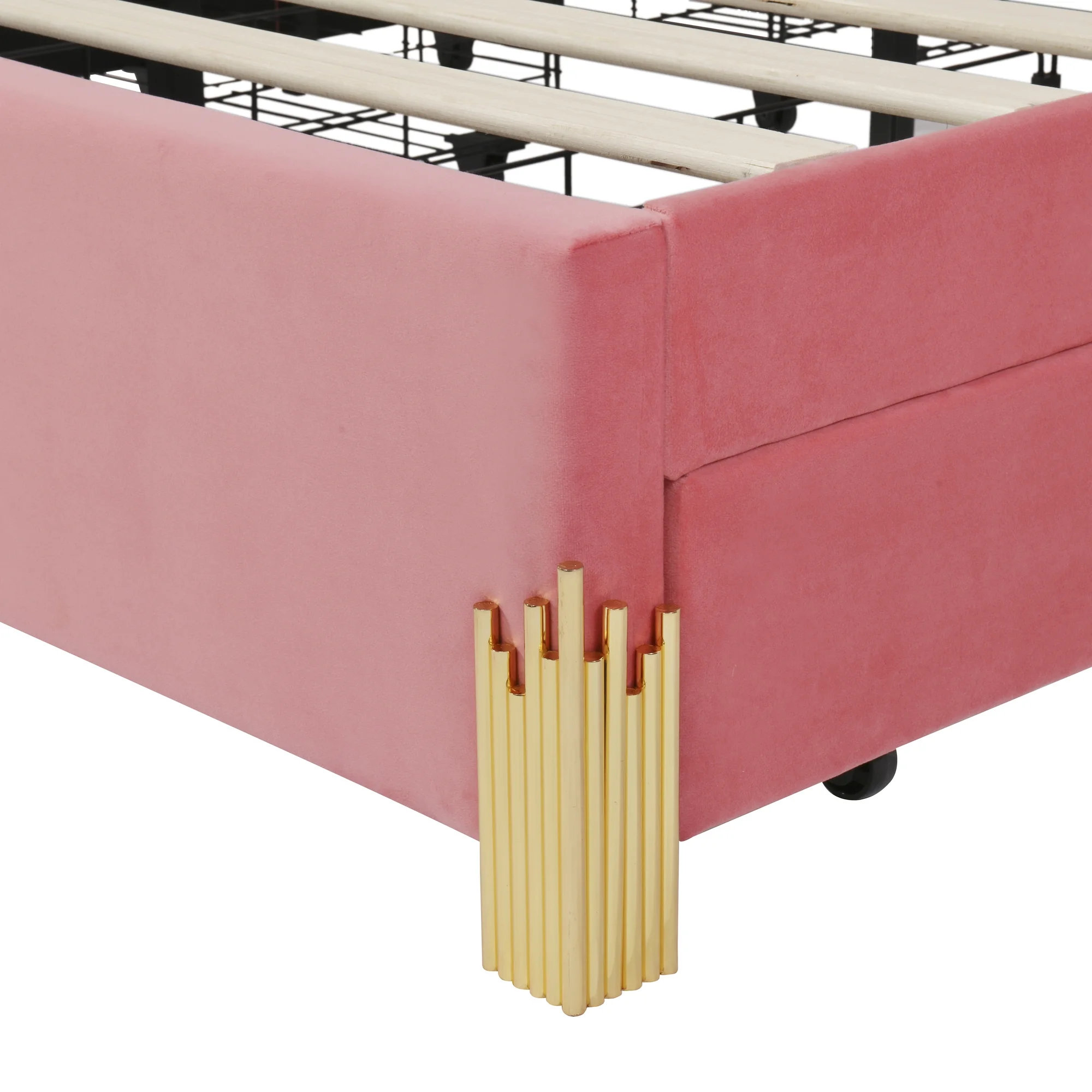 Embossed with atypical stripes and the stylish irregular metal bed legs, this platform bed brings artistic atmosphere to your home. The design is full of fun and can make you feel easy and comfortable.This bed provides a fun and adorable place for you to enjoy yourselves.This asymmetrical bed headboard design acts as an eye-catching focal point. Light strip creates a romantic atmosphere. This bed comes with 4 big drawers perfect for organizing anything from clothes and bed linens to toys and games. Such a versatile piece, bringing functionality, versatility, and style to your home, perfect for those who have lots of visitors. Specifications Product Type:Upholstered Platform Bed Size:Queen Color:Beige/Gray/Pink Material:Plywood+MDF+Velvet The number of slats:12pcs Assembly Required:Yes Weight & Dimensions Overall Product Dimension:81.1″L x 61″W x 44.9″H Number of Package:1 Overall Product Weight:105.82 LBS Weight Capacity:660lbs Recommended Mattress Thickness:6″