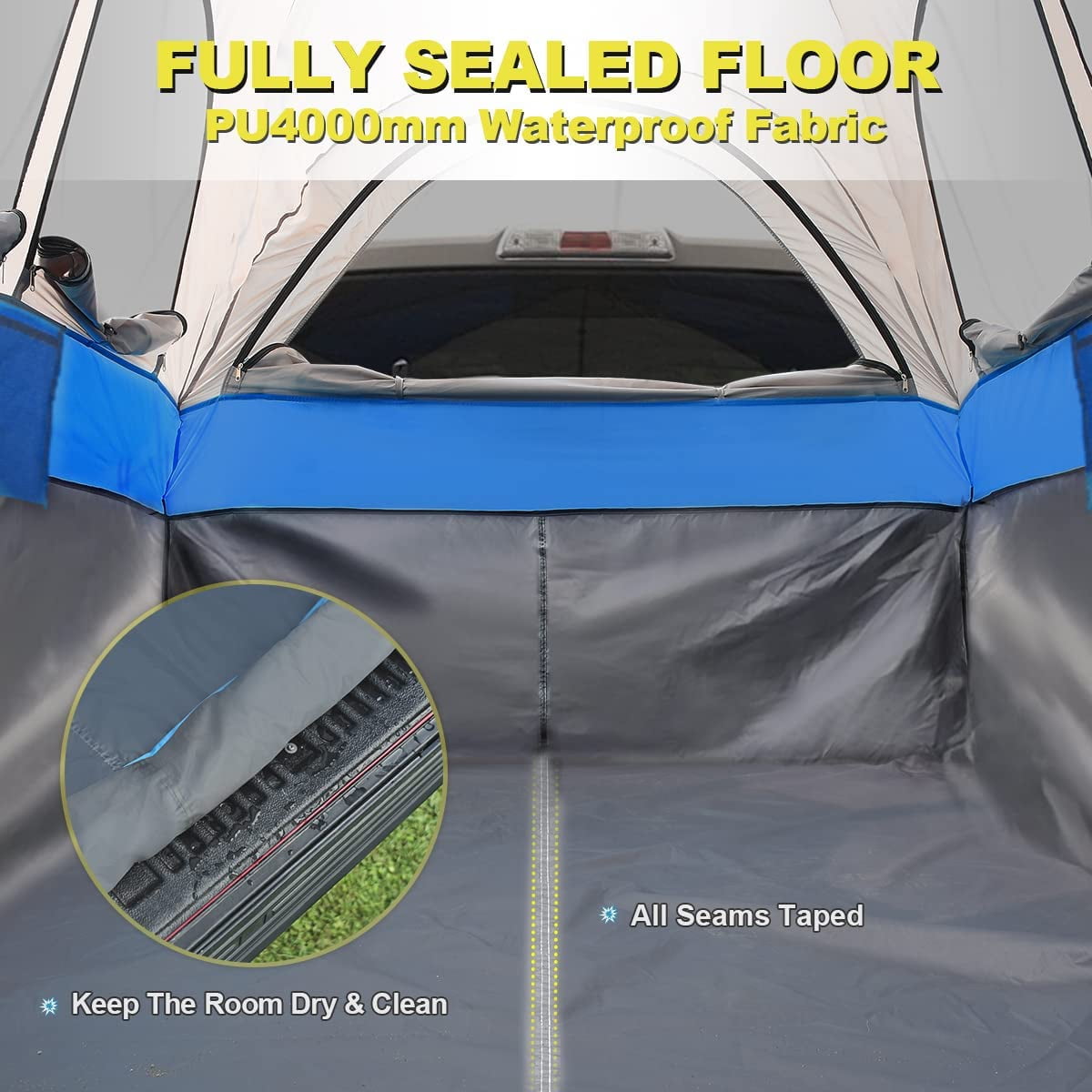 ✅【LARGE SPACE – 65” width for 2 persons, 63” headroom makes staying inside more. 75” length fits all 5.5′ -5.8′ truck beds, Please measure your Truck bed first. ✅【EXPANDABLE AWNING】► 48” (L) x 48”(W) Extra large awning can be used to shade or keep out the rain, easy fishing, and shoes. Can be stored on the door when not used. ✅【WEATHERPROOF STRUCTURE】► This pickup bed tent is constructed of water-resistant fabric with tape-sealed seams (PU 2000mm), which can keep your car clean and dry.Quick build or remove in 5 minutes.PU 4000mm Fully sealed floor, keep the room clean and dry so that you have a comfortable sleep. ✅【QUICK & EASY ASSEMBLE】► Truck bed tents for camping include easy-to-use poles and pole pockets, allowing you to locate the pole quickly. Quick build or remove in 5 minutes. ✅【2 YEARS WARRANTY】► Our customer service team is skillfully trained to help you with any questions or concerns. we will provide timely and effective help and 2 years of parts replacement service. You can download our latest version of the manual in product guides and documents.