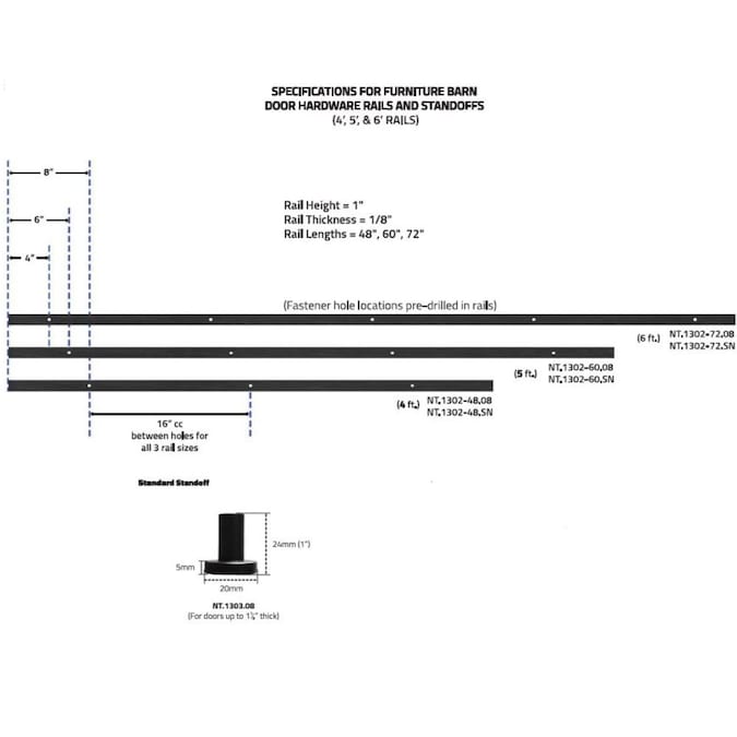 - Rails have 16 in. hole spacing