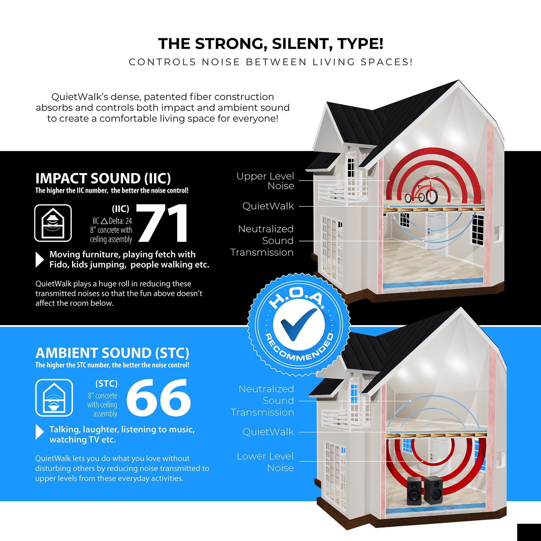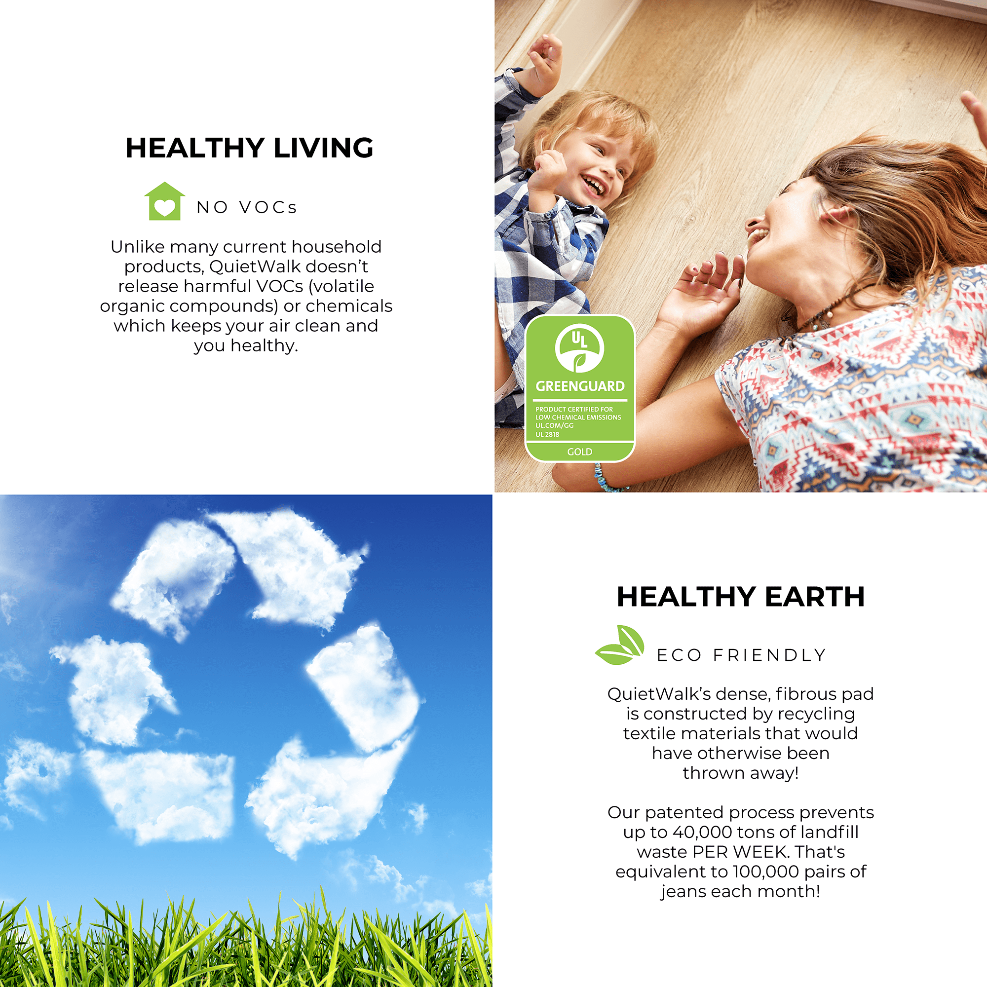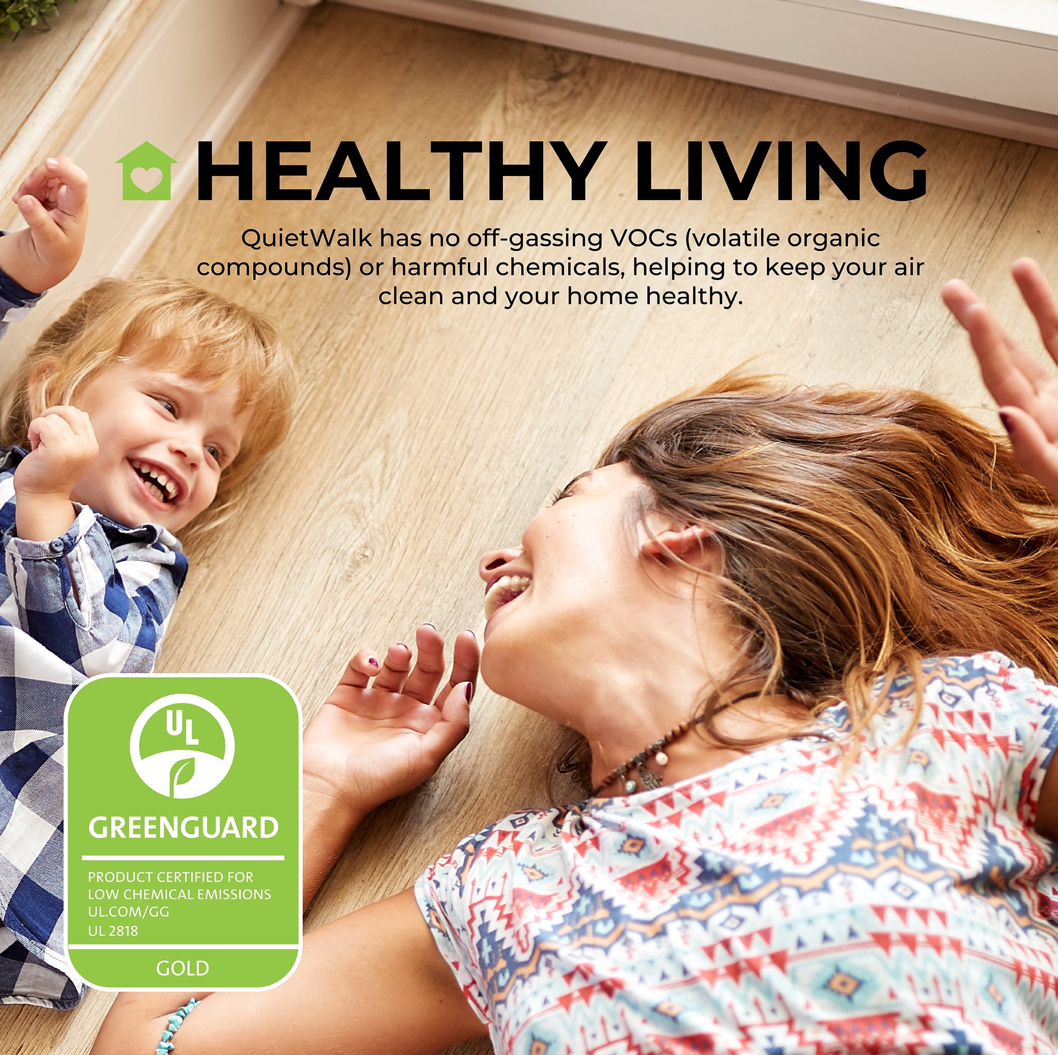 Protect your floors and reduce noise with QuietWalk Acoustical Underlayment. Designed for laminate, engineered wood, bamboo, and WPC (5mm+), it features DriWick™ moisture-wicking technology and a built-in vapor barrier for superior floor protection. Made from recycled fibers, it absorbs sound and enhances comfort. Approved for in-floor heating and VOC-free for clean indoor air.