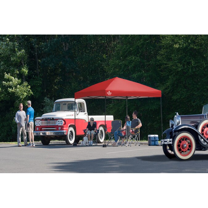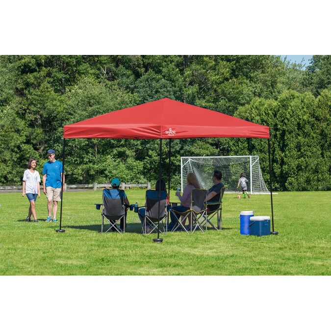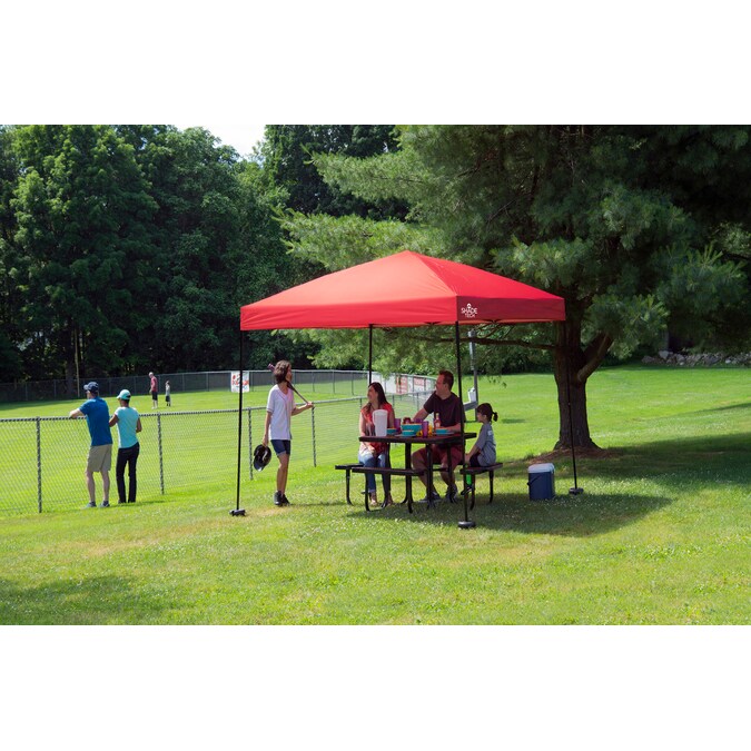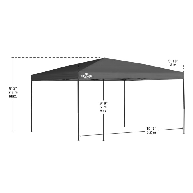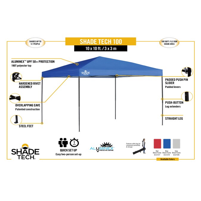 The Shade Tech ST100 10 x 10-ft straight leg instant canopy provides instant shade and shelter wherever you need it. Simple to set up and quickly folds into an easily transported compact shape. Designed for the outdoors, this canopy gives immediate shade wherever you need it in less than a minute without the need for any tools. The canopy top provides a total of 100-sq ft of shade comfortably for 8 to 12 people. Take it anywhere in the durable, polyester roller bag for all your outdoor events. Items pictured in and around shelter are not included.