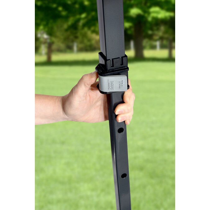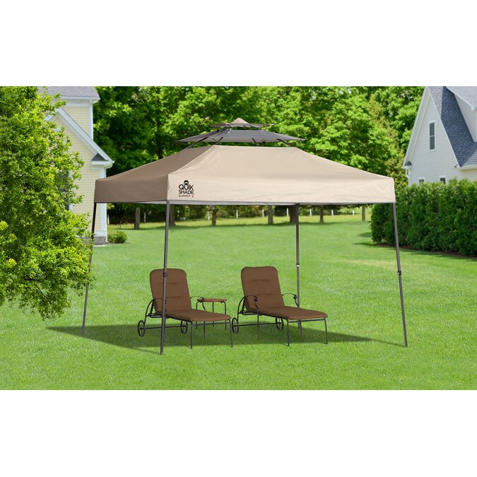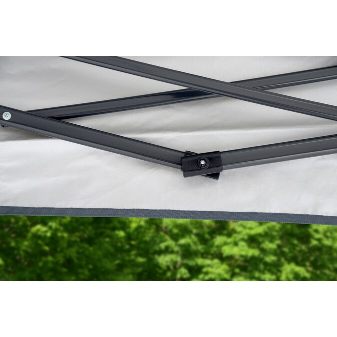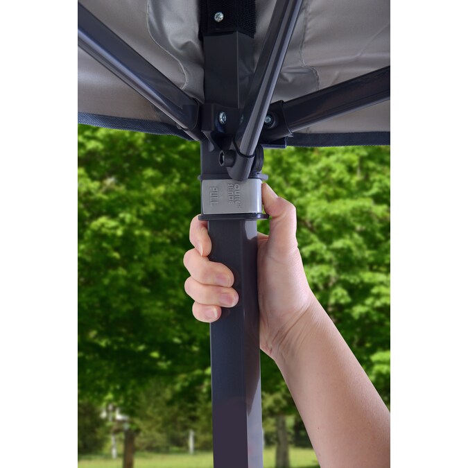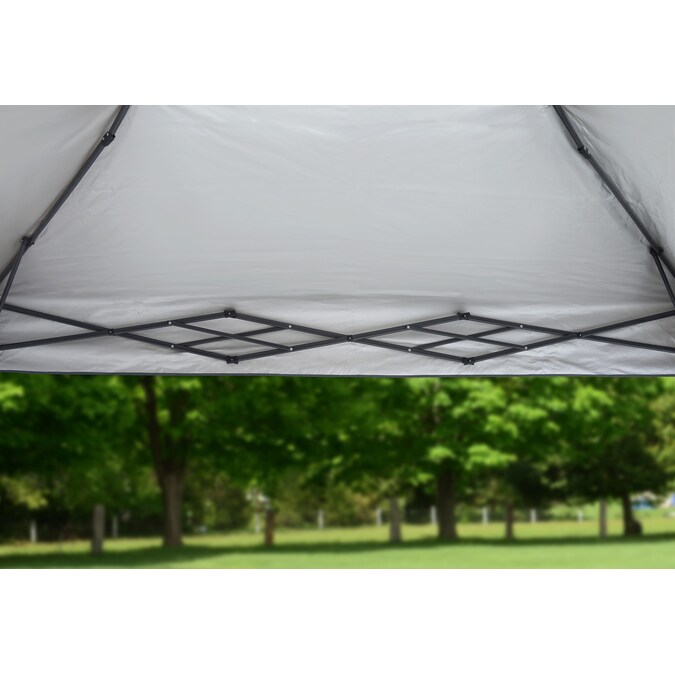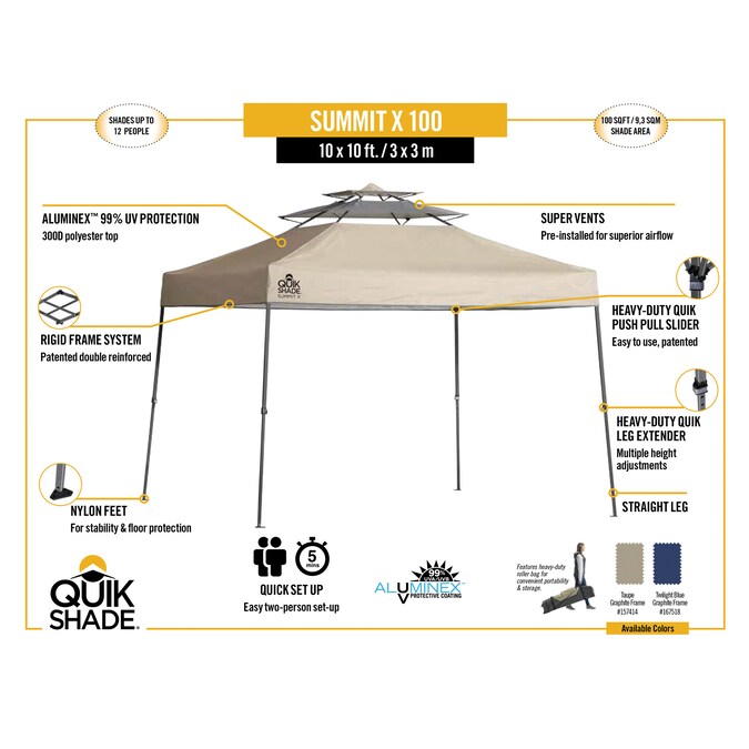 The Summit X SX100 10 x 10-ft straight leg instant canopy is the top choice for reliable shade where you need it. Smart shade for the great outdoors, pre-installed super vents pull hot air out from the canopy top. The canopy can be easily be set up in less than a minute without any tools and provides 100-sq ft of shade, enough for 8 to 12 people. Quik release pull pins for 3 height adjustments, and micro-glide Teflon bearings make it easy to move the canopy up and down. Folds down to fit in the durable, polyester roller bag for convenient portability and storage. Items pictured in and around shelter are not included.