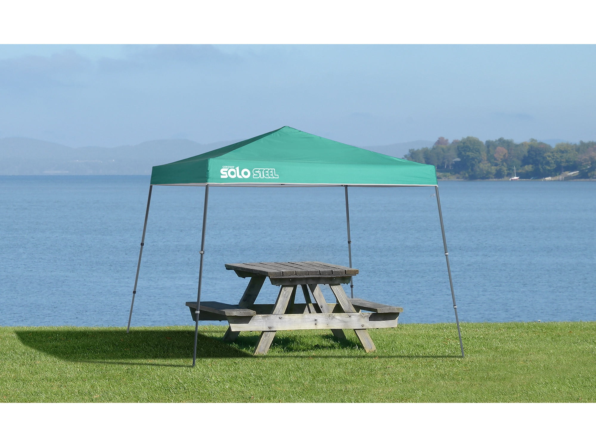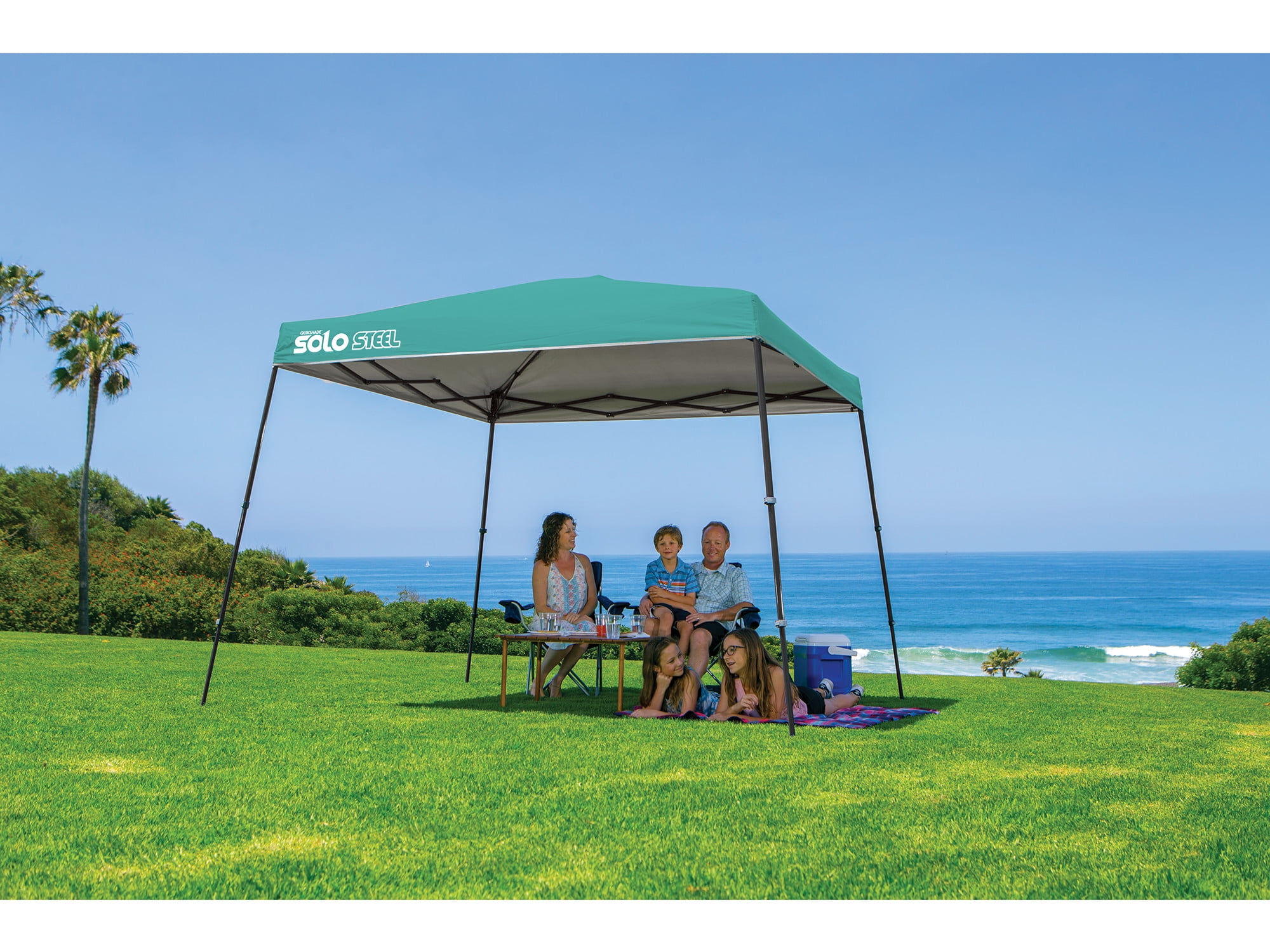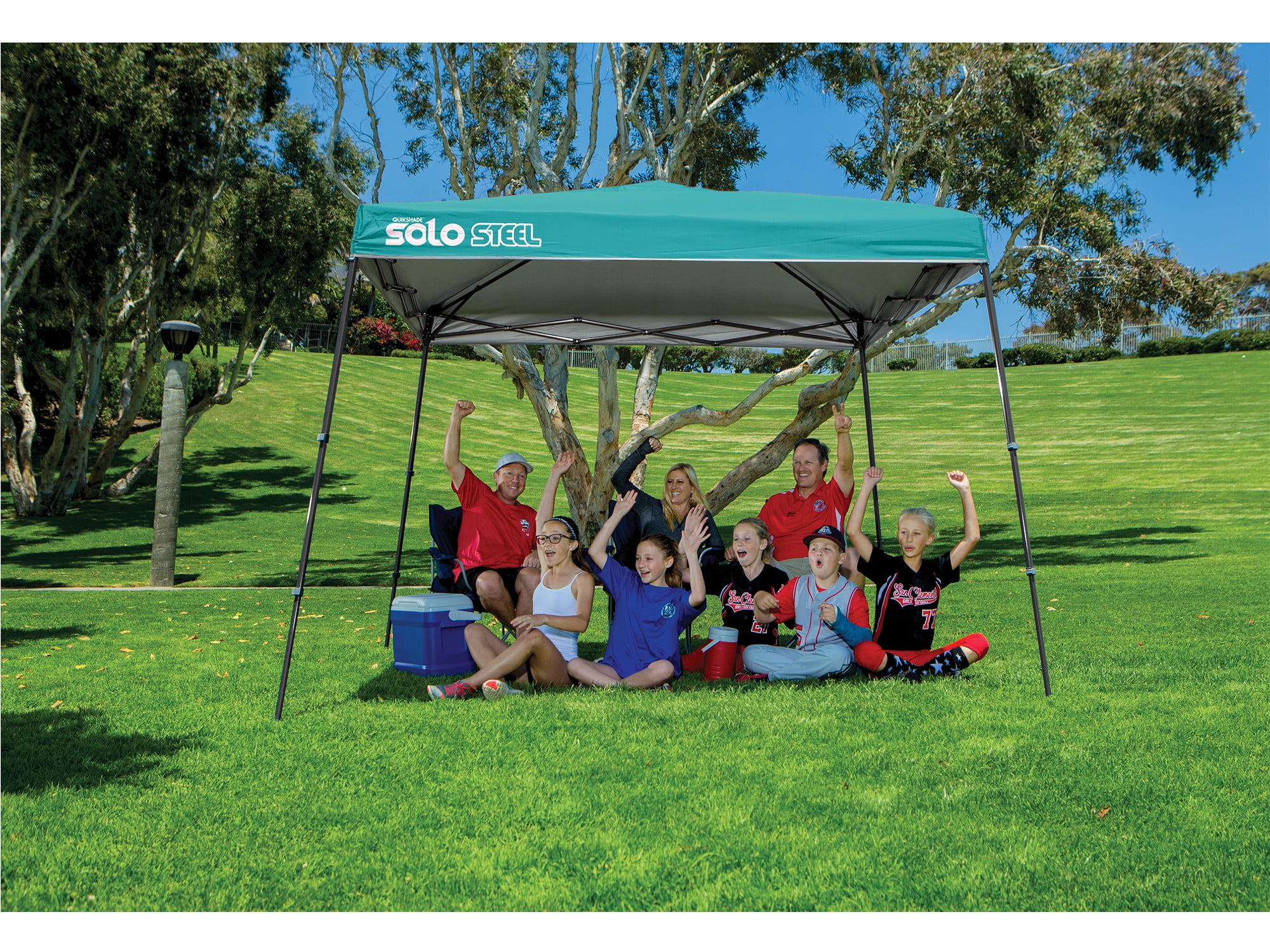 New Quik Shade Solo Steel 72 Sq.Ft. 11 x 11 ft. Slant Leg Canopy in Turquoise Quik Shade’s Solo Steel 72 Canopy is an attractive slant leg canopy that shades up to 6 to 7 people and provides up to 72 sq. ft. of shade. This top of the line, high quality pop-up canopy is portable and made from durable and top quality materials. With infinite height positions, you’ll choose the canopy height that fits your needs. Easy one person assembly! Features Extra strong trapezoidal legs 3-piece telescoping legs offer infinite height options Intuitive cam lock levers for ease of use 150D polyester top with 300D ripstop for a durable fabric cover Nylon feet for stability and floor protection Micro glide Teflon bearings 4 ground stakes for each leg for adequate anchoring Quick and easy one-person setup Features an easy to carry travel bag