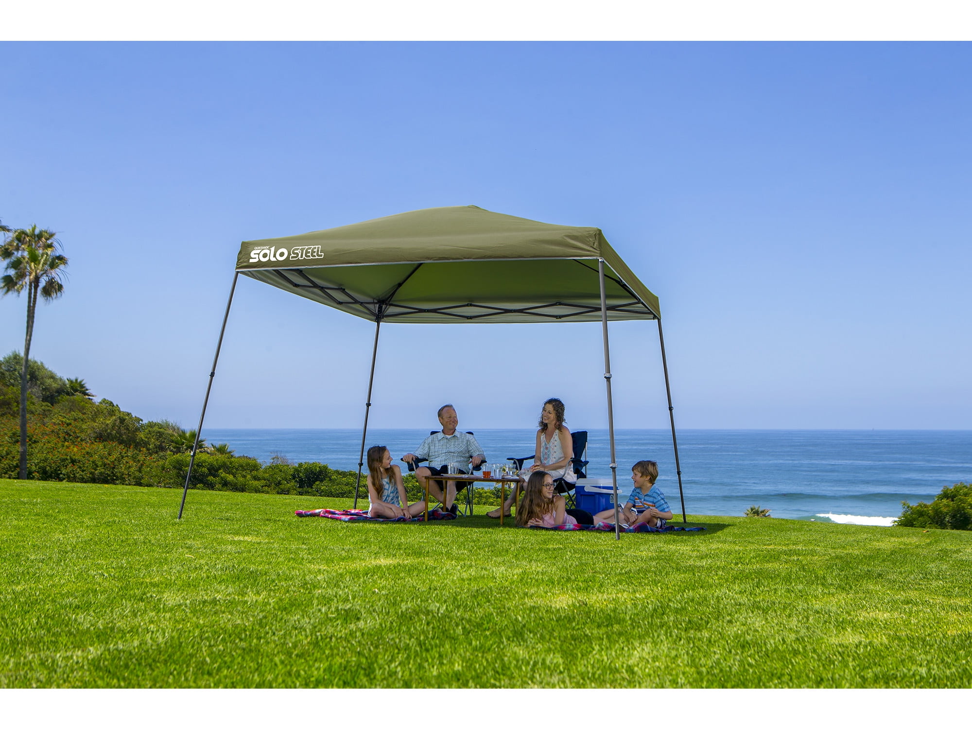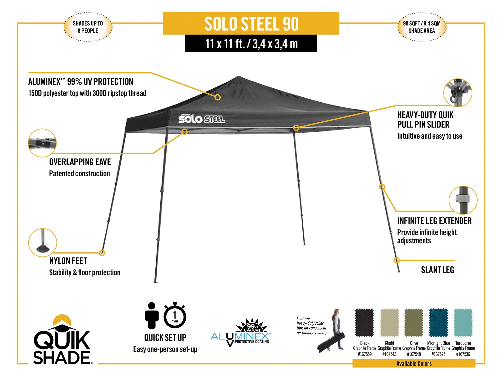 Quik Shade’s Solo Steel 90 Canopy is an attractive slant leg canopy that shades up to 8 people and provides up to 90 sq. ft. of shade. This top of the line, high quality pop-up canopy is portable and made from durable and top quality materials. With infinite height positions, you’ll choose the canopy height that fits your needs. Easy one person assembly! Features Water-Resistant SOLO90 Slant Leg CanopySpecifications Style: Pent Material: Polyester 150 Denier Frame Color: Gray Color: Olive Size: 11 x 11 ft. Rib Tubing Diameter: 1.24 in. Total Storage Area: 136.11 sq. ft. Total Storage Volume: 812.72 cu. ft. Assembly Required: Yes Wall Height: 83 in. Weight: 32 lbs – SKU: SHLTL1720