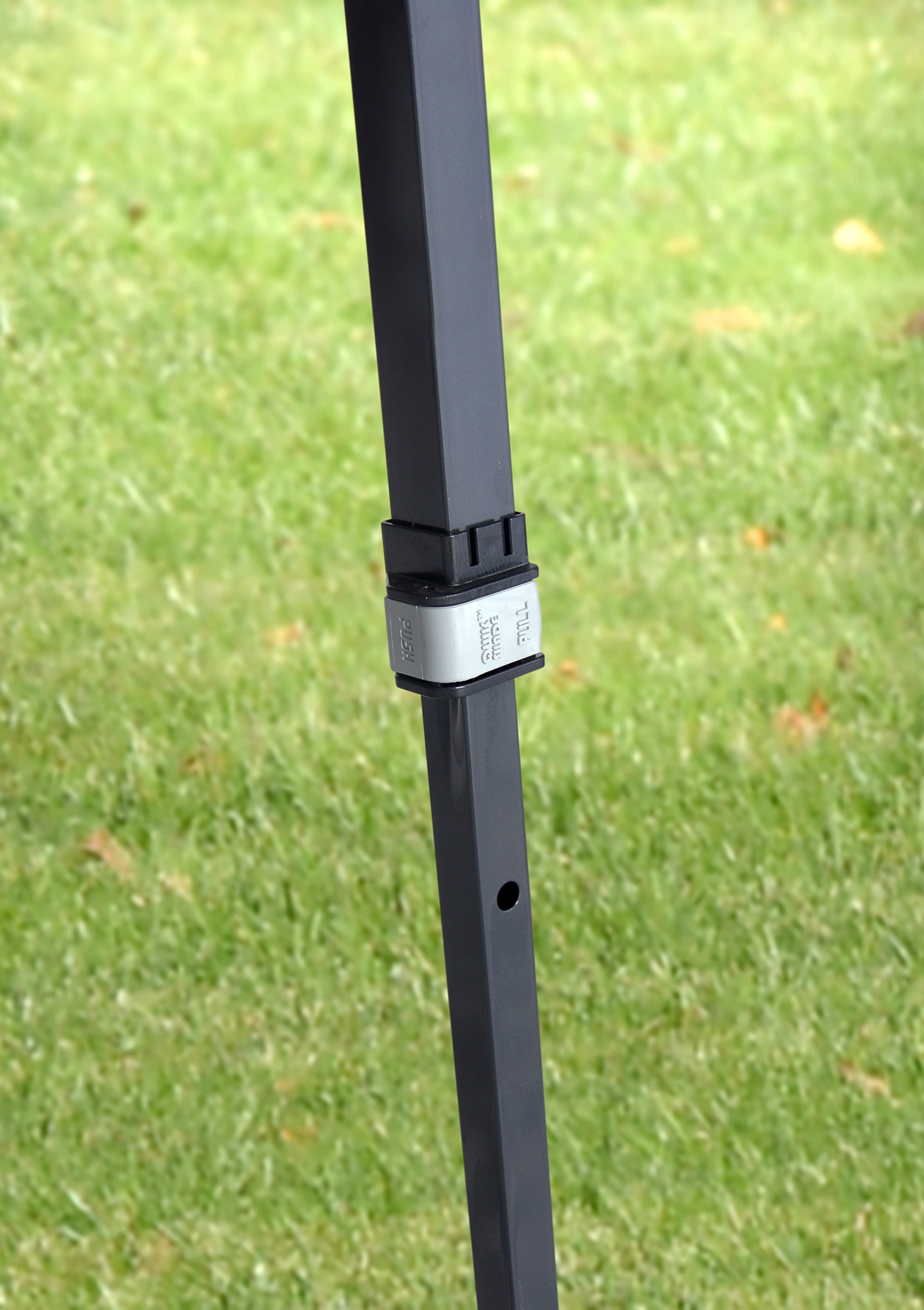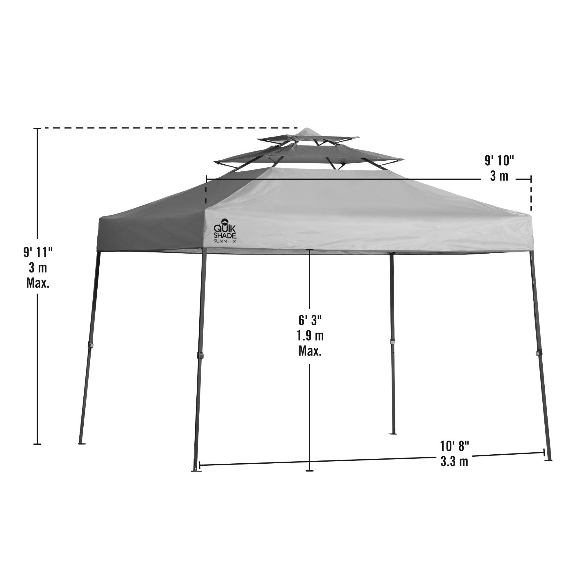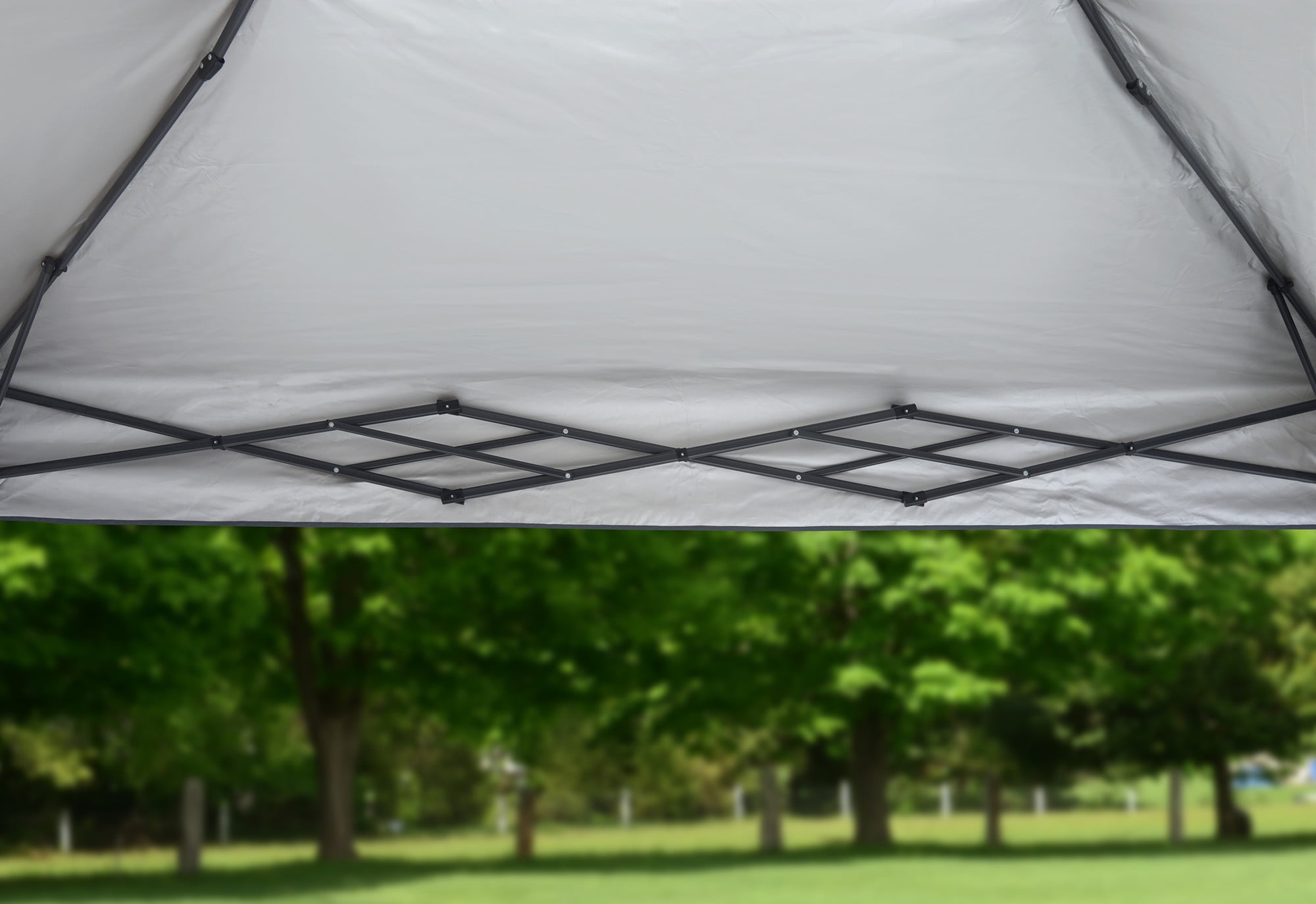 10 ft. x 10 ft. fully assembled straight leg instant canopy provides 100 sq. ft. of shade for 8-12 people with nylon feet protect patio and deck surfaces Sturdy, lightweight construction with a corrosion resistant powder-coated steel, one-piece frame for long-lasting durability 10 ft. x 10 ft. Super Vent canopy top made with 300D polyester fabric with Aluminex-backed top ensures 99% UV protection, water resistance, and cooler shade area Extra large push/pull latch sliders and leg extenders offer 3 height adjustments and allow for peak height of 10 ft. and eave clearance of 6 ft. 5 in. Convenient 600D polyester roller bag lets you store and transport anywhere; includes canopy frame, canopy top, and 4 steel stabilizing ground stakes