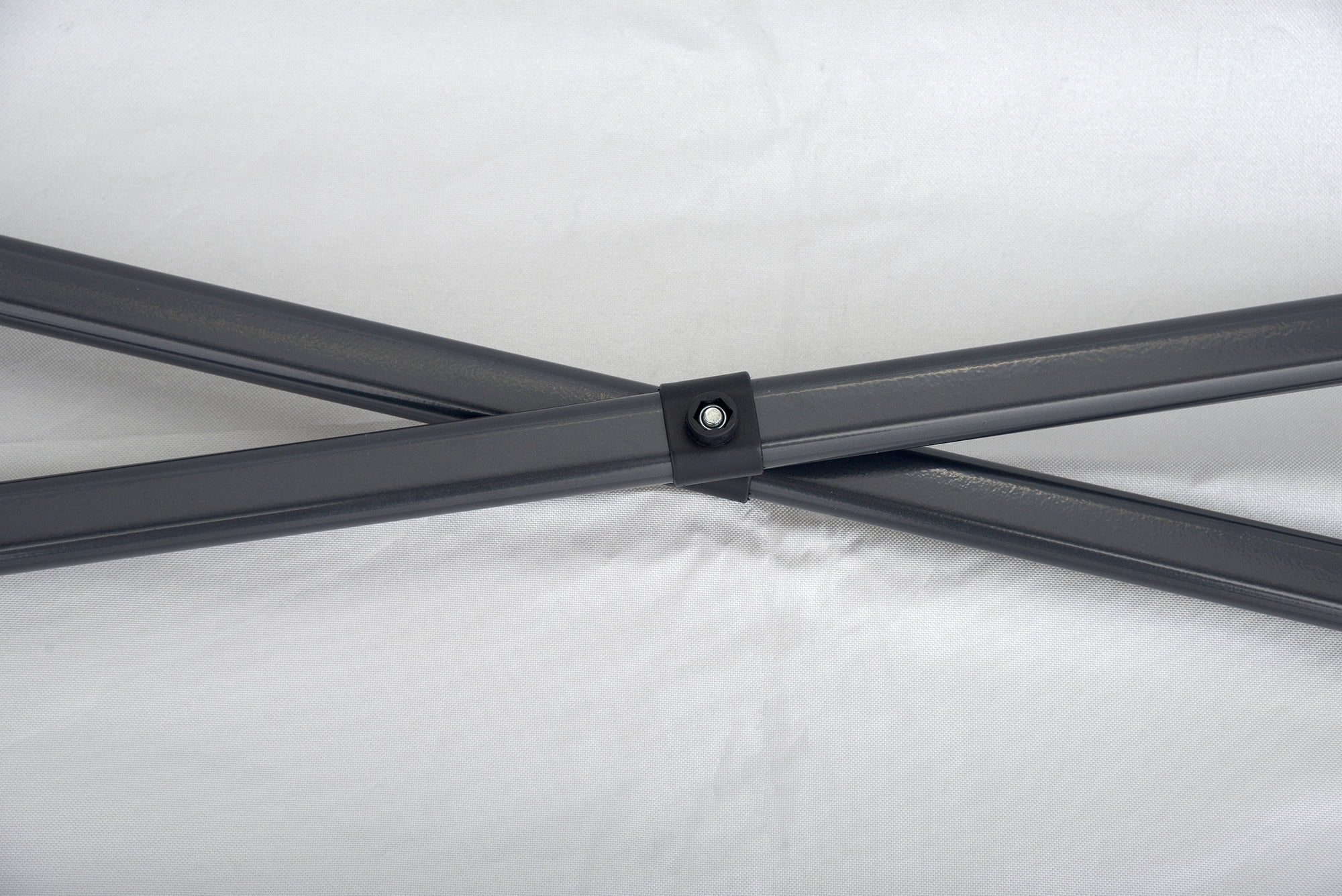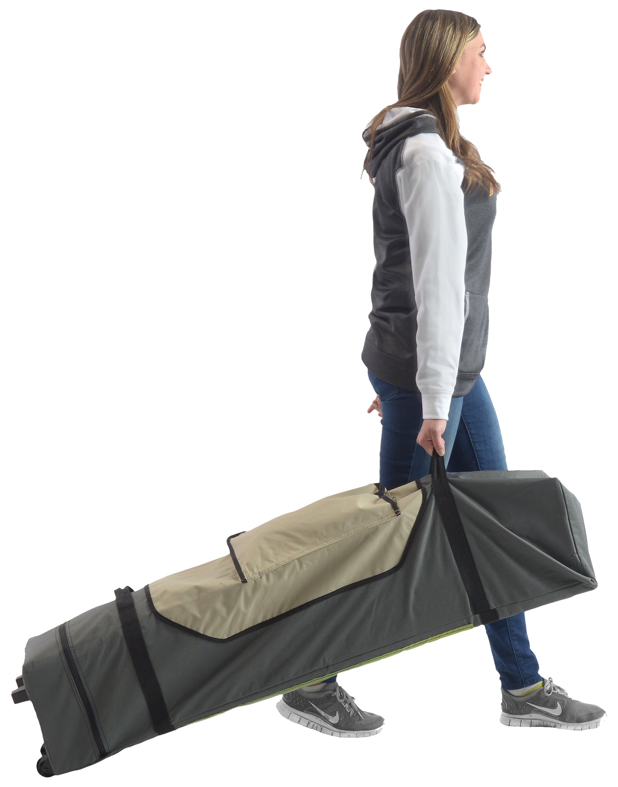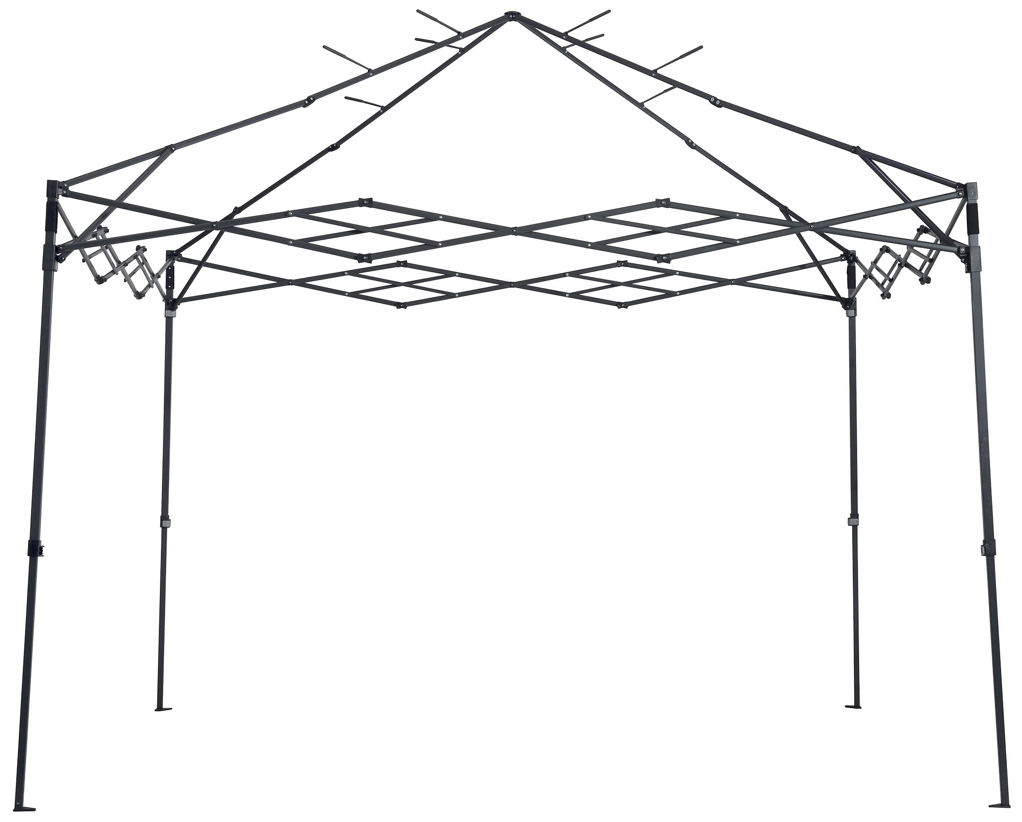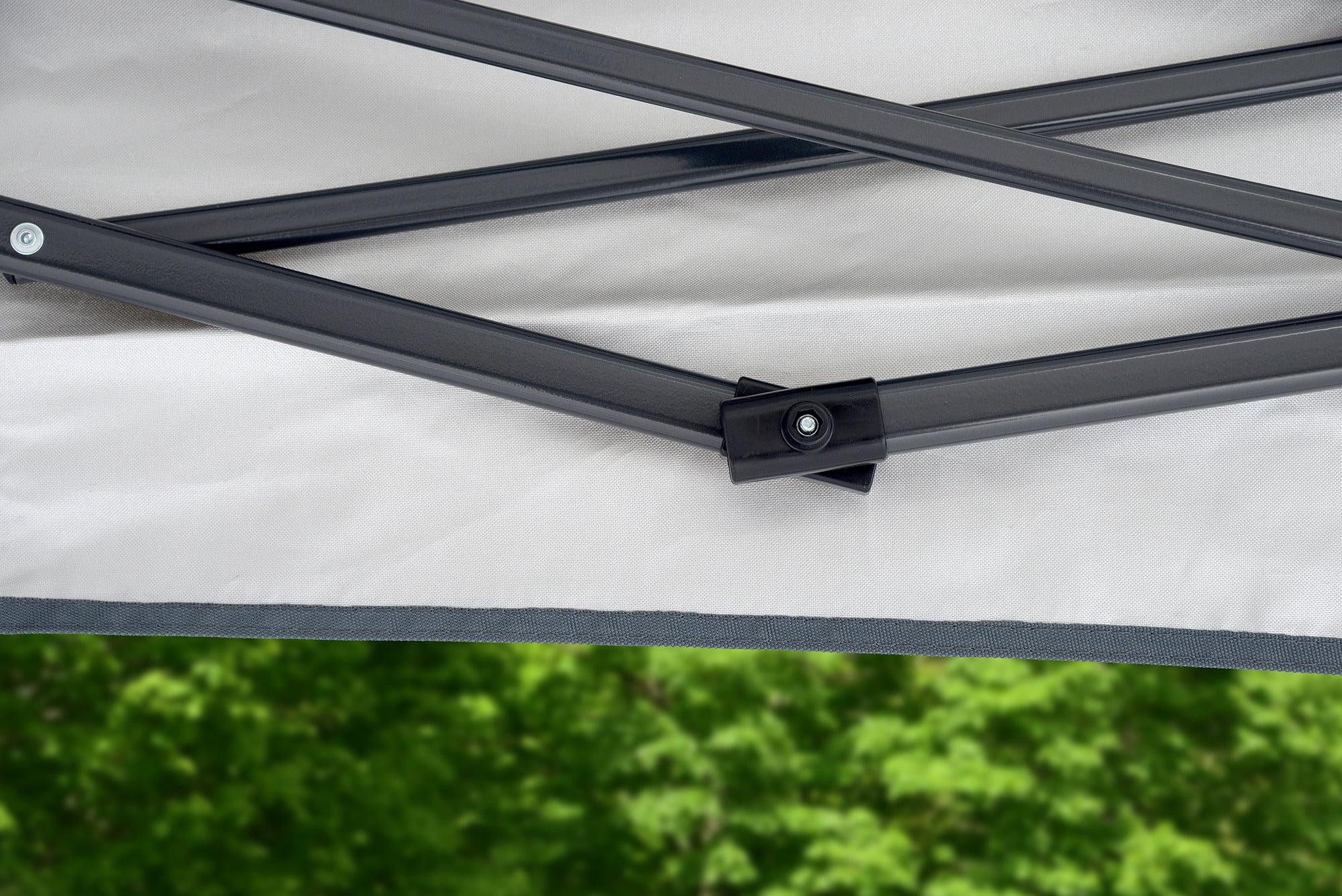 10 ft. x 10 ft. fully assembled straight leg instant canopy provides 100 sq. ft. of shade for 8-12 people with nylon feet protect patio and deck surfaces Sturdy, lightweight construction with a corrosion resistant powder-coated steel, one-piece frame for long-lasting durability 10 ft. x 10 ft. Super Vent canopy top made with 300D polyester fabric with Aluminex-backed top ensures 99% UV protection, water resistance, and cooler shade area Extra large push/pull latch sliders and leg extenders offer 3 height adjustments and allow for peak height of 10 ft. and eave clearance of 6 ft. 5 in. Convenient 600D polyester roller bag lets you store and transport anywhere; includes canopy frame, canopy top, and 4 steel stabilizing ground stakes