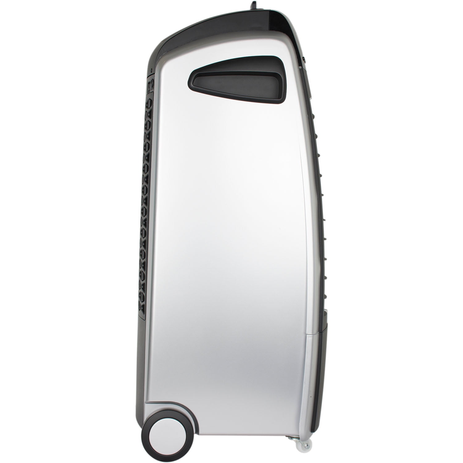 All-in-one unit functions as a fan, evaporative air cooler, and humidifier For indoor use in open environments with adequate cross ventilation up to 130 sq. ft. Best used when the air is hot with low humidity, such as desert areas like the southwestern United States Recommended humidity level is 60% OR LESS for maximum efficiency Quick and easy setup – unpack, add water/ice, plug it in, and use Non-compressor system cools naturally, efficiently and inexpensively Advanced honeycomb irrigation system for optimum evaporative cooling Oscillating louvers distributes cool moist air throughout the room Extreme low power consumption (7.4 watts in QuietSleep mode and 36 watts in Turbo mode) Super quiet operation in QuietSleep mode (24 dBA) is ideal for bedrooms Powerful air flow up to 211 CFM in Turbo mode LED control panel plus remote control for convenient operation 3 speeds plus Auto (low, medium and high) with 7.5-hour off timer Low-energy comfort light for night time use Detachable water tank with “low water” alarm (1.85 gallons / 7 liters tank capacity) Water tank filter helps extend the life of the Honeycomb Cooling Media Ice compartment with innovative fountain design for faster cooling with ice Side handles and four easy rolling wheels allow effortless mobility Universal voltage adapter included – easy to travel, easy to store Buying Note: For those living in more humid climates, consider portable air conditioning units or window air conditioners